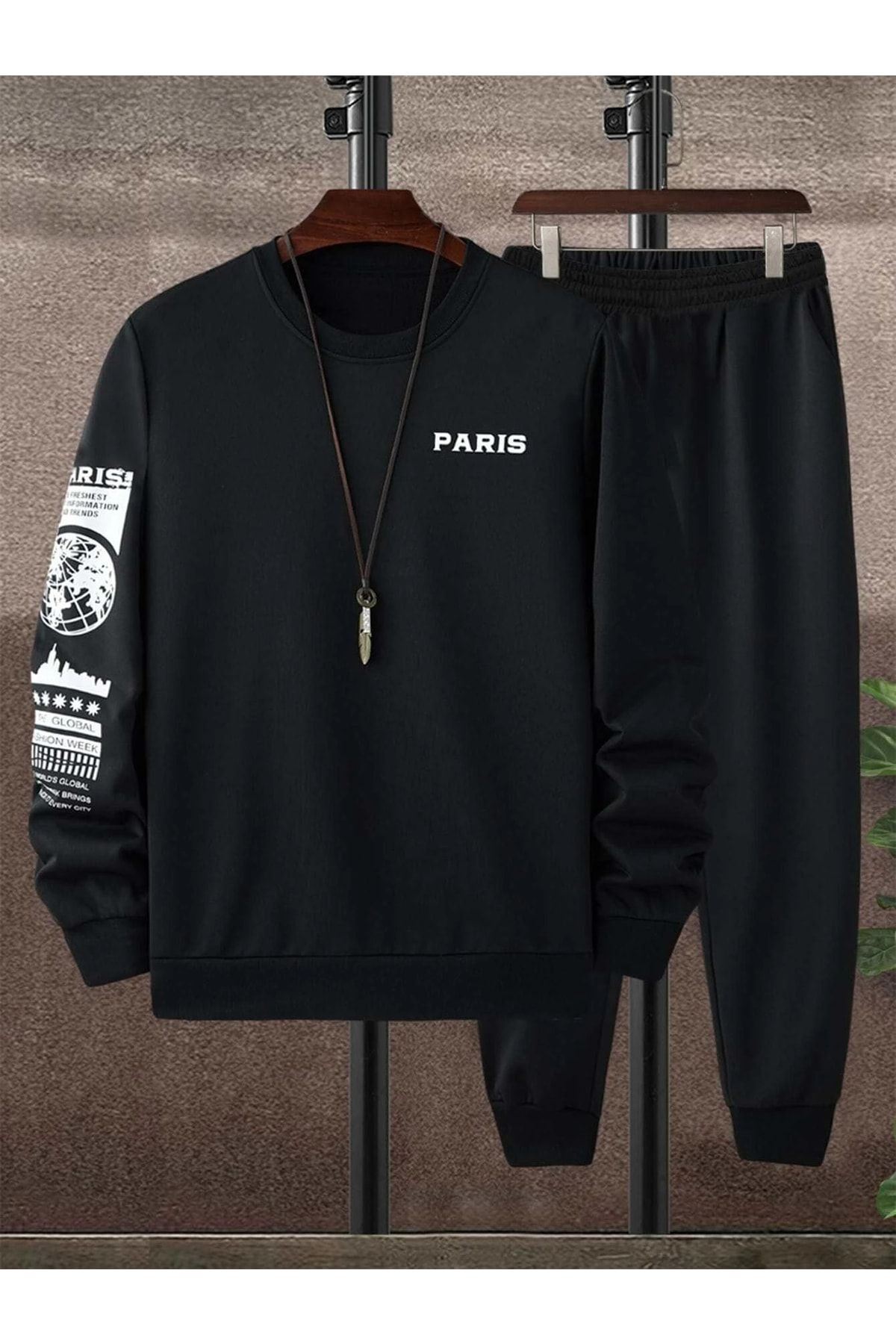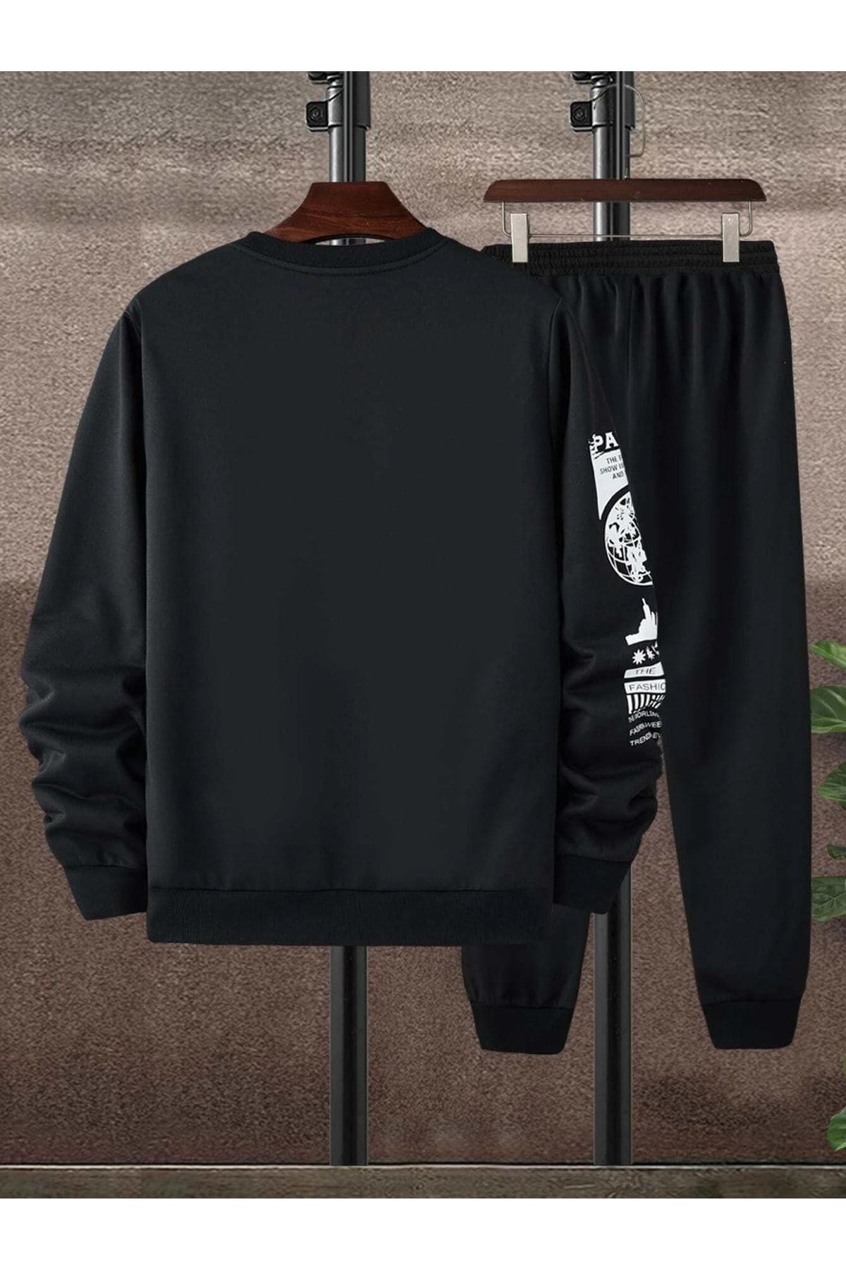 Paris Web Eşofman Takımı Sweatshirt Jogger - Siyah Baskılı Oversize Şardonlu Bisiklet Yaka