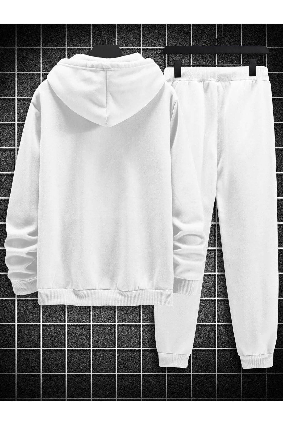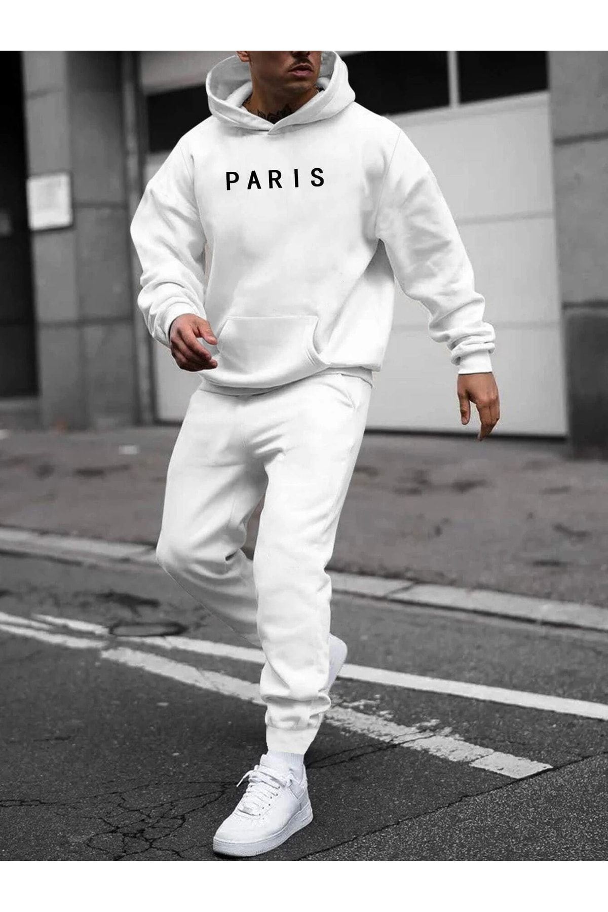 Paris Yazı Eşofman Takımı Sweatshirt Jogger -Beyaz Baskılı Oversize Şardonlu Kapüşonlu