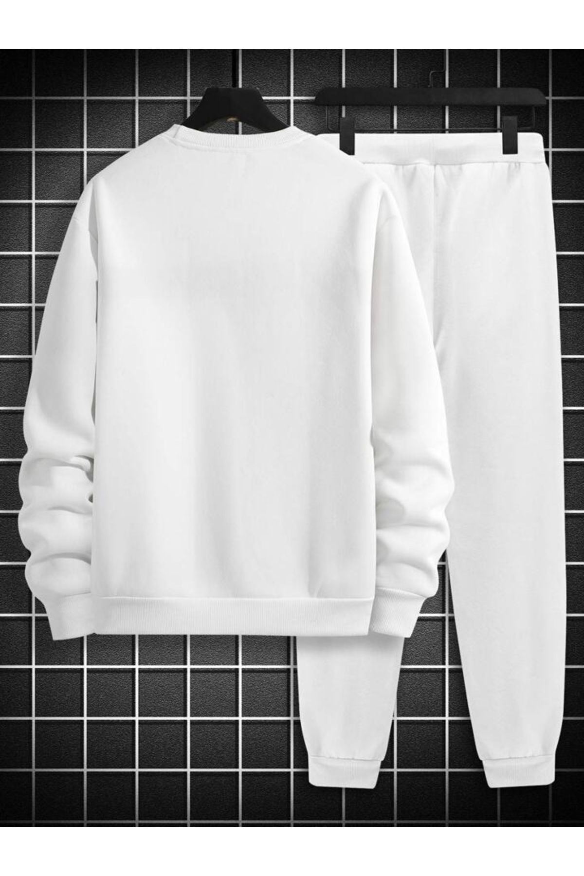 Paris Yazılı Eşofman Takımı Sweatshirt Jogger - Beyaz Baskılı Oversize Şardonlu Bisiklet Yaka