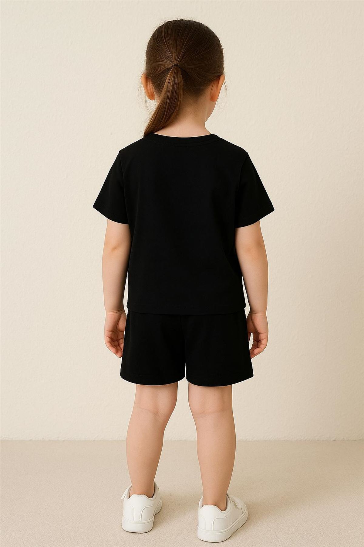 Pembe Bear Ayıcık Kurdela Baskılı Çocuk Takım - Siyah Şort Siyah T-shirt Takım Baskılı Kız Çocuk Ya