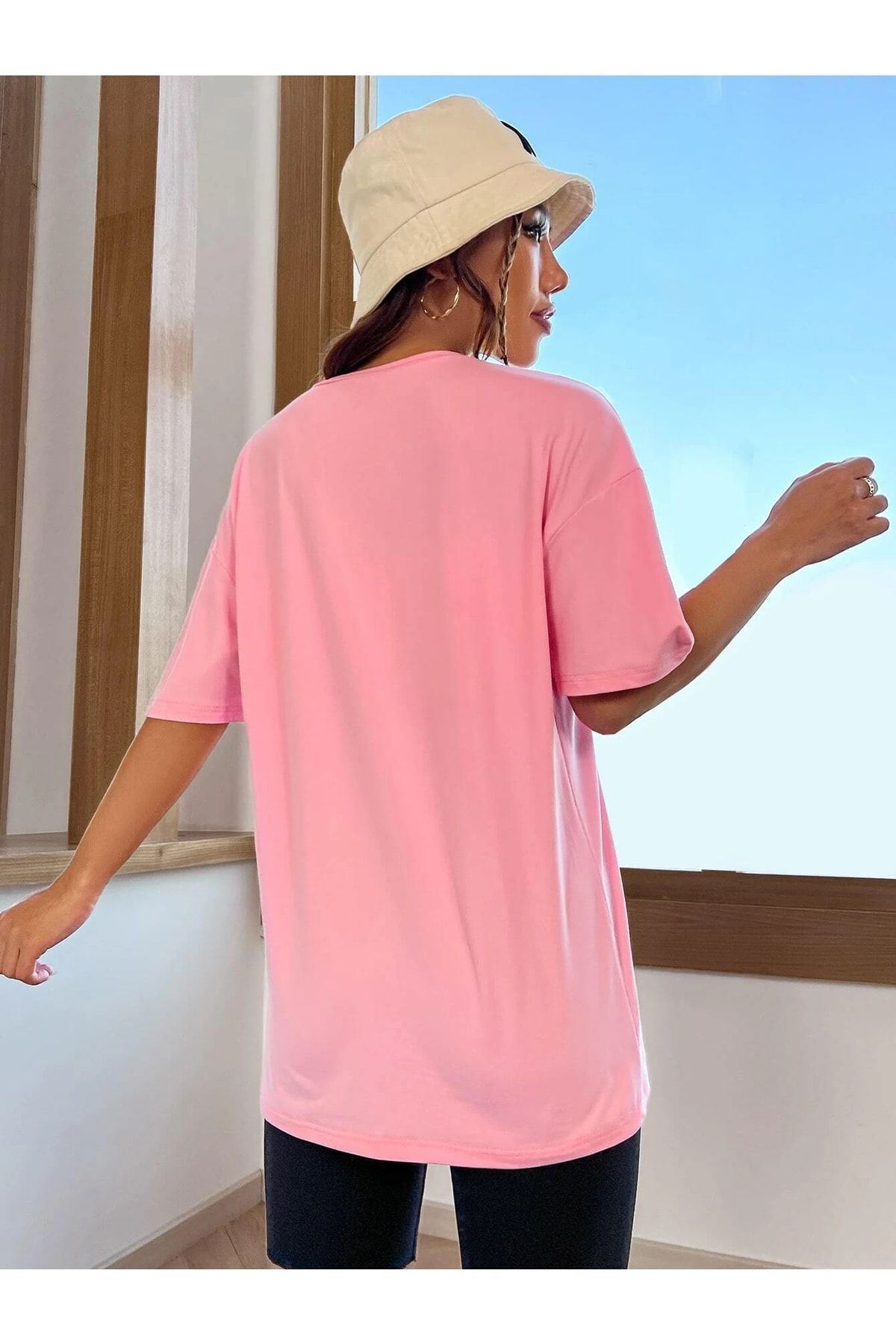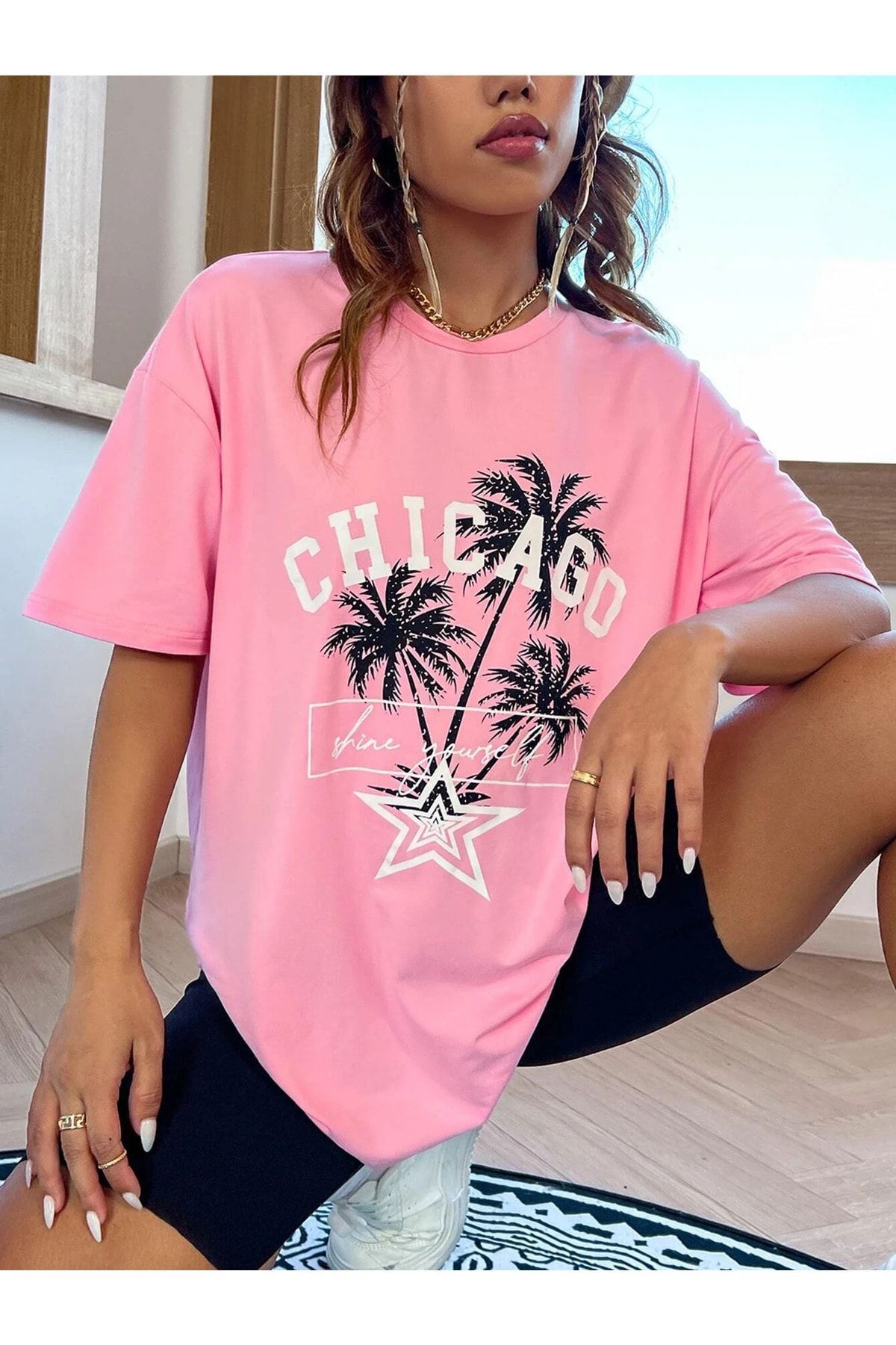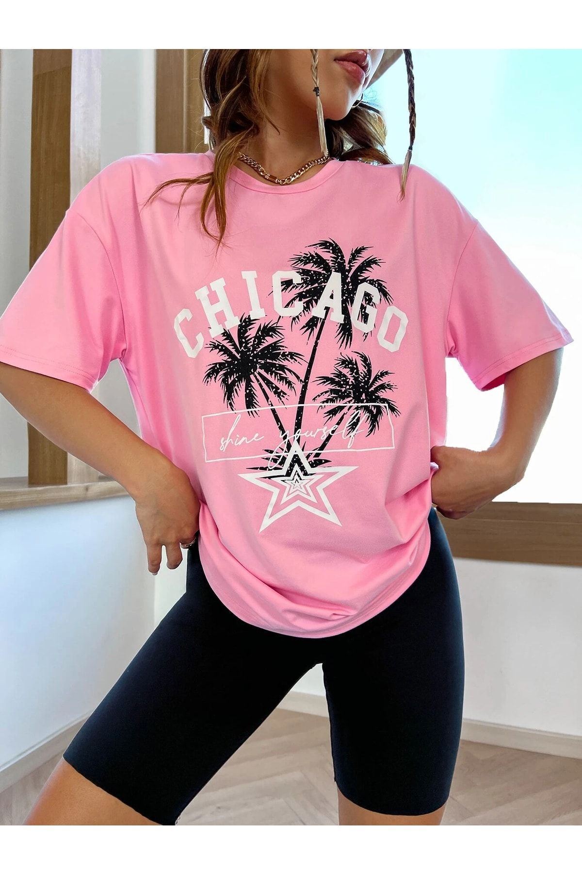 Pembe Oversize Palm Chicgo Baskılı T-shirt - Oversize Baskılı