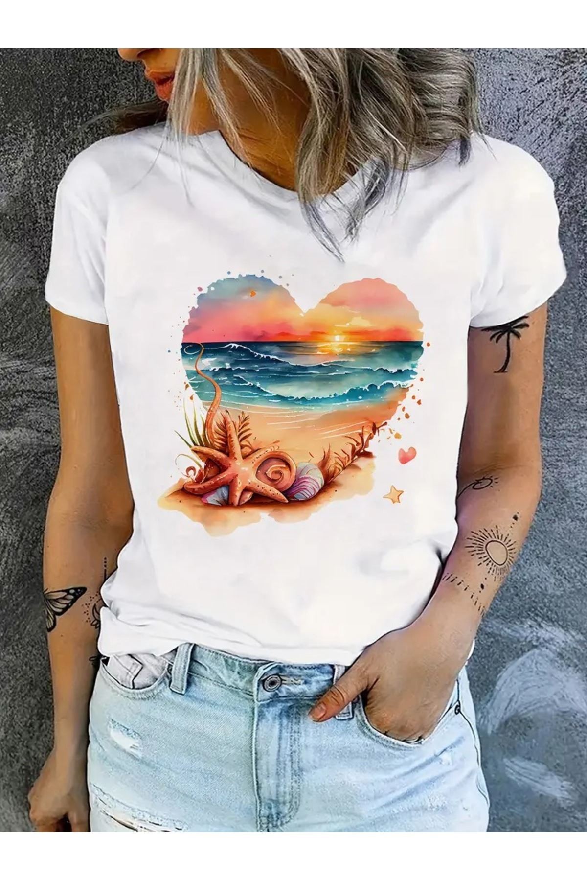 Plaj Kalp Baskılı Beyaz Pamuklu T-Shirt - Oversize Bisiklet Yaka Kısa Kol Tişört