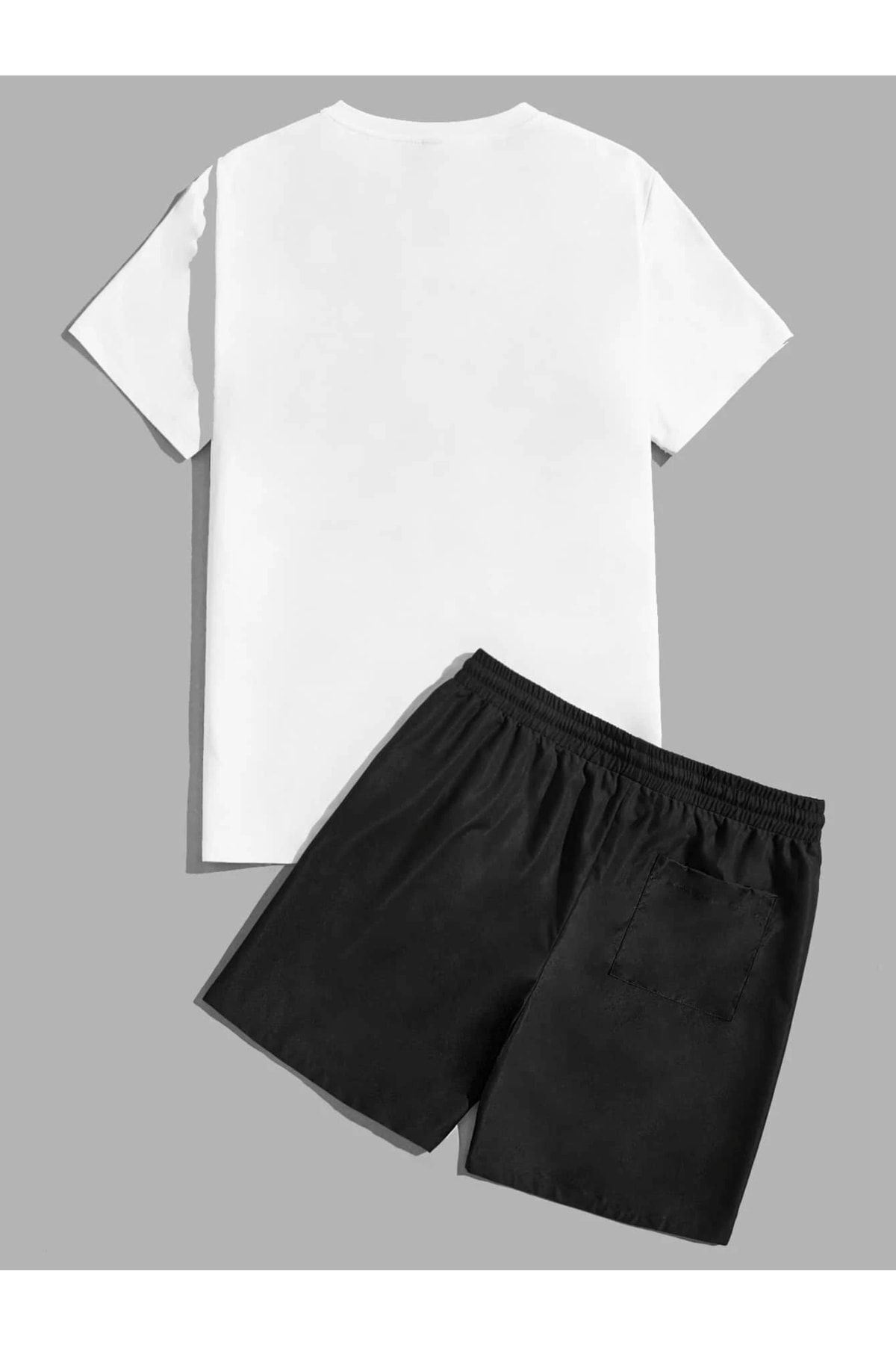 Positive Rose T-shirt Şort - Beyaz Siyah Alt Üst Takım Şort Tişört Kombin Baskılı Bisiklet Yaka