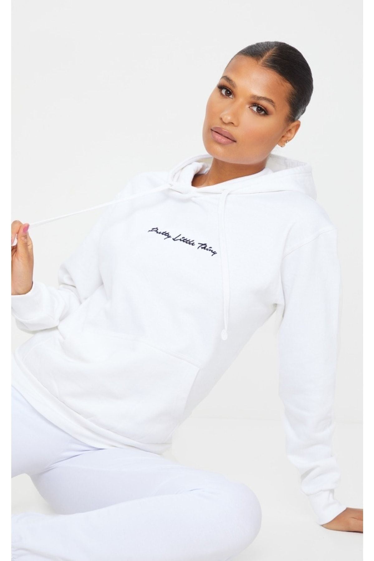 Pretty Eşofman Takımı Sweatshirt Jogger - Beyaz Baskılı Oversize Şardonlu Kapüşonlu Lastik Paça