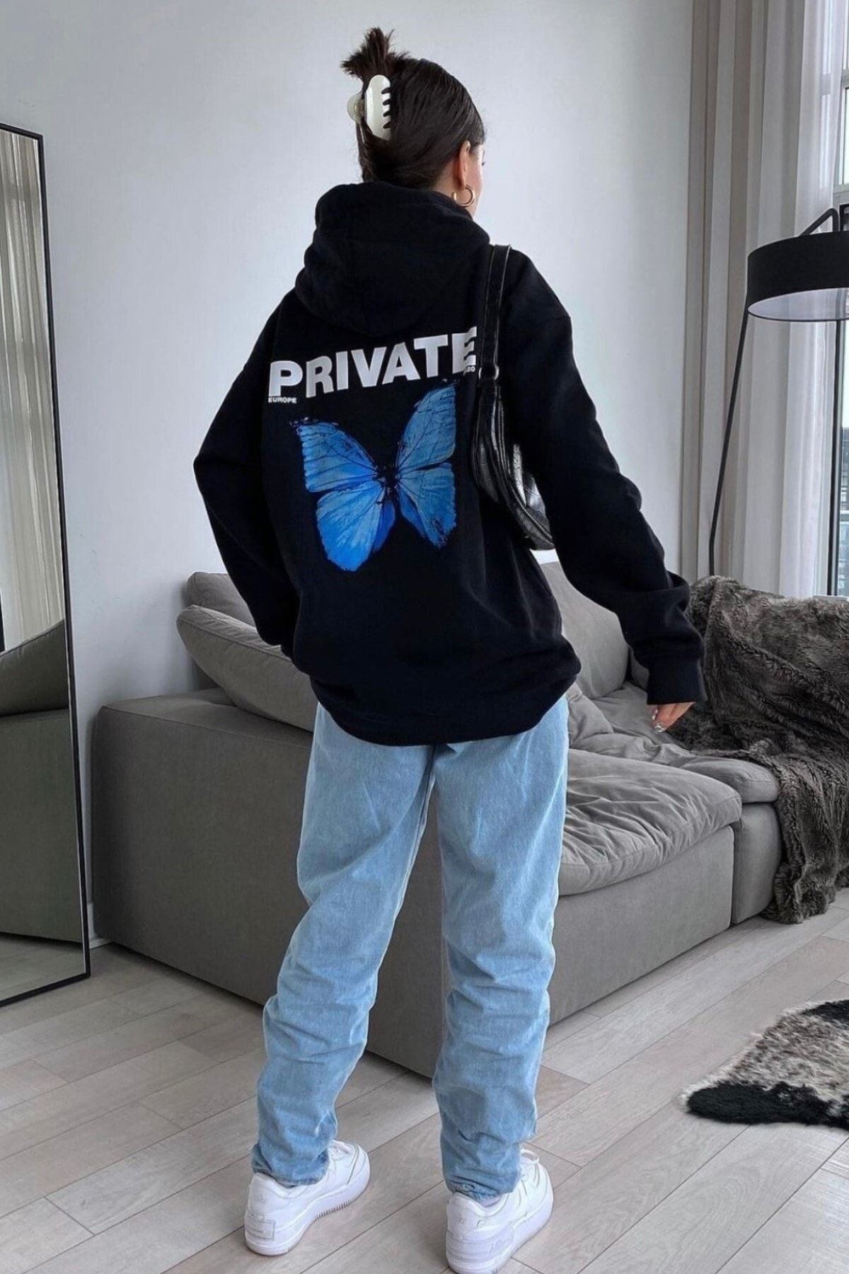 Private Kelebek Sweatshirt - Siyah Baskılı Oversize Kapüşonlu
