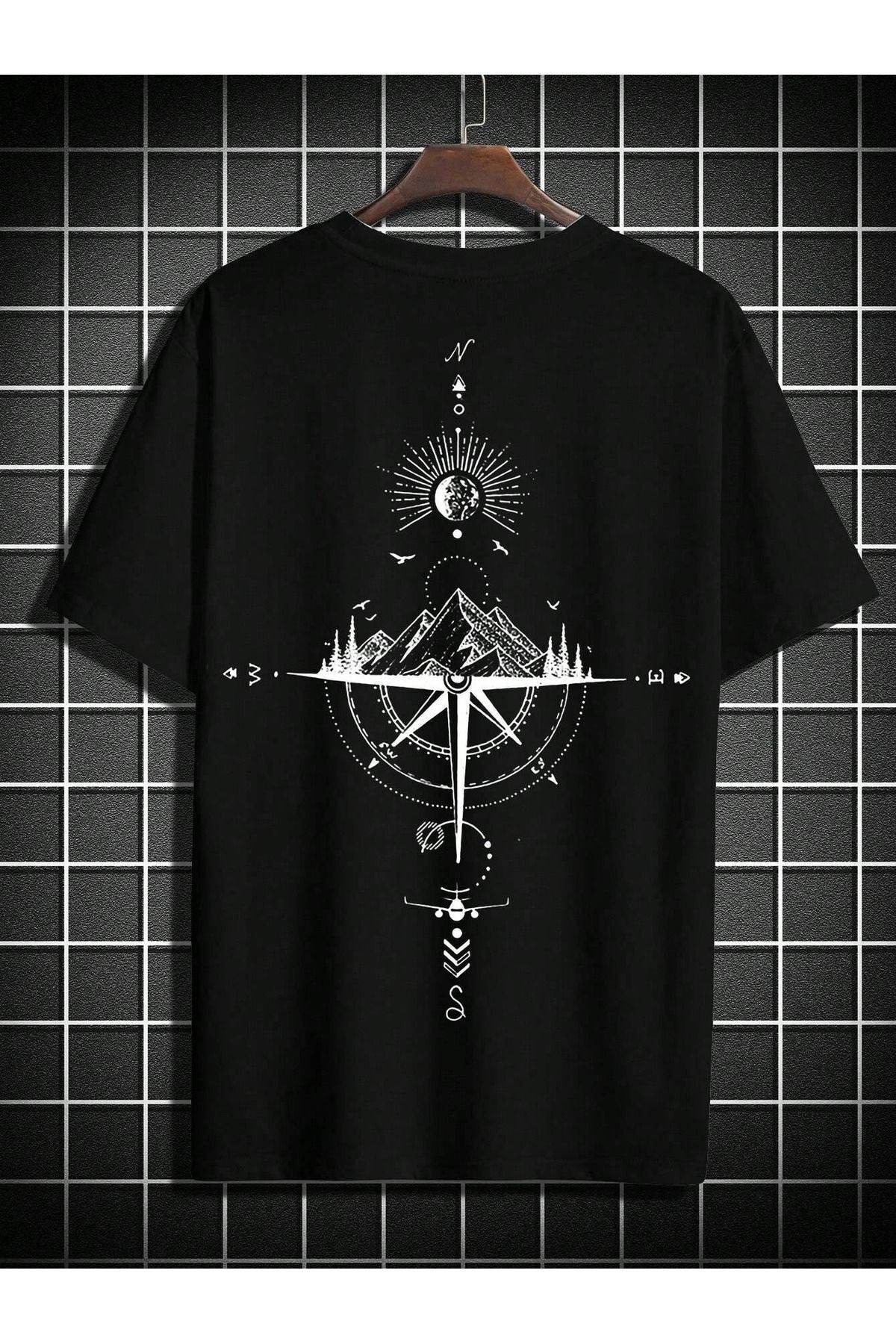 Pusula Süprem T-Shirt - Siyah Baskılı Oversize Bisiklet Yaka Kısa Kol Tişört