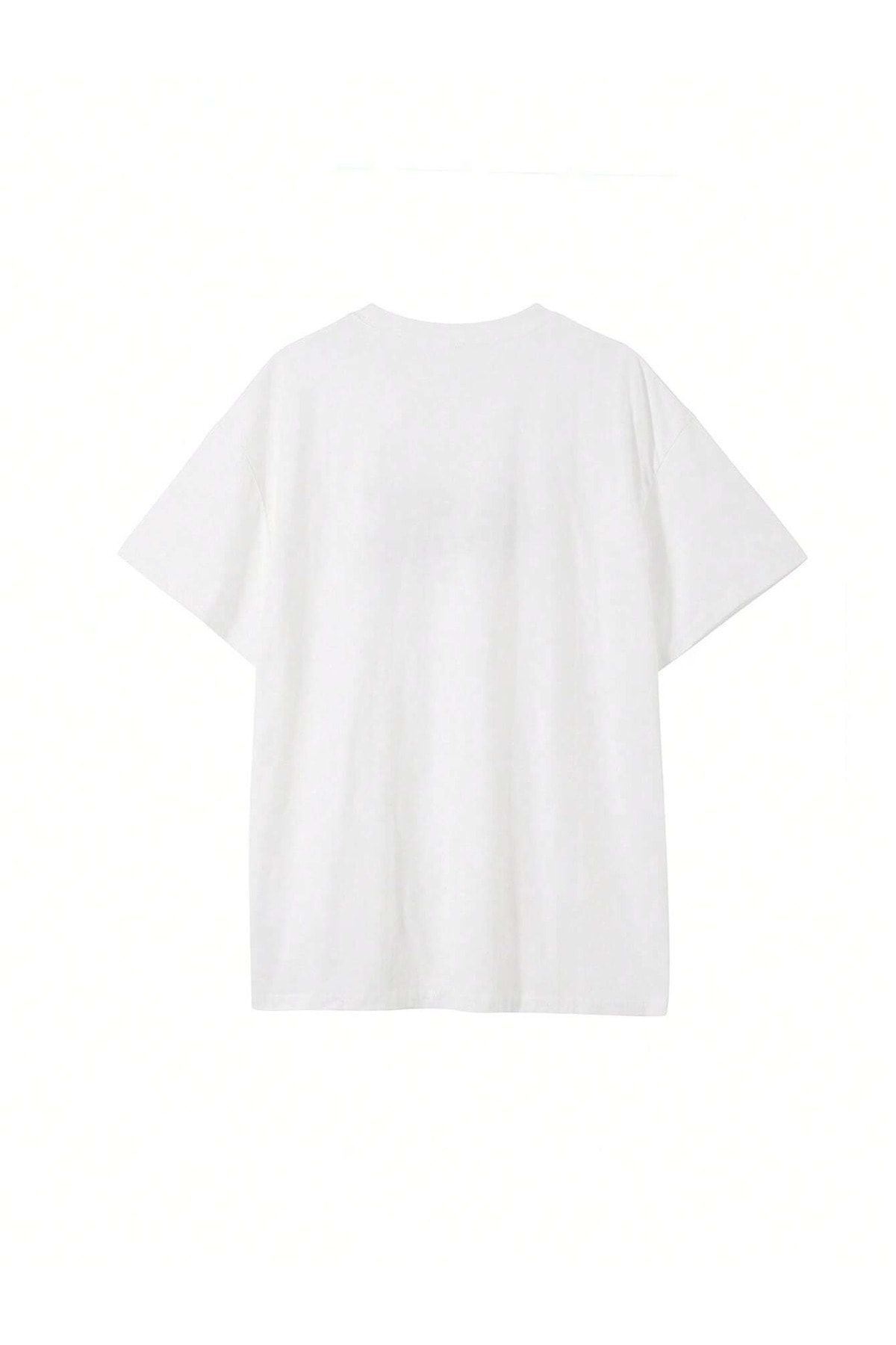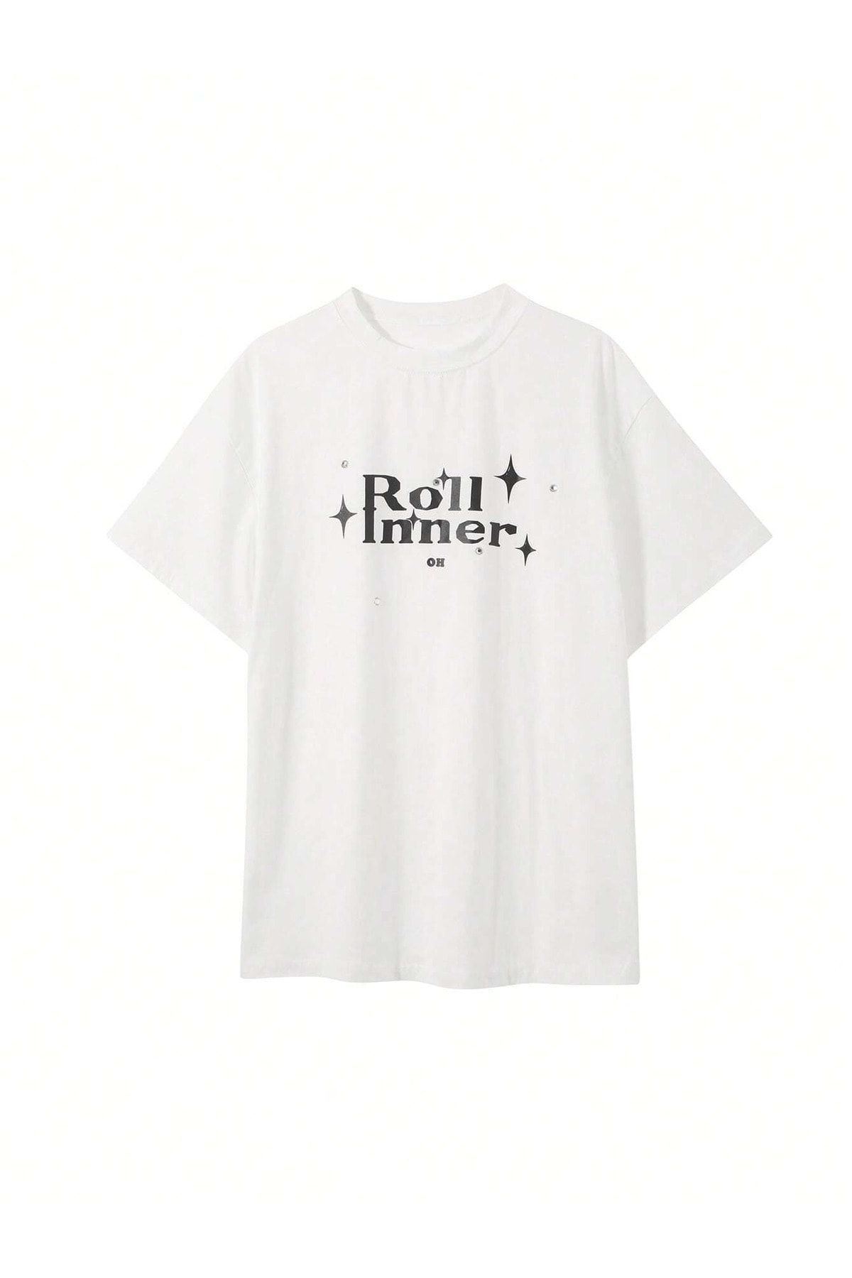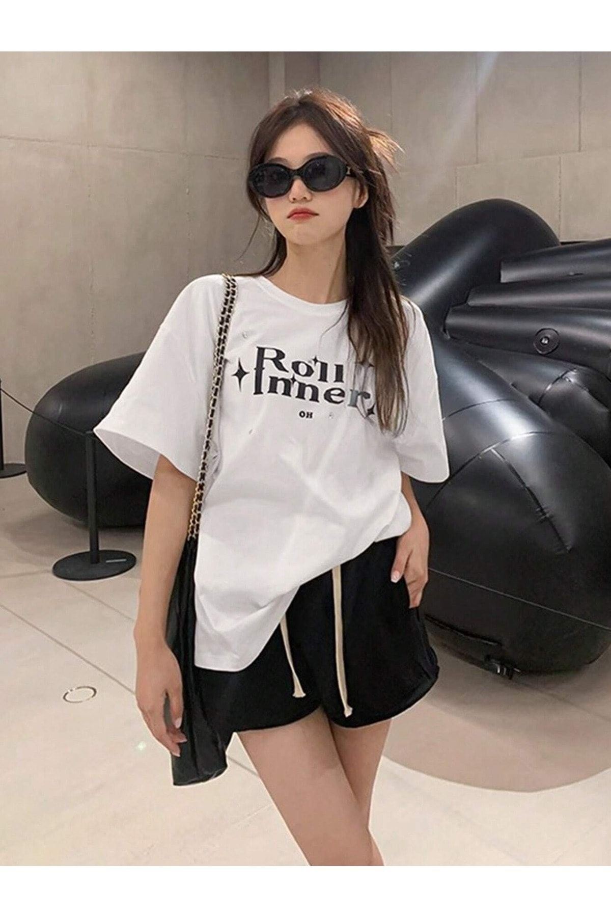 Roll Inner T-Shirt - Beyaz Oversize Baskılı Bisiklet Yaka Kısa Kol