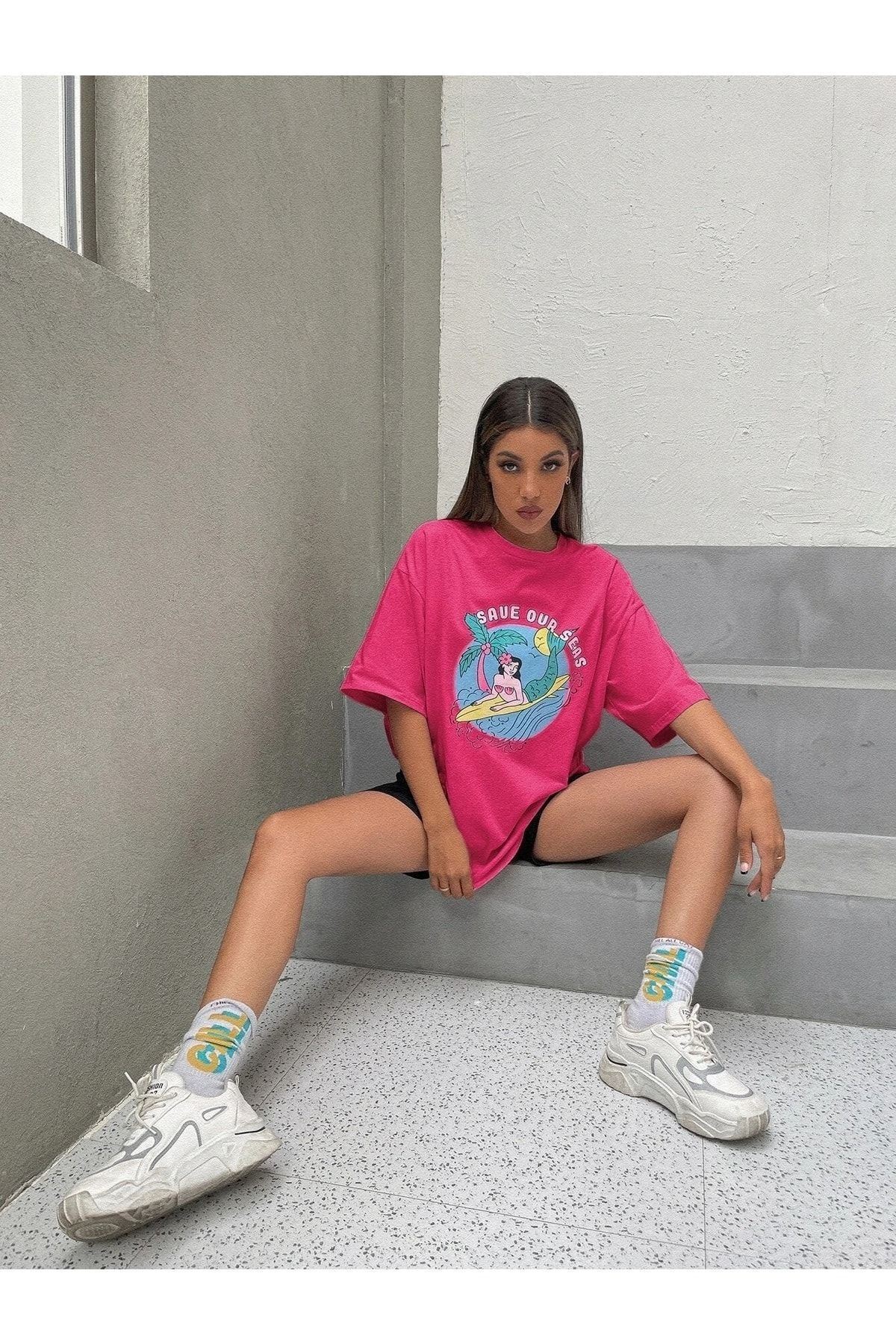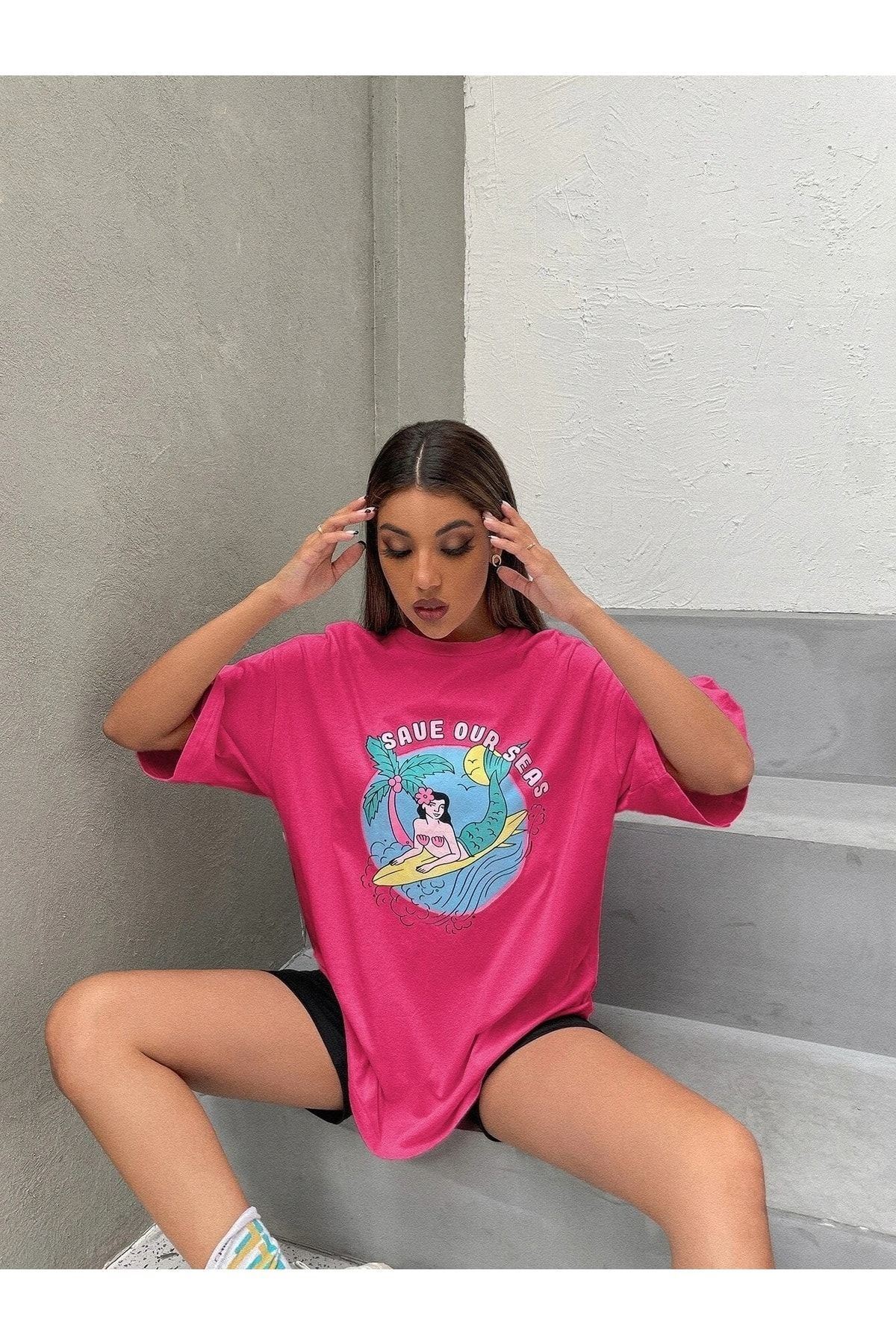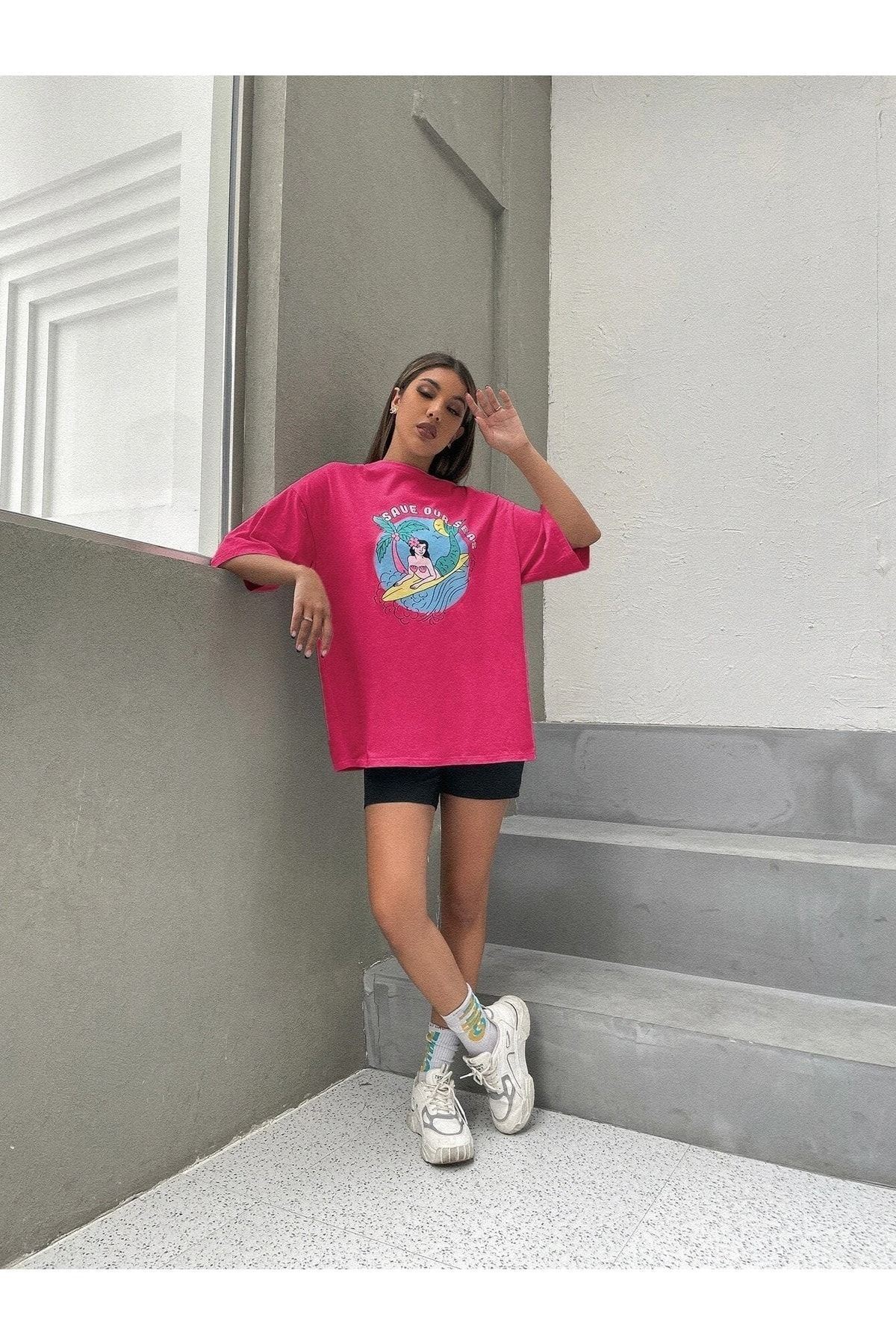 Save Our Seas T-shirt - Pembe Baskılı Oversize Bisiklet Yaka Kısa Kol Tişört