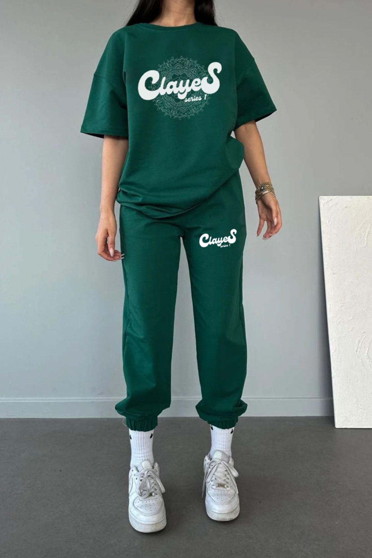 Series T-shirt Eşofman Altı Jogger- Yeşil Baskı Alt Üst Eşofman Takımı Oversize Bisiklet Yaka