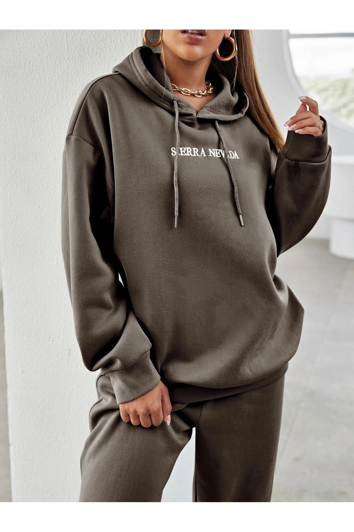 Sierra Nevada Eşofman Takımı Sweatshirt Jogger - Kahverengi Baskılı Oversize Şardonlu Kapüşonlu