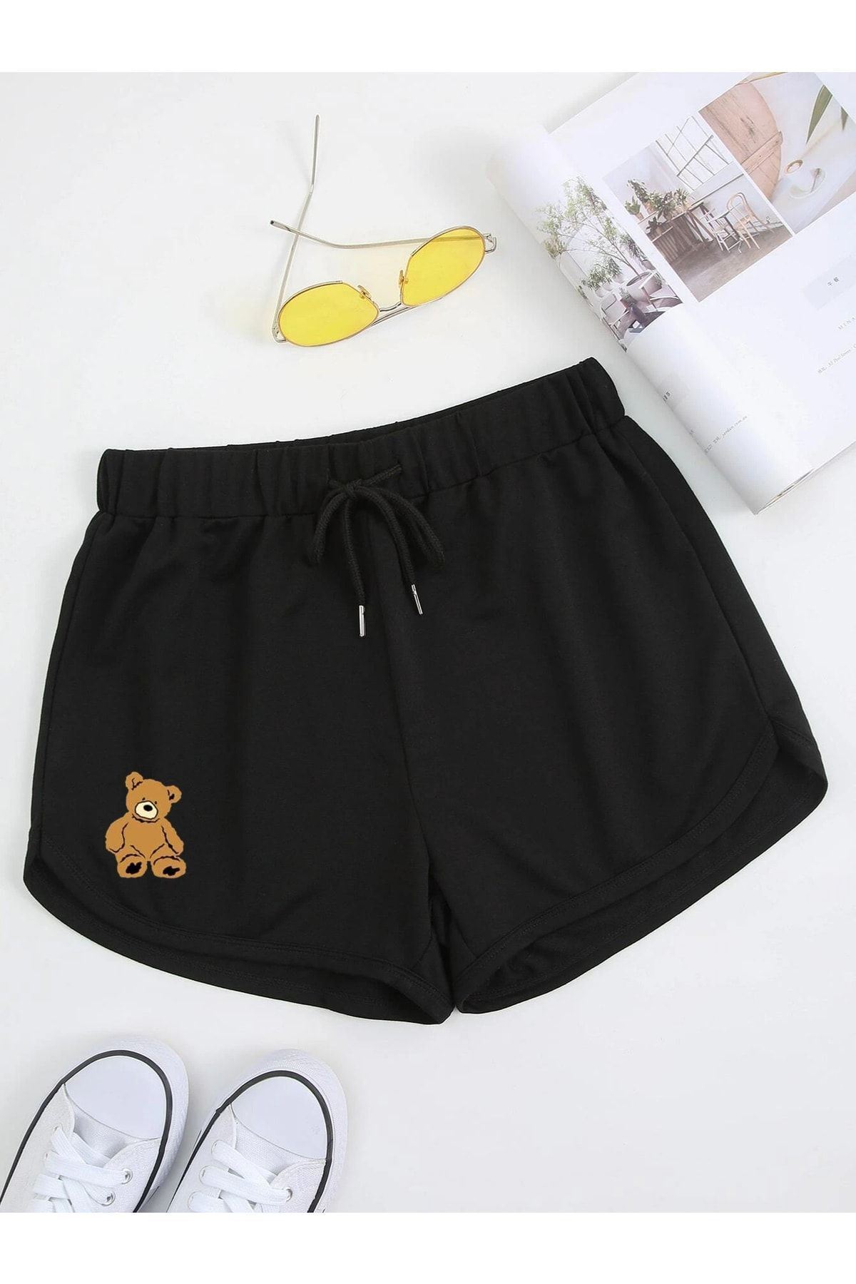 Siyah Ayıcık Bermuda Penye Şort - Kordonlu Baskılı