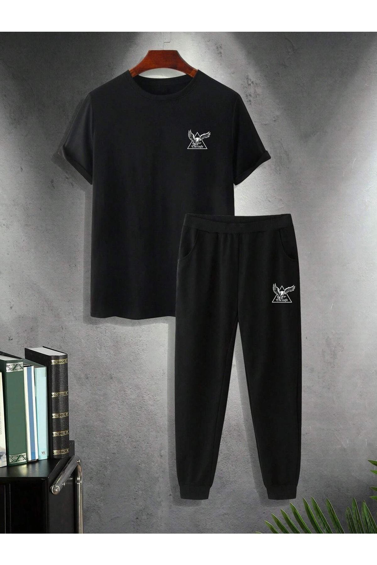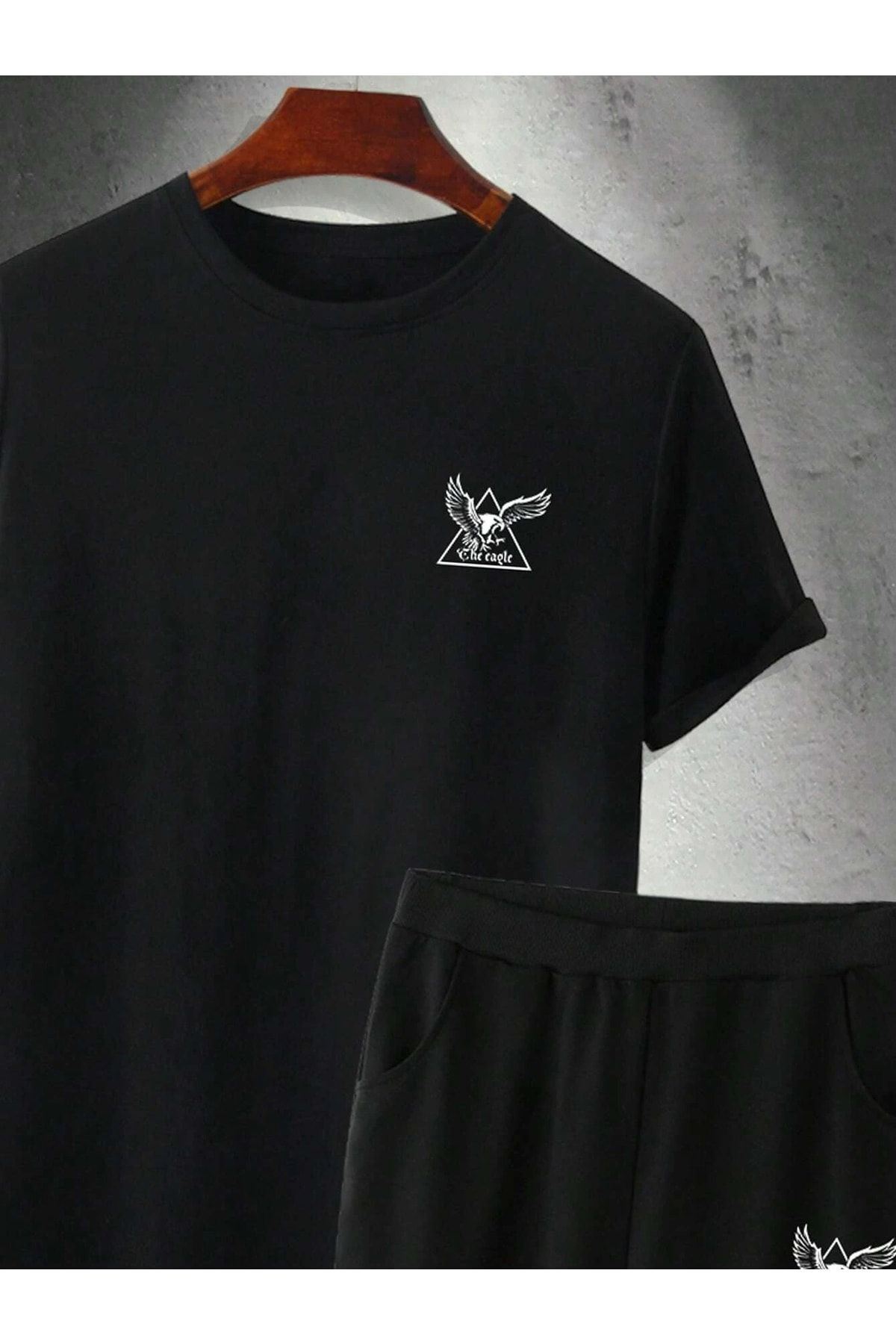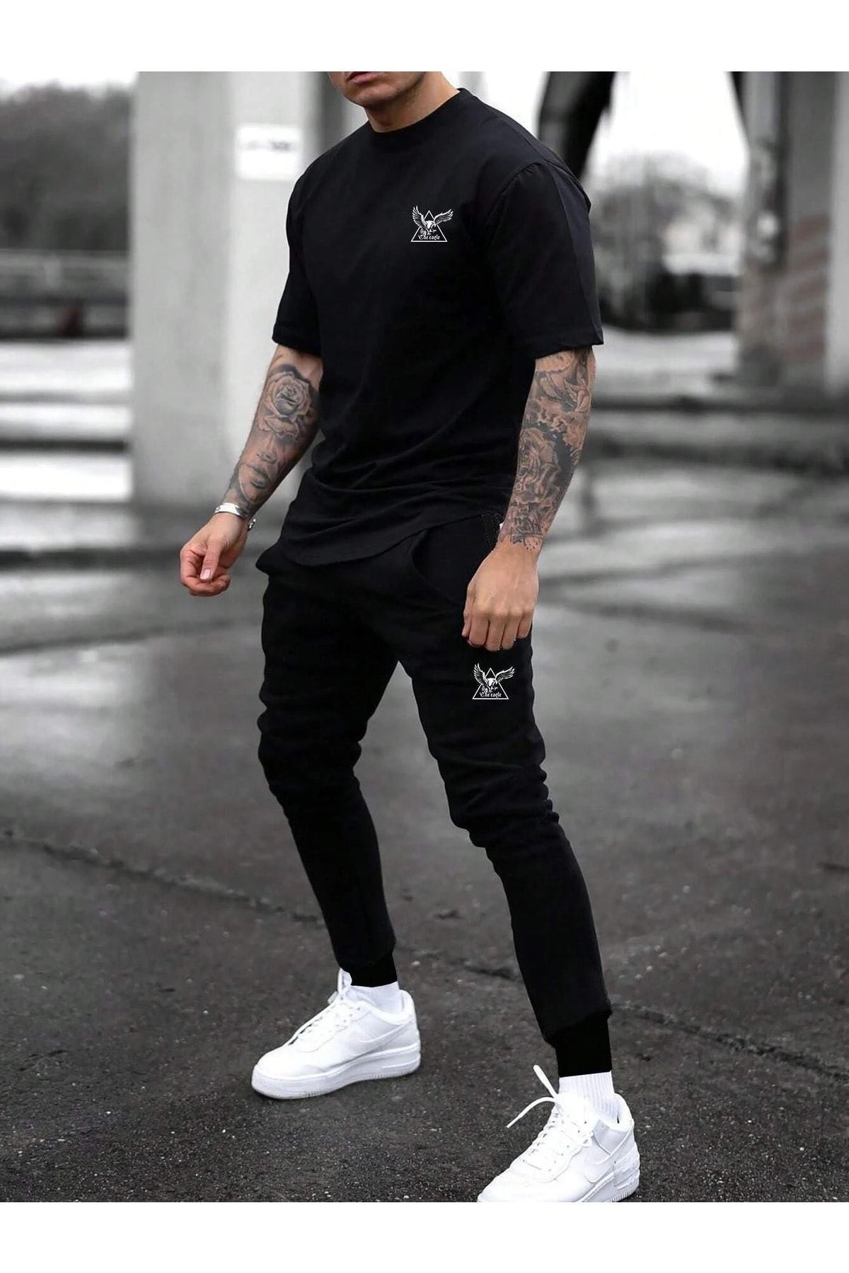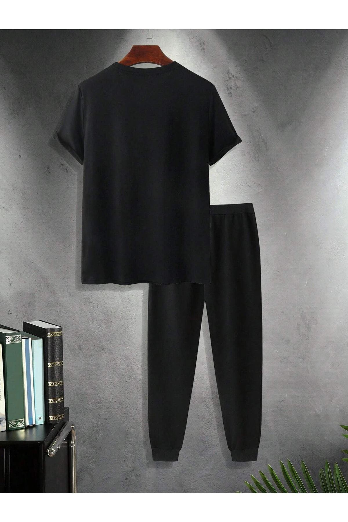 Siyah Baskı Alt Üst Eşofman Takım Oversize Bisiklet Yaka