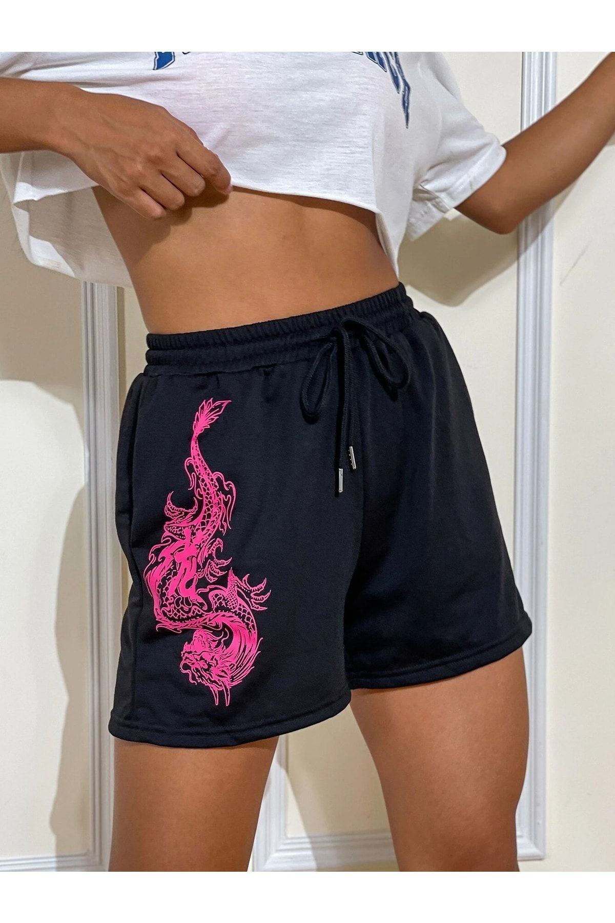 Siyah Kısa Ejderha Şort - Penye Baskılı Kordonlu