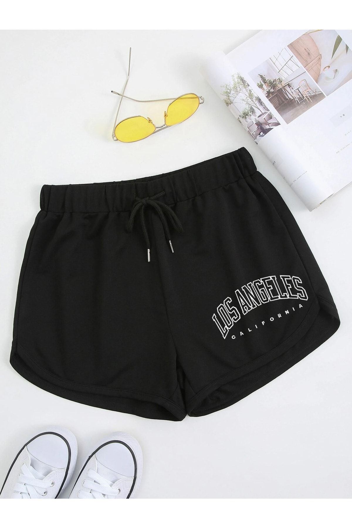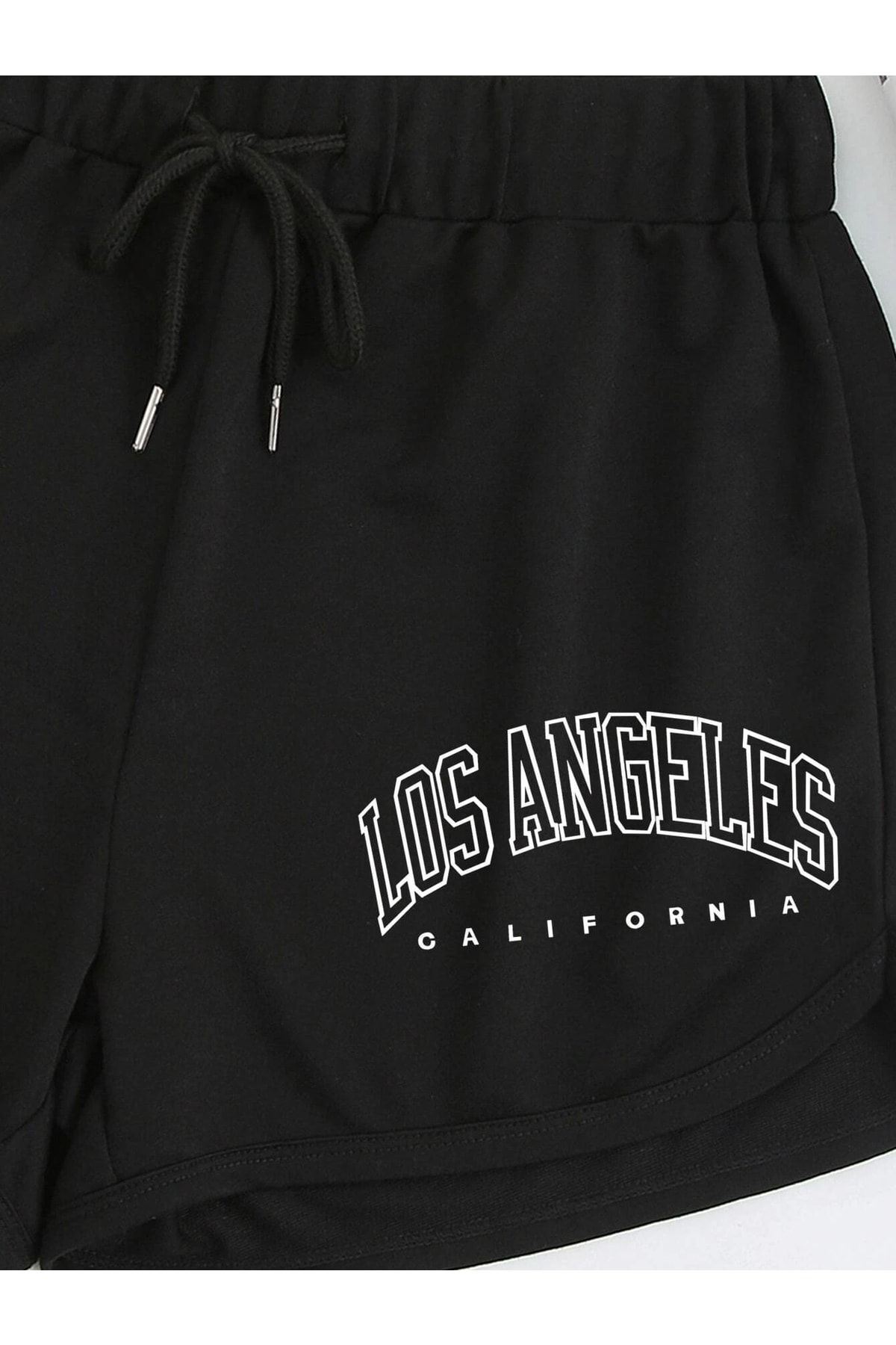 Siyah Los Angeles Bermuda Penye Şort - Kordonlu Baskılı