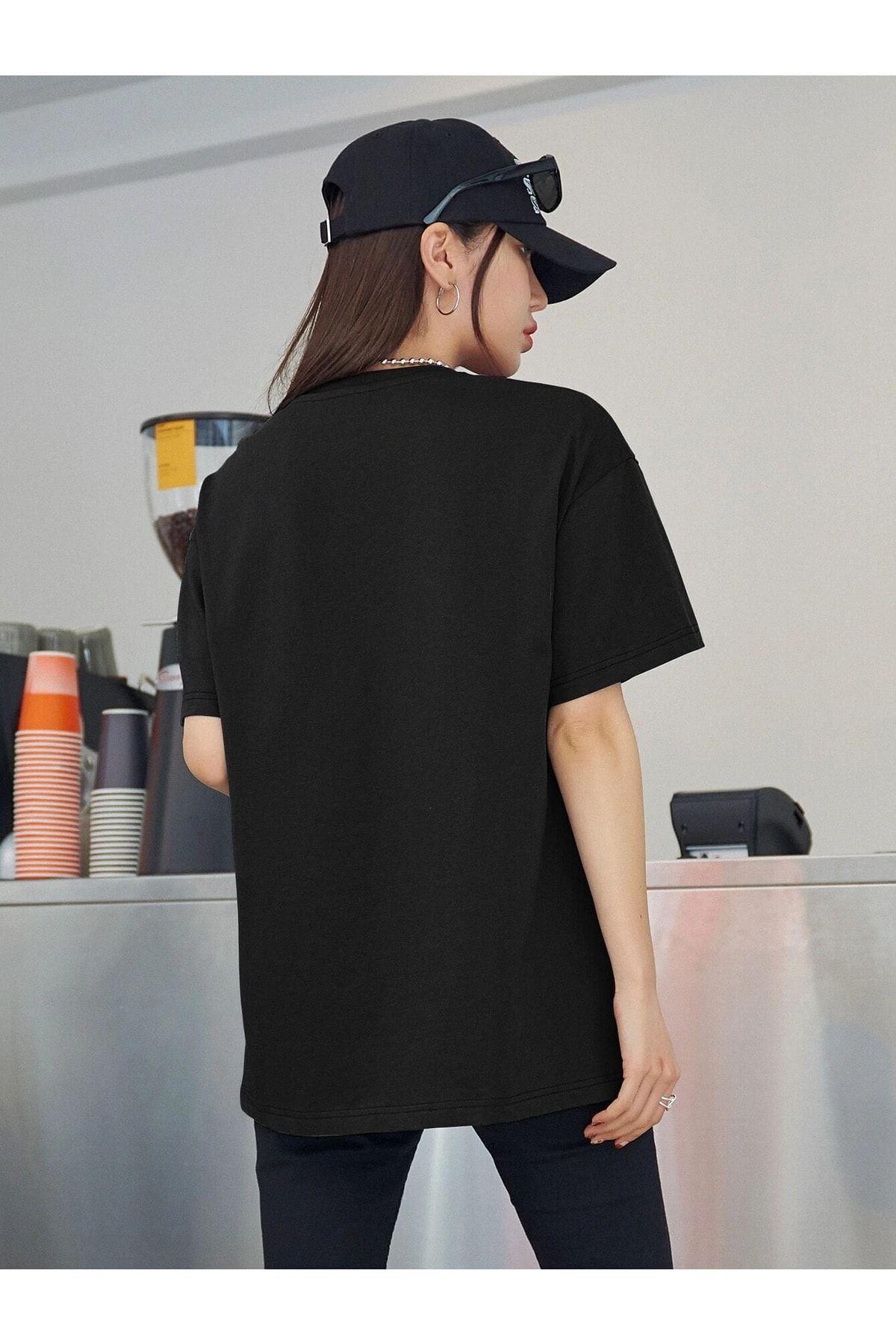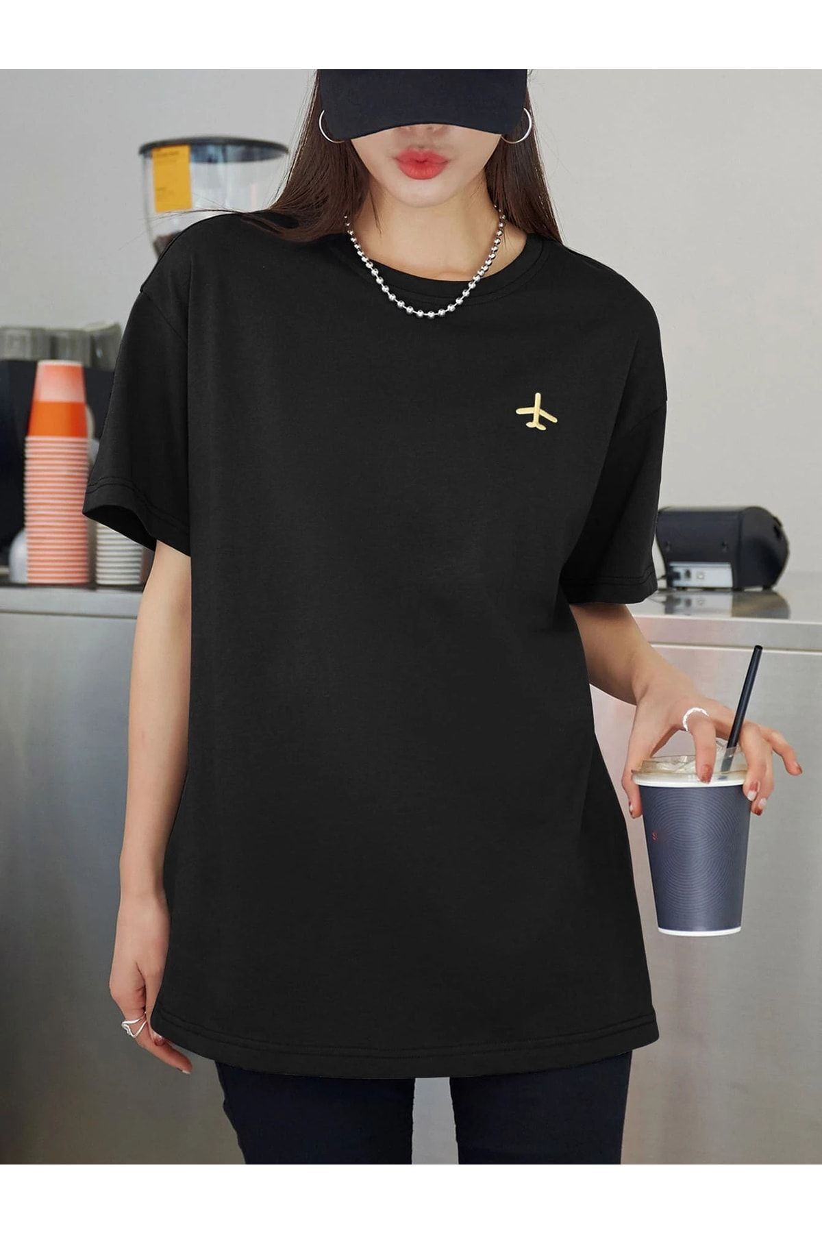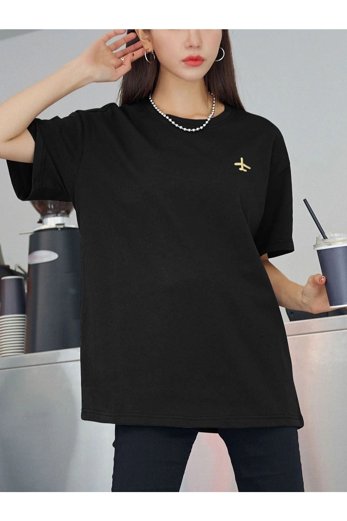 Siyah Oversize Uçak Logolu T-shirt - Oversize Baskılı