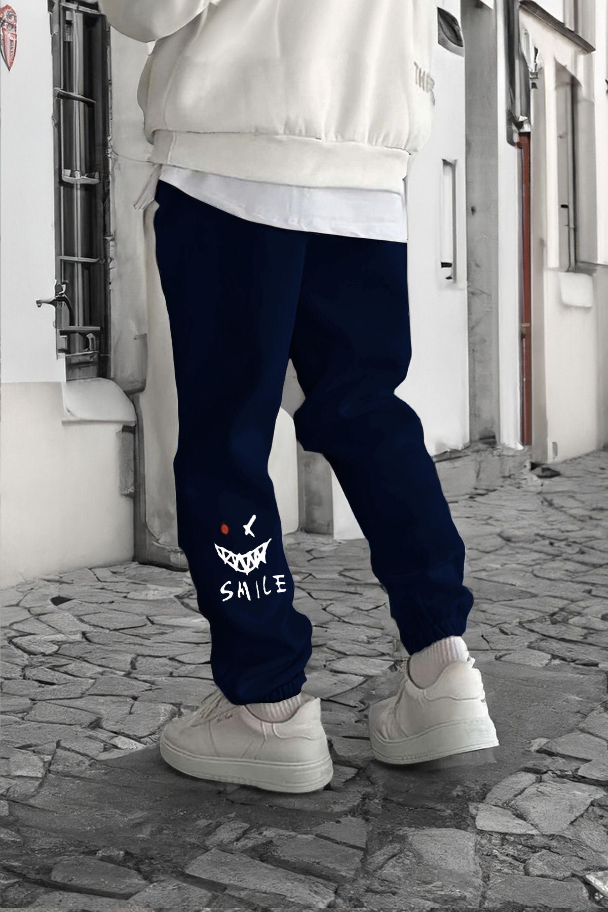 Smile Face Lacivert Jogger Ince Eşofman Altı - Paça Baskı Detaylı Lastik Paça Baskılı Rahat Tarz