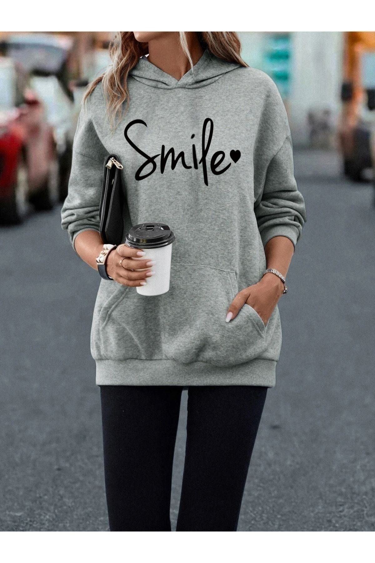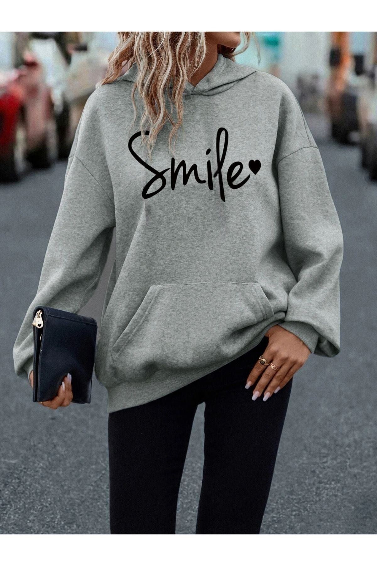 Smile Sweatshirt - Gri Baskılı Oversize Kapüşonlu