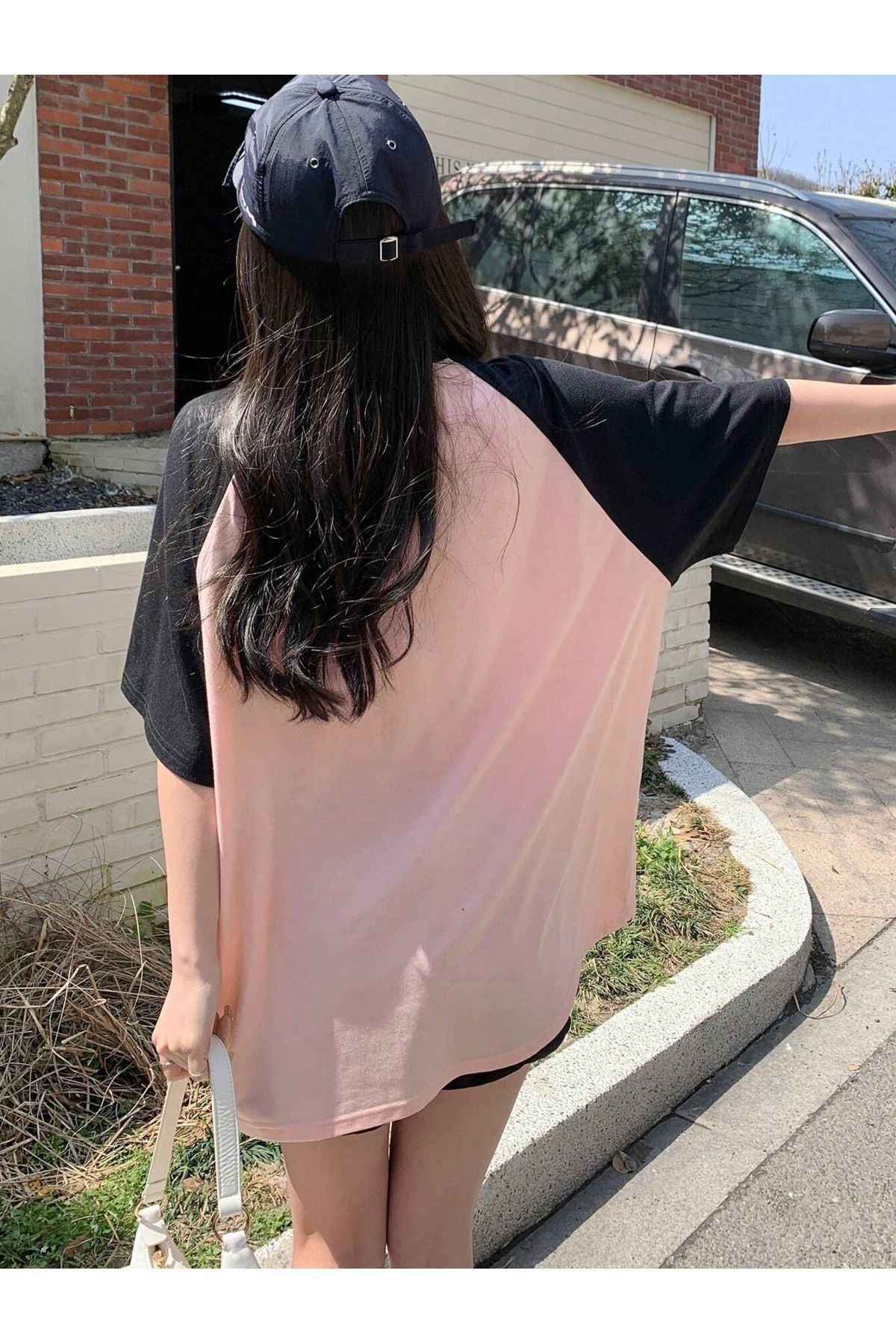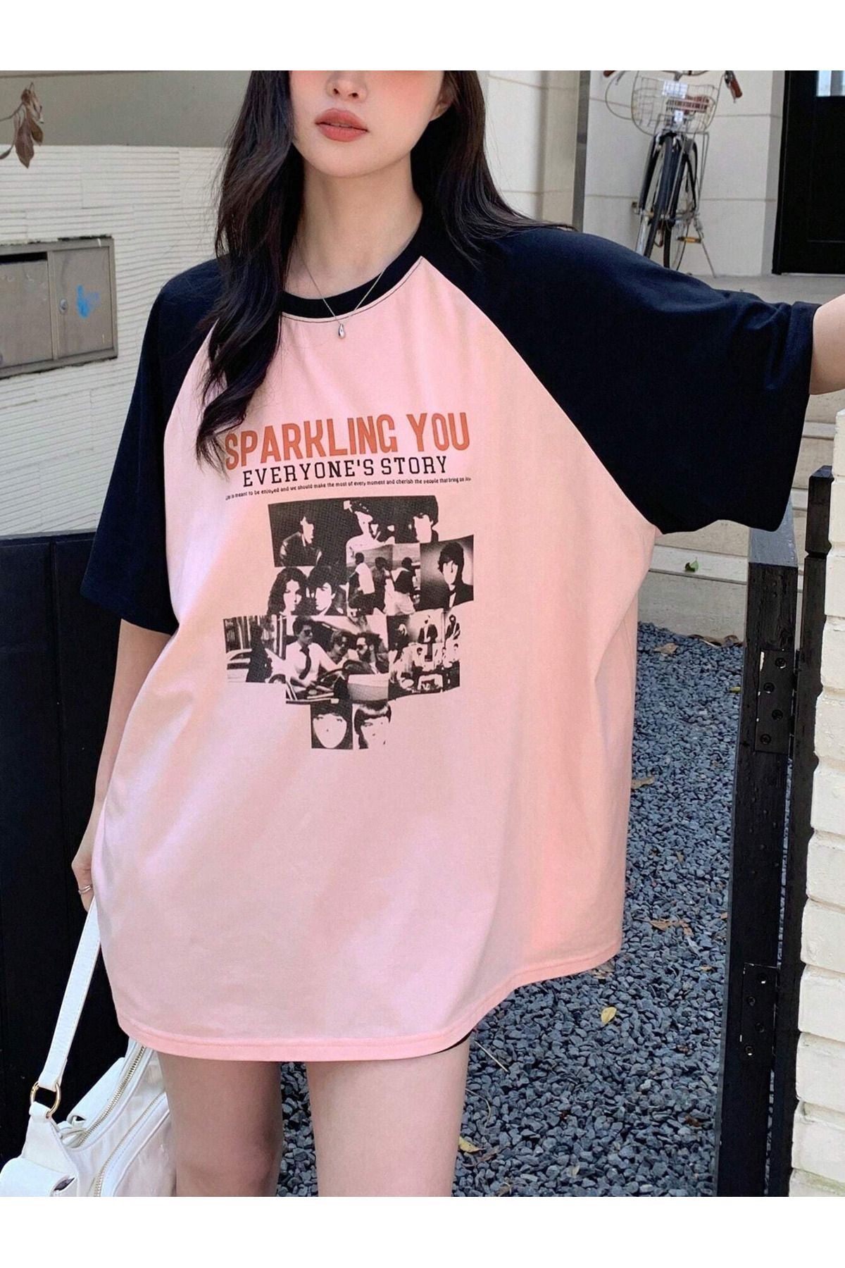 Sparklıng You T-shirt - Pembe Siyah Baskılı Oversize Bisiklet Yaka Reglan Kol Tişört