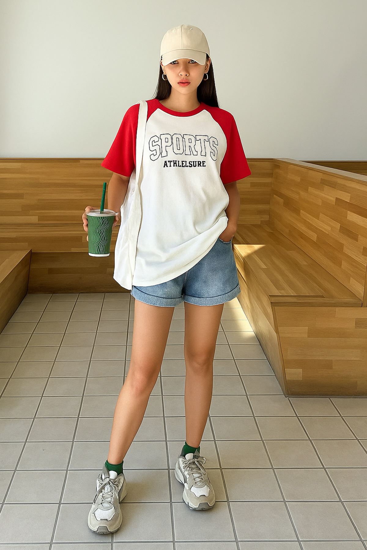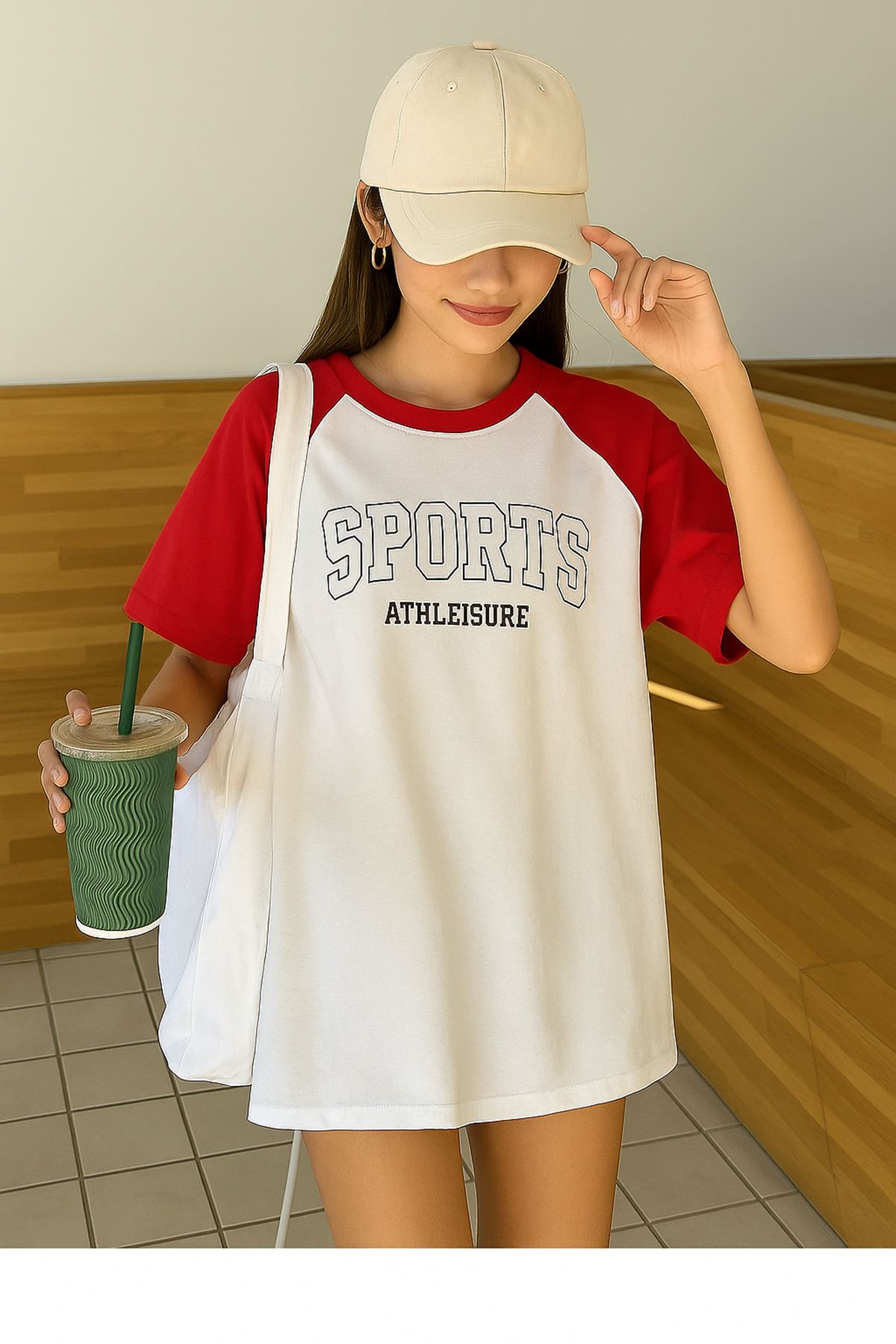 Sports Athleisure Beyaz Gövde Kırmızı Kol T-Shirt - Oversize Bisiklet Yaka Tişört
