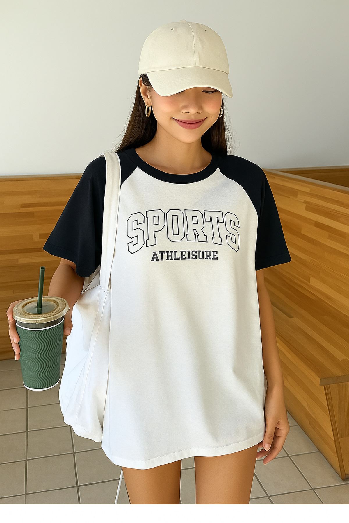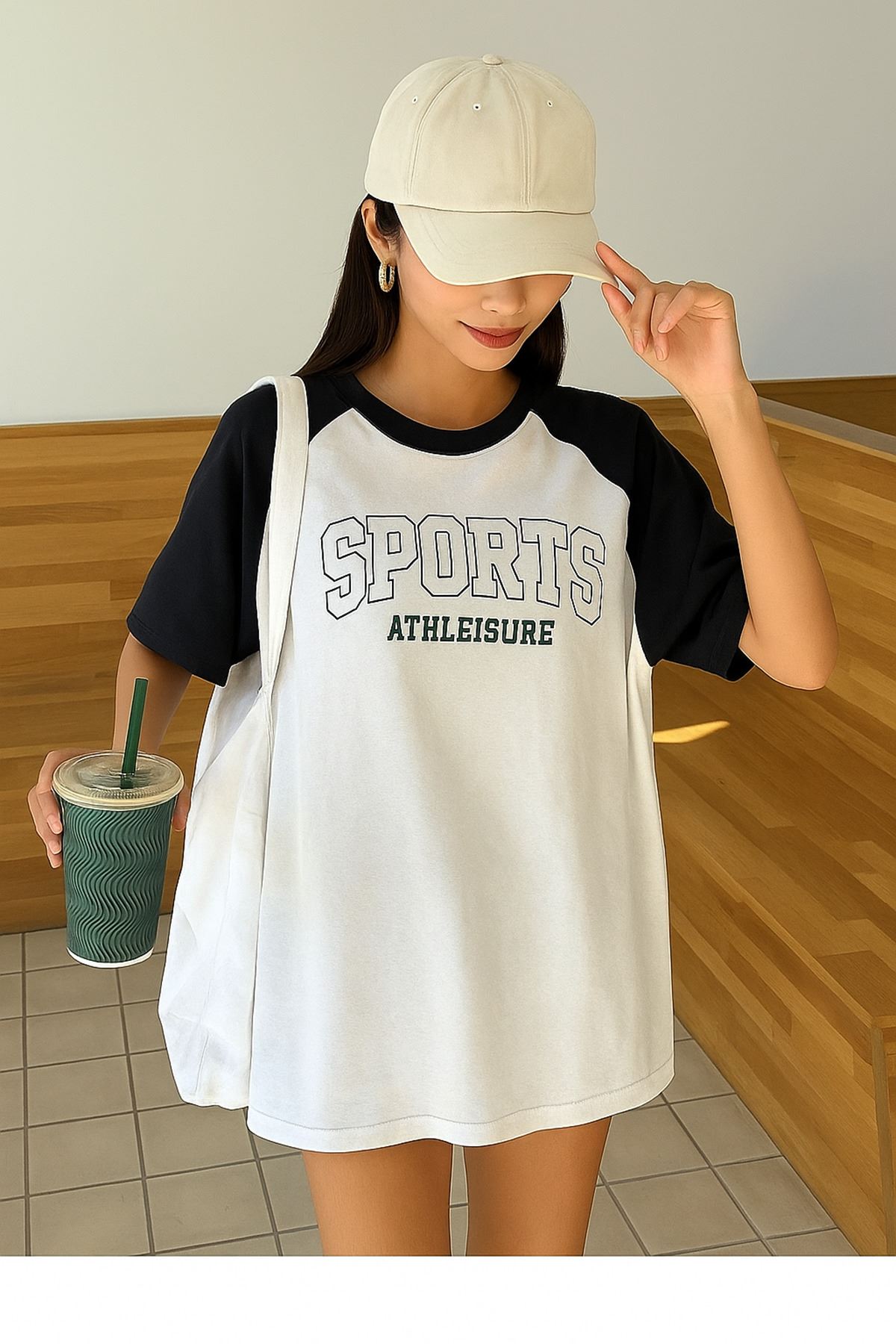 Sports Athleisure Beyaz Gövde Siyah Kol T-Shirt - Oversize Bisiklet Yaka Tişört