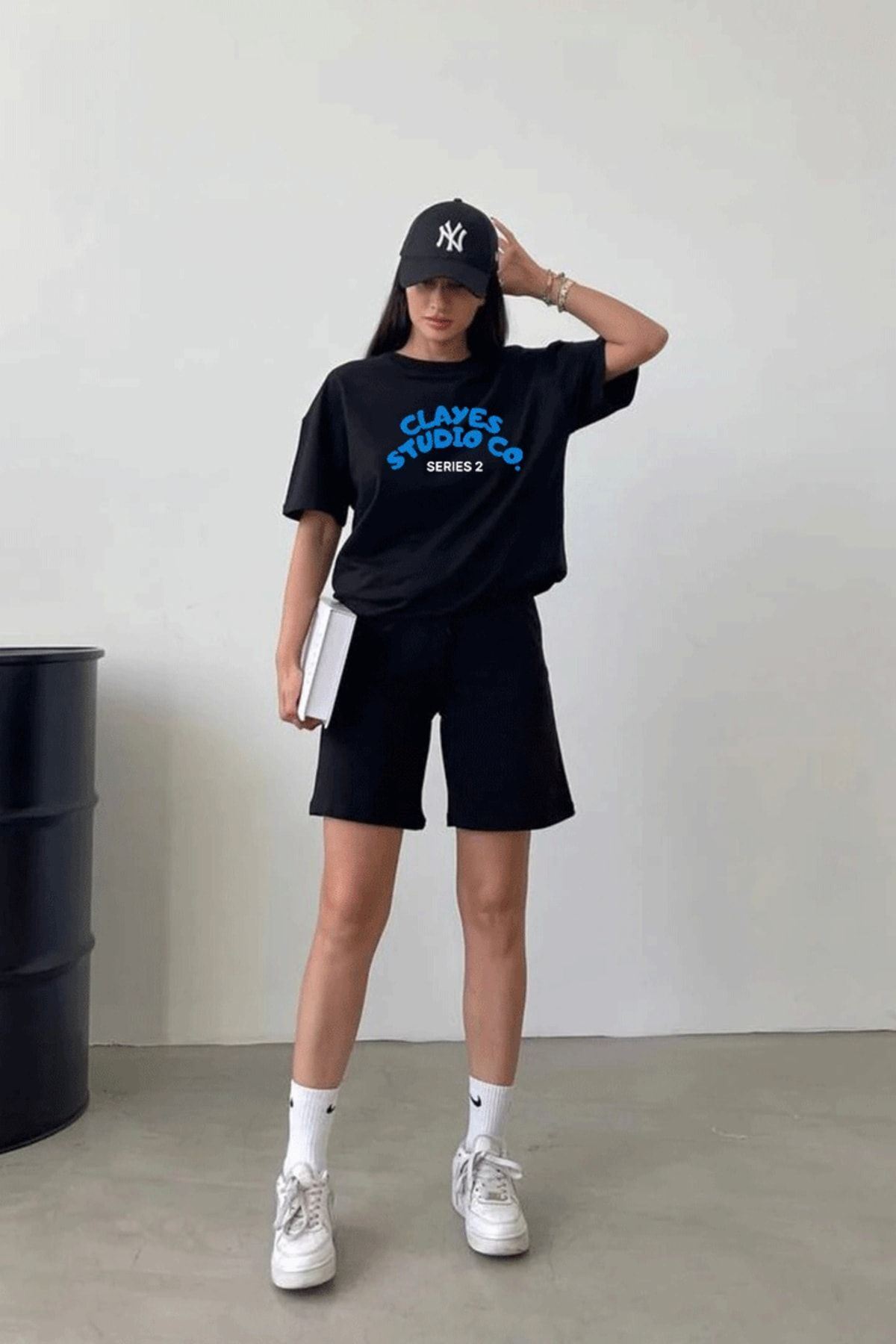 Studio Co. T-Shirt Şort - Siyah Alt Üst Kombin Şort Tişört Takım Baskılı Oversize Bisiklet Yaka