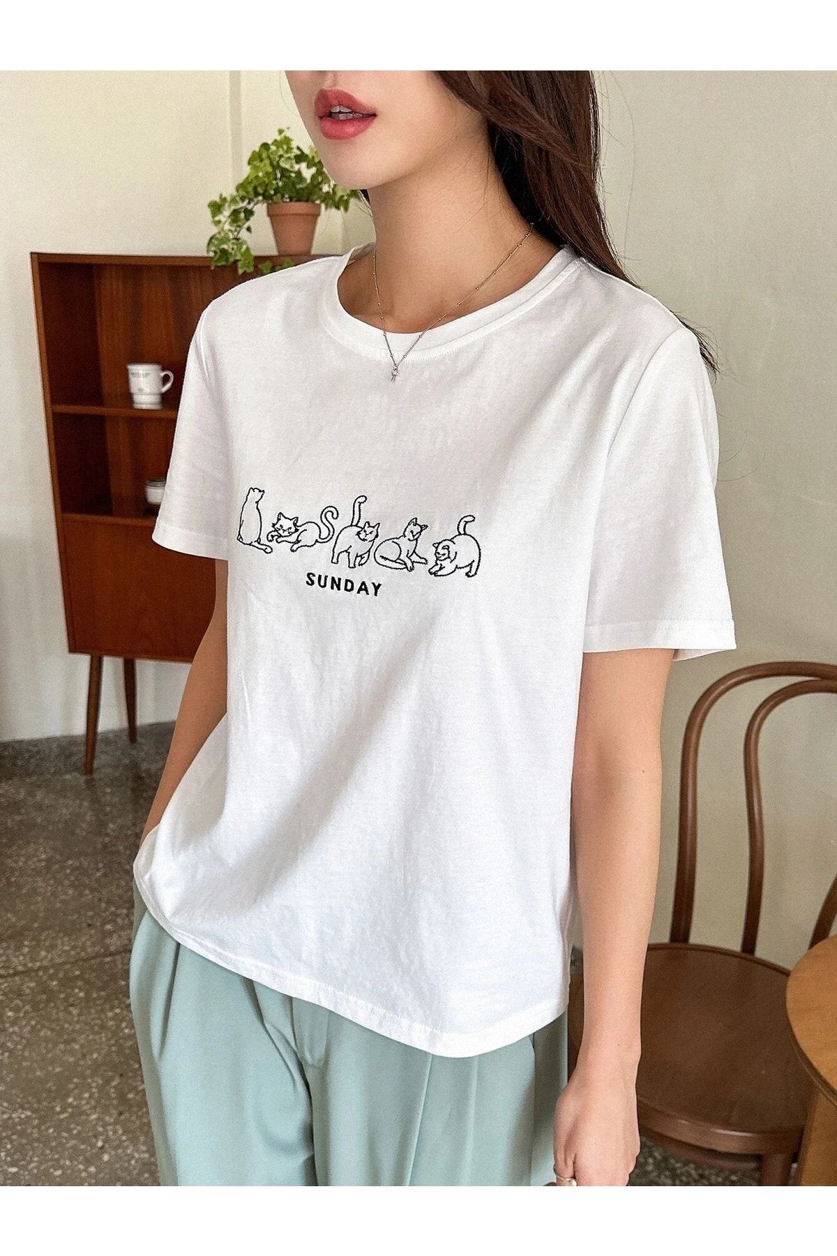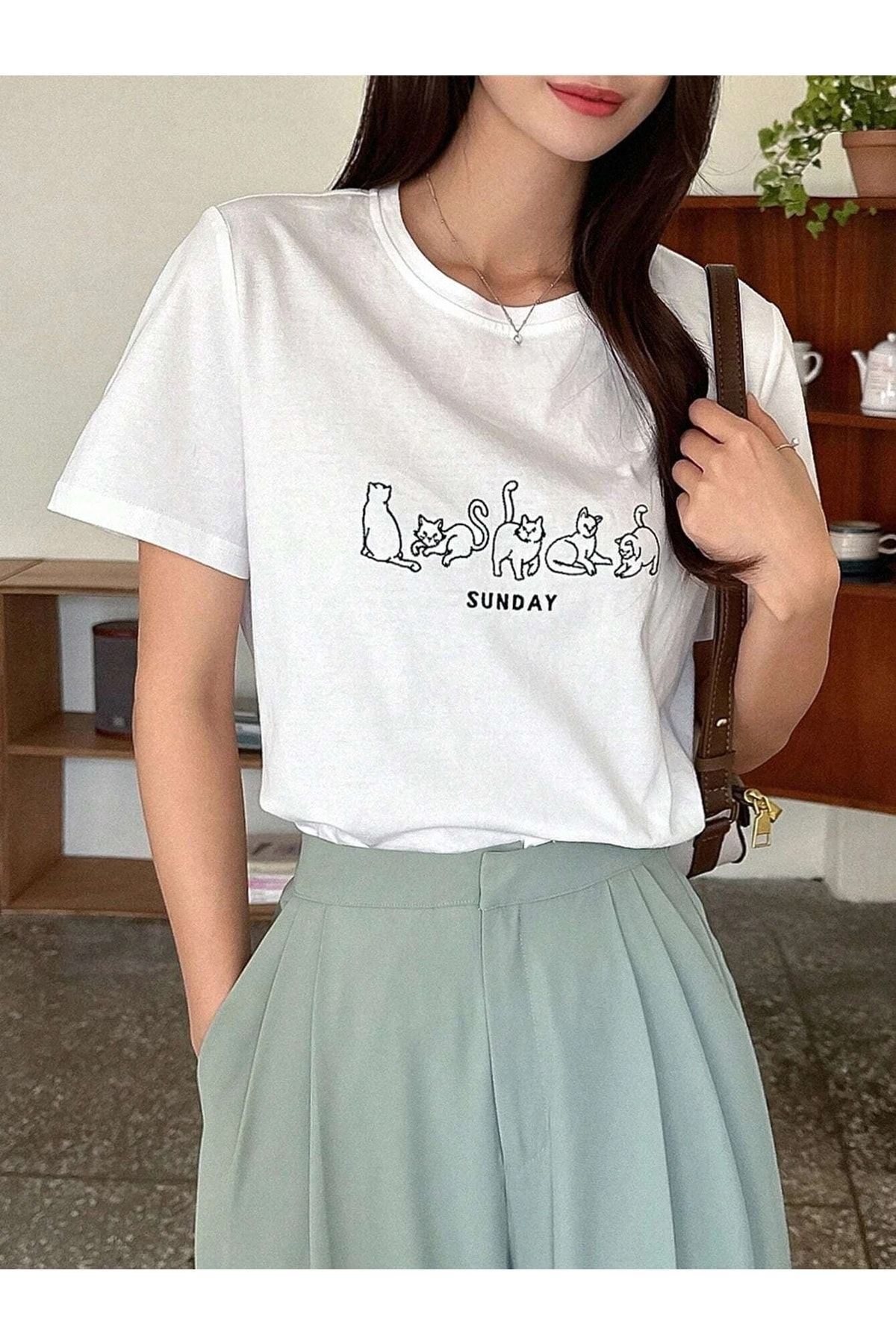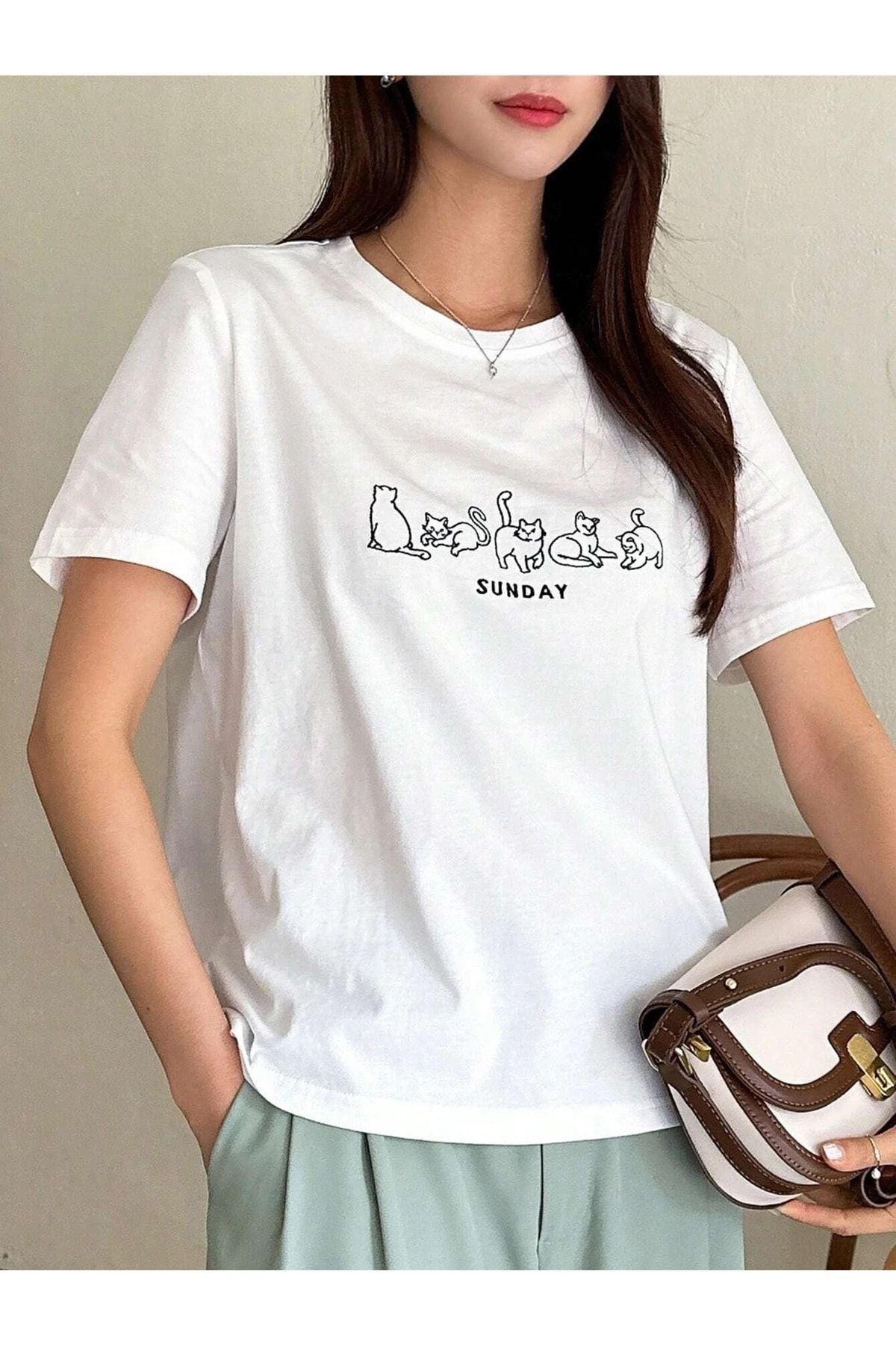 Sunday Kedi Figür T-shirt - Beyaz Baskılı Oversize Bisiklet Yaka Kısa Kol Tişört