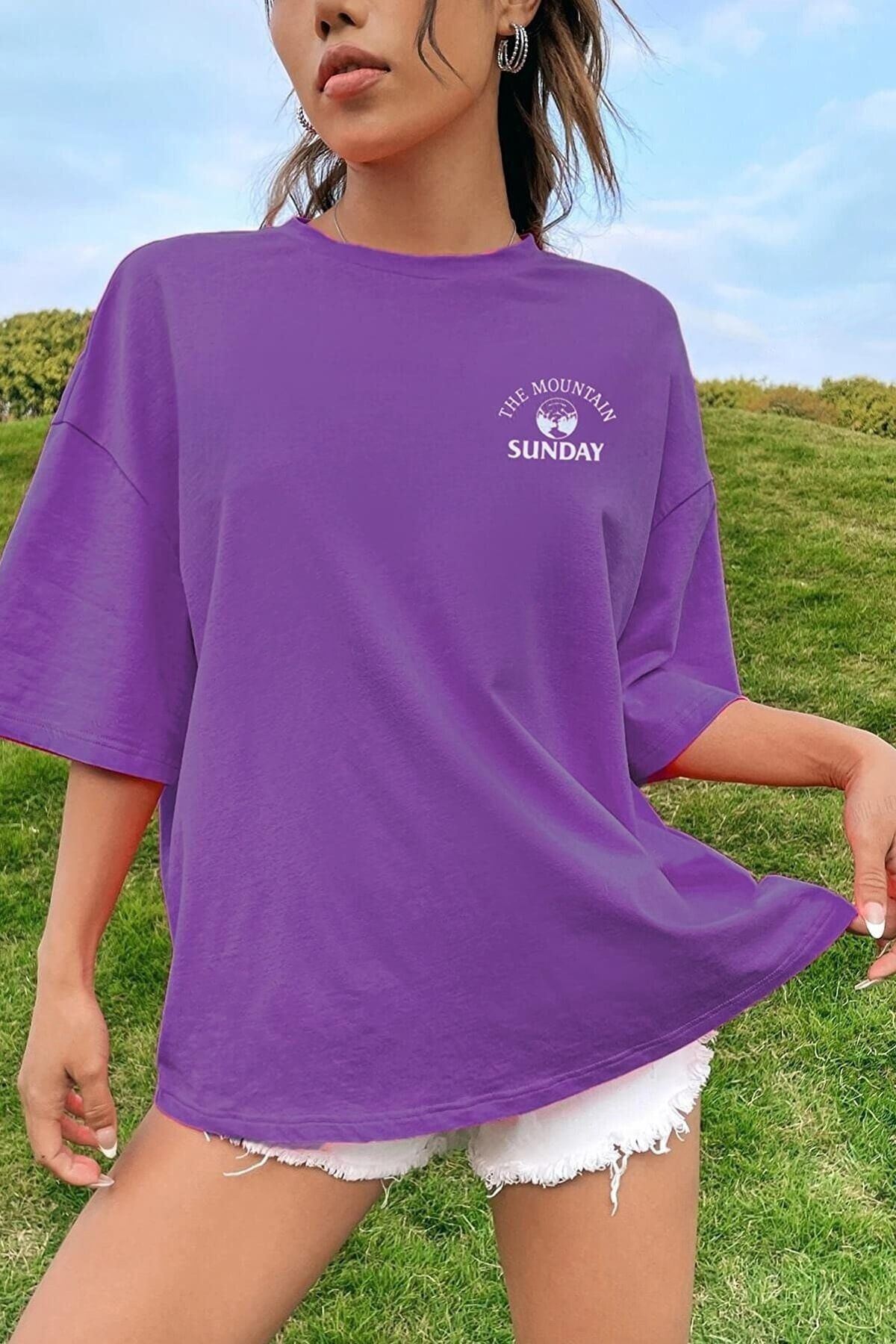 Sunday Mountain T-shirt - Mor Baskılı Oversize Bisiklet Yaka Kısa Kol Tişört