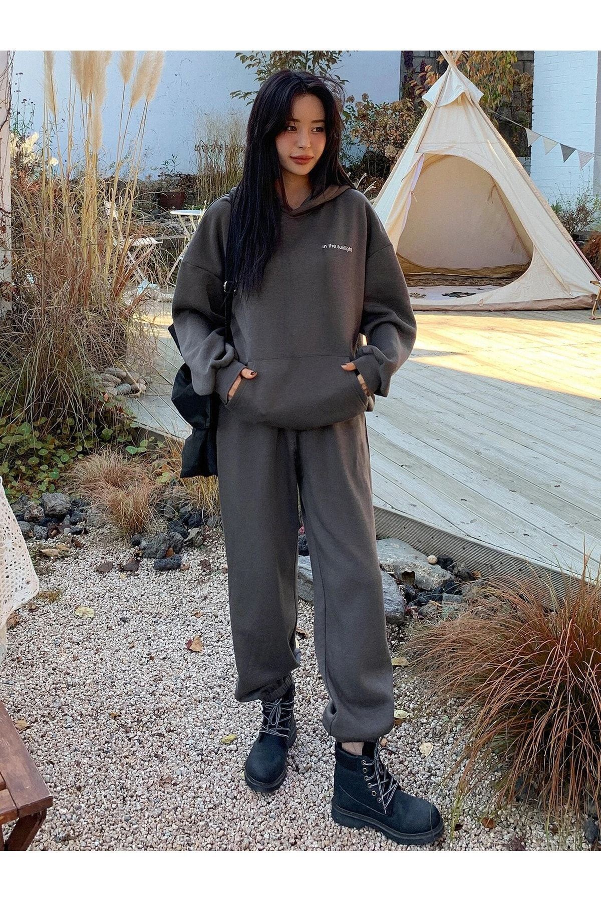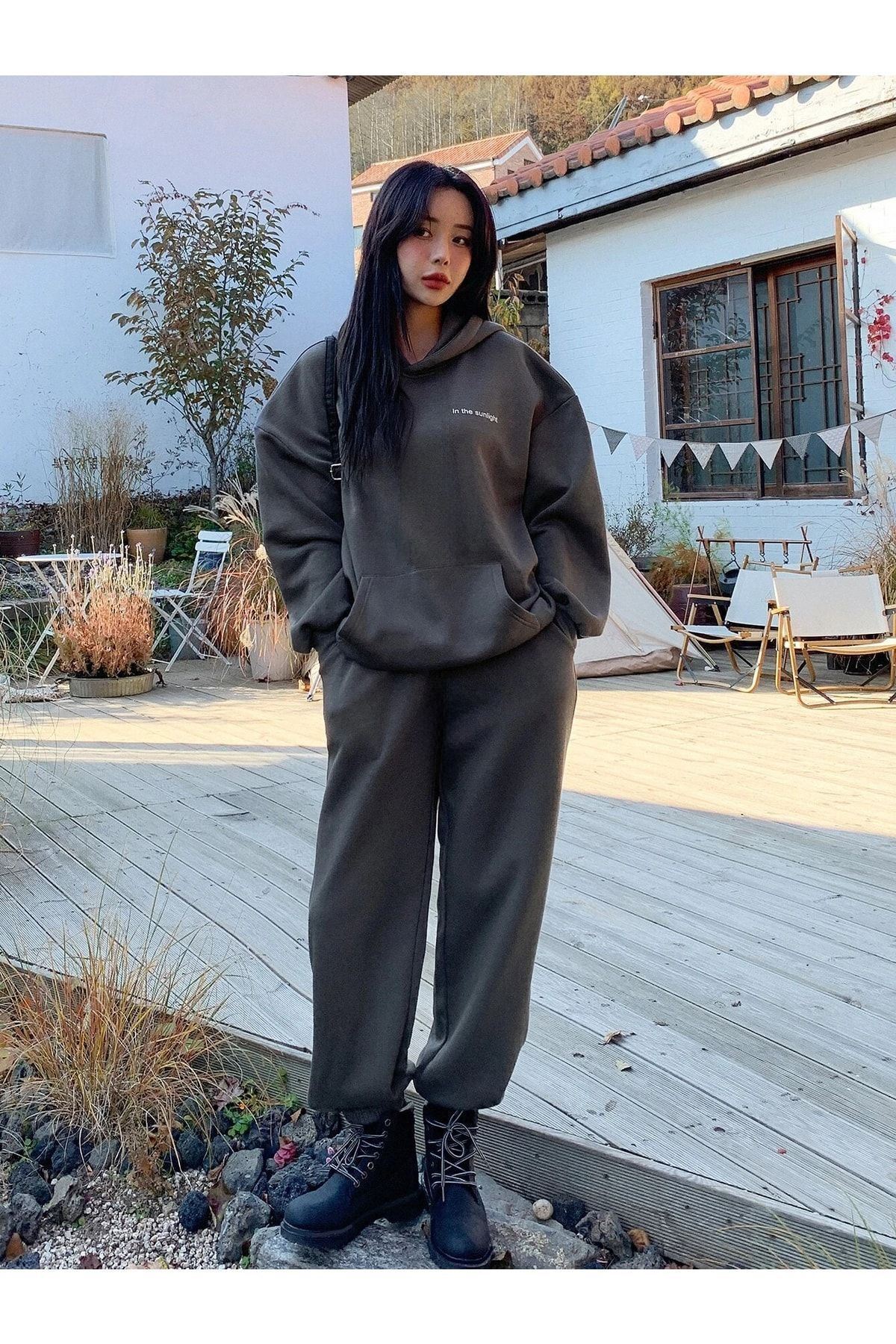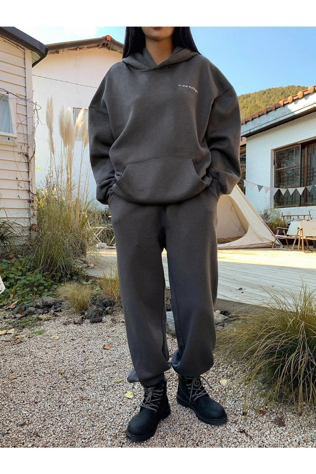 Sunlight Yazılı 2li Sweatshirt Eşofman Altı Jogger- Füme Alt Üst Eşofman Takım Oversize Kapüşonlu