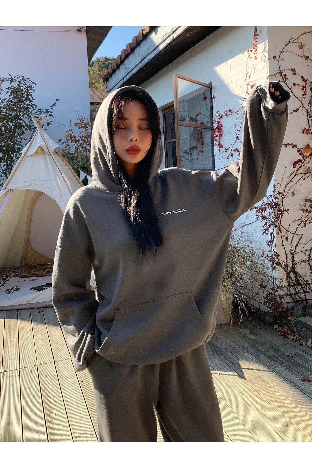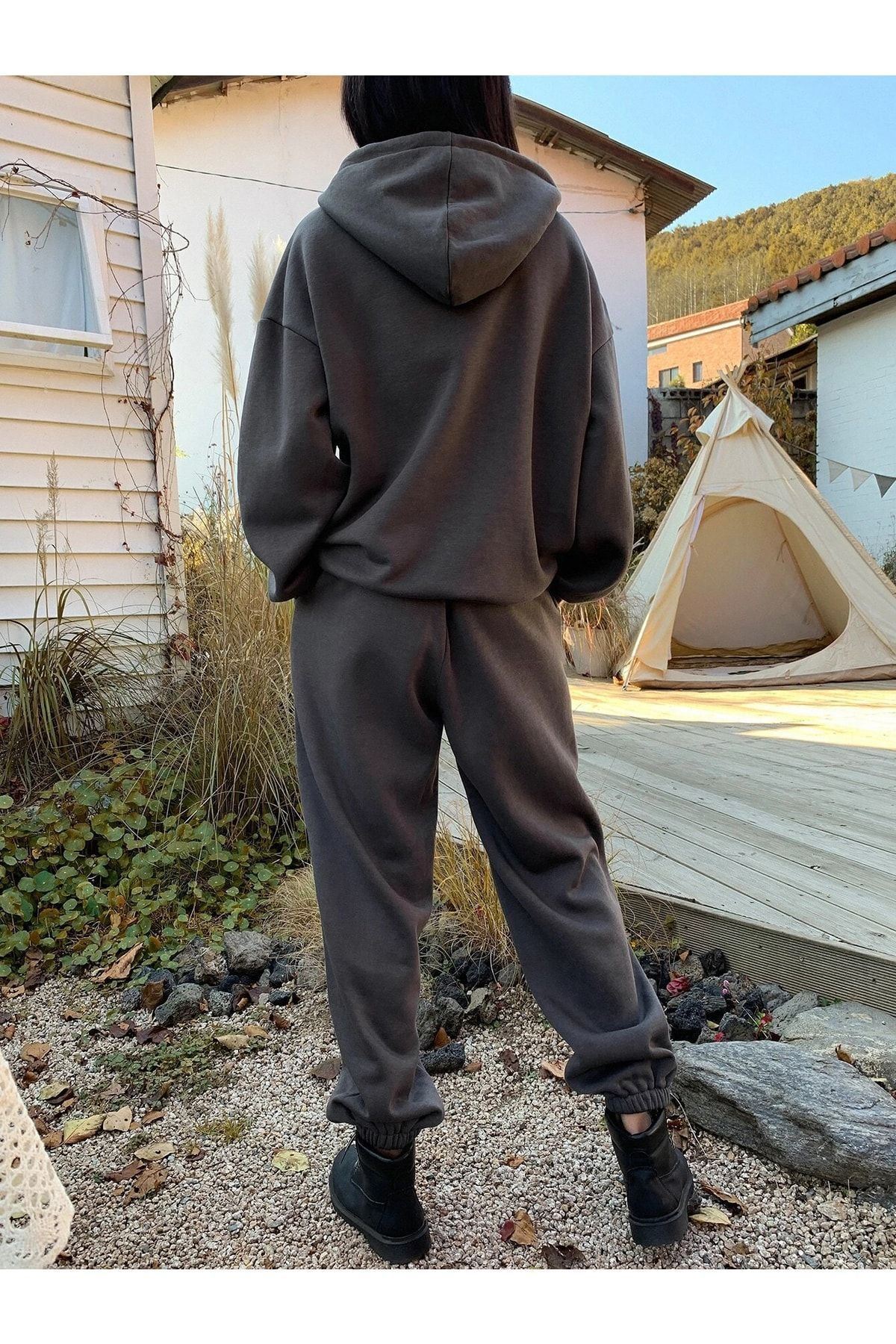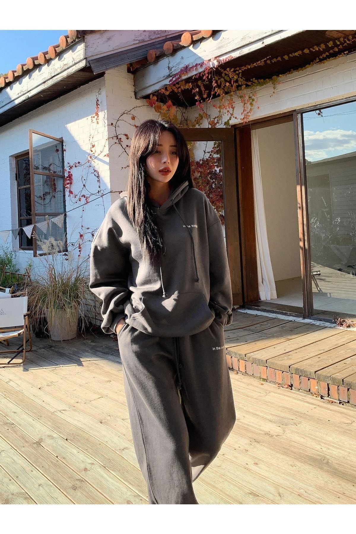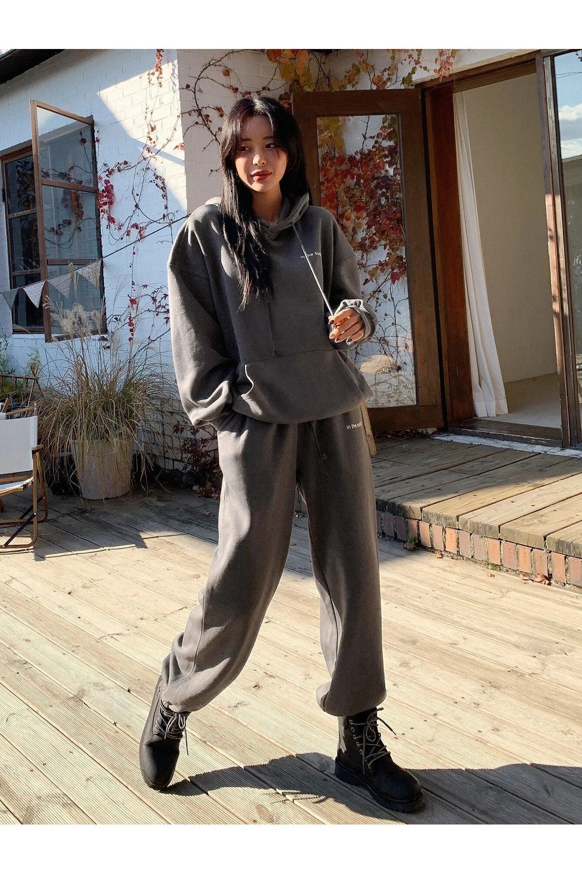 Sunlight Yazılı 2li Sweatshirt Eşofman Altı Jogger- Füme Alt Üst Eşofman Takım Oversize Kapüşonlu