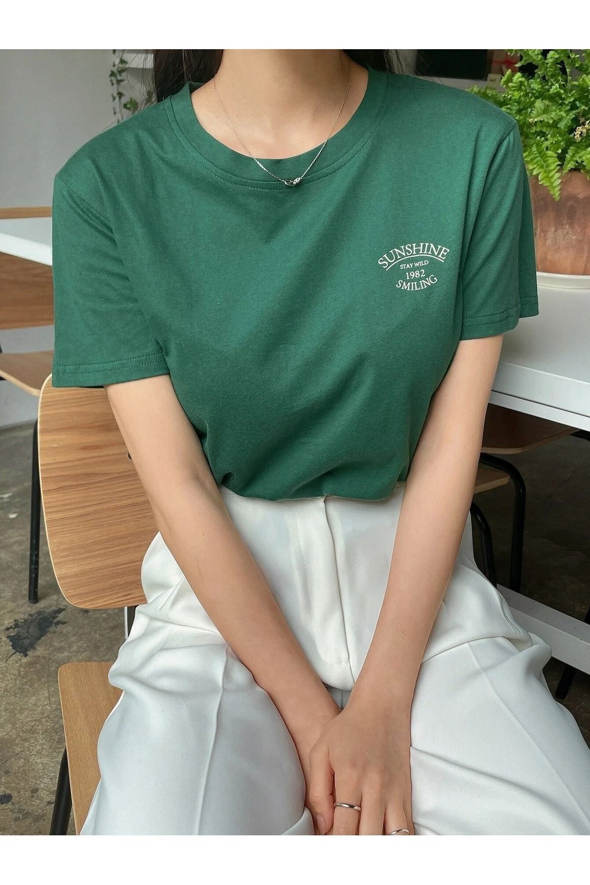 Sunshine 1982 Süprem T-Shirt - Nefti Yeşil Baskılı Oversize Bisiklet Yaka Kısa Kol Tişört