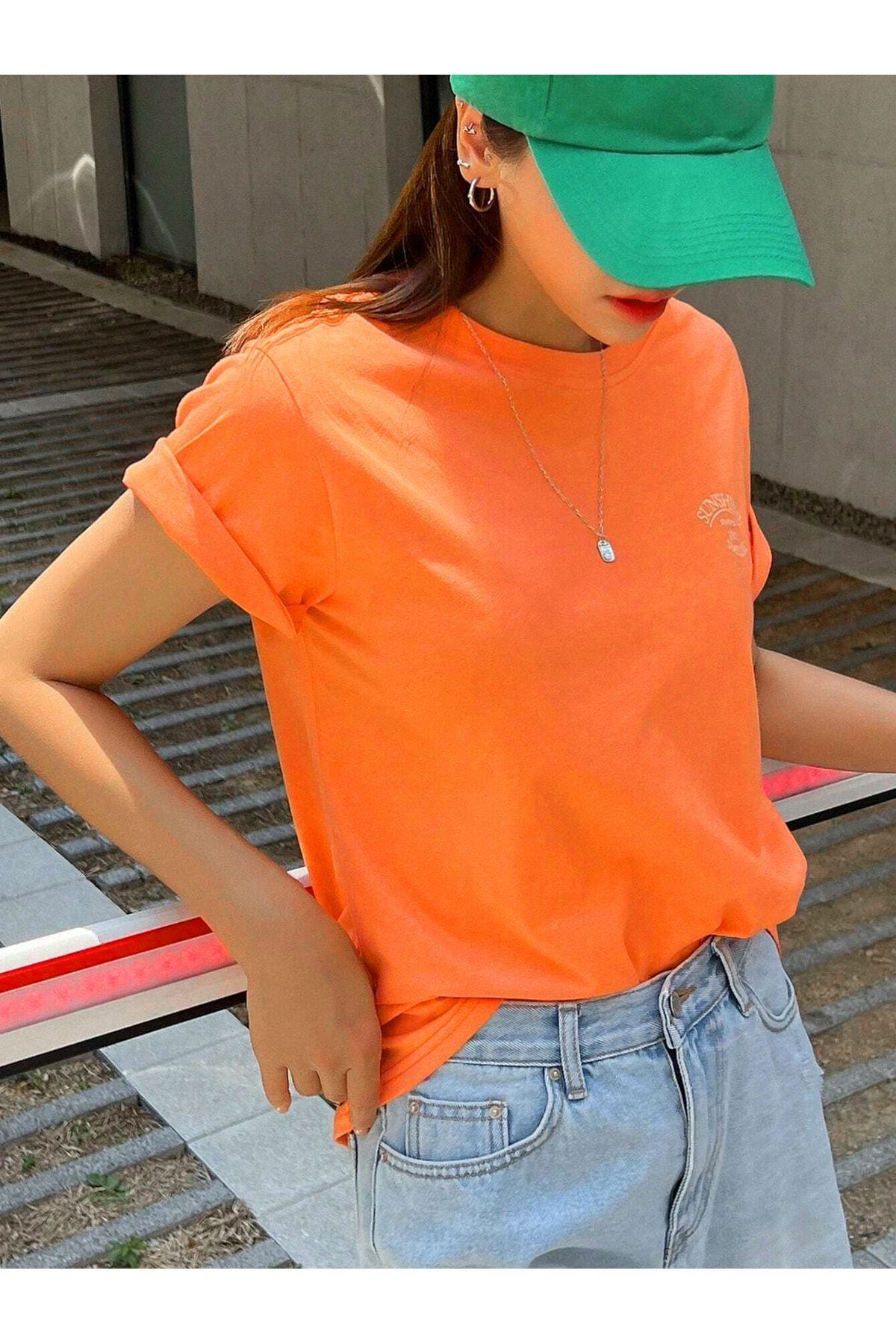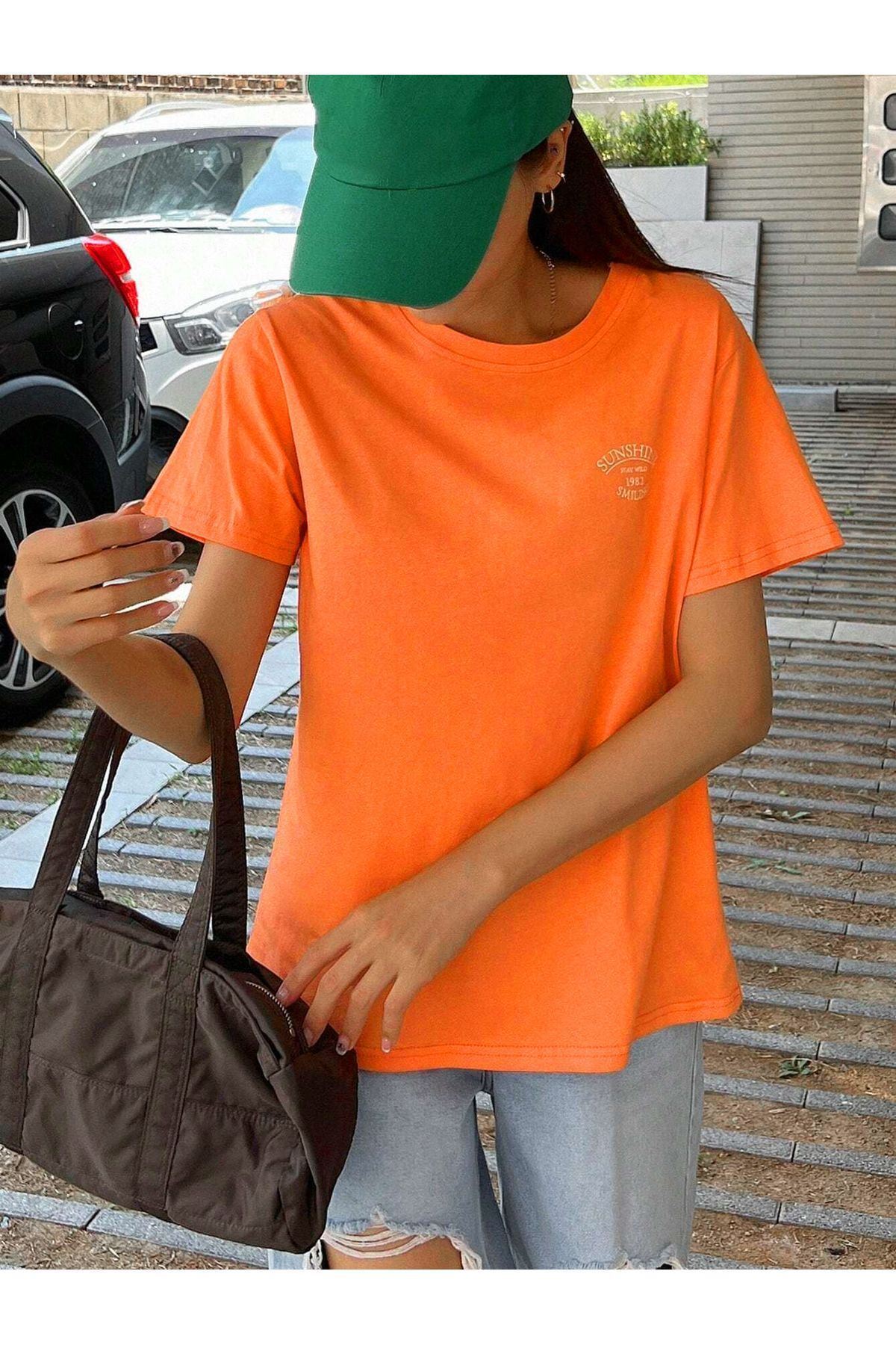 Sunshine 1982 Süprem T-Shirt - Turuncu Baskılı Oversize Bisiklet Yaka Kısa Kol Tişört