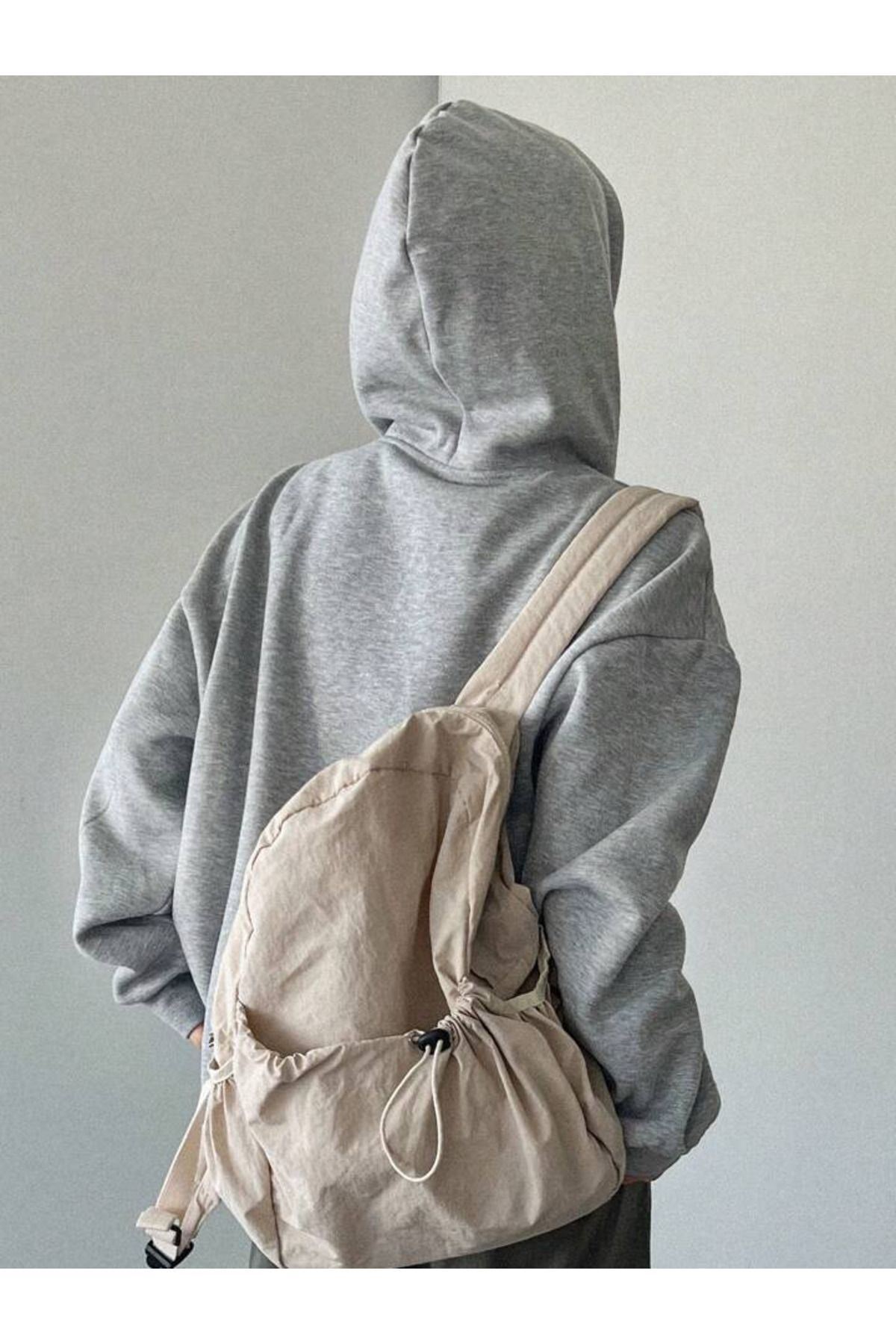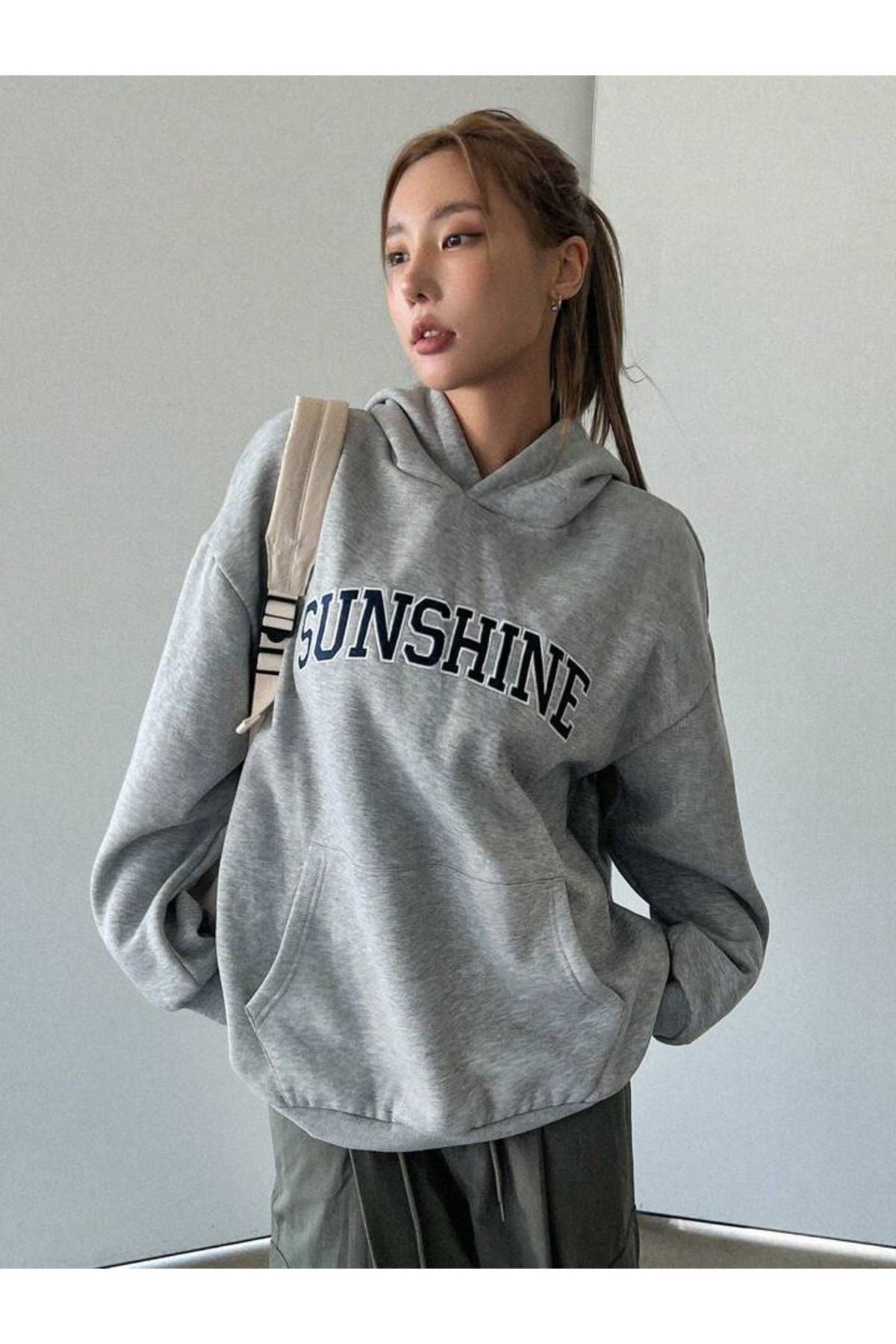 Sunshine Sweatshirt - Gri Oversize Şardonlu Pamuk Kalın Kapüşonlu