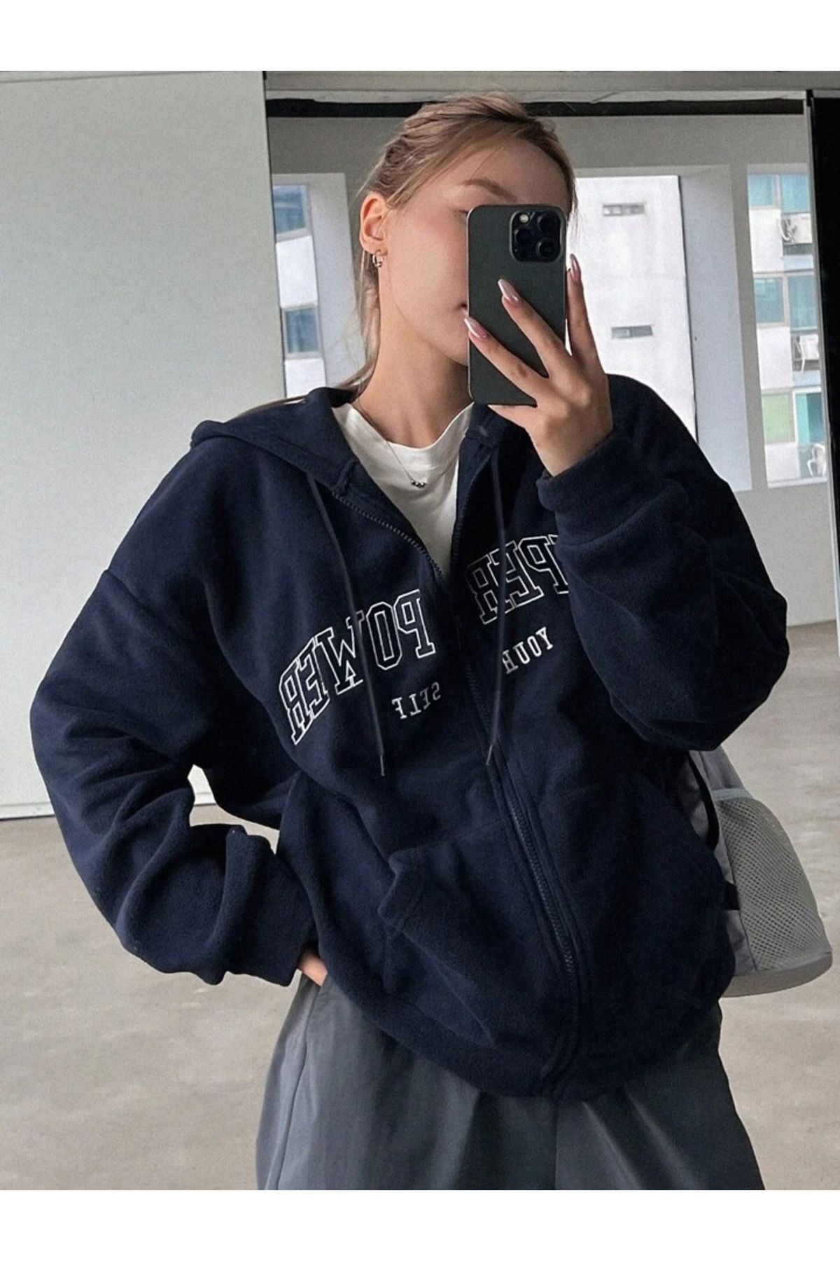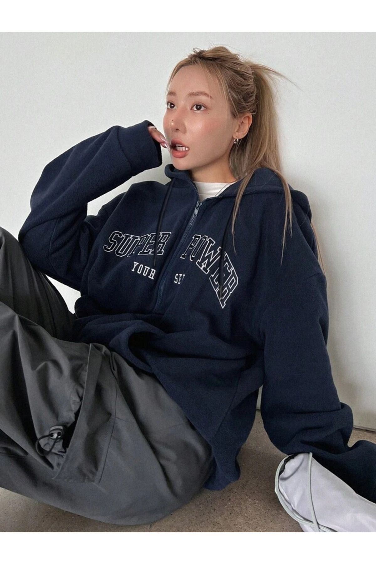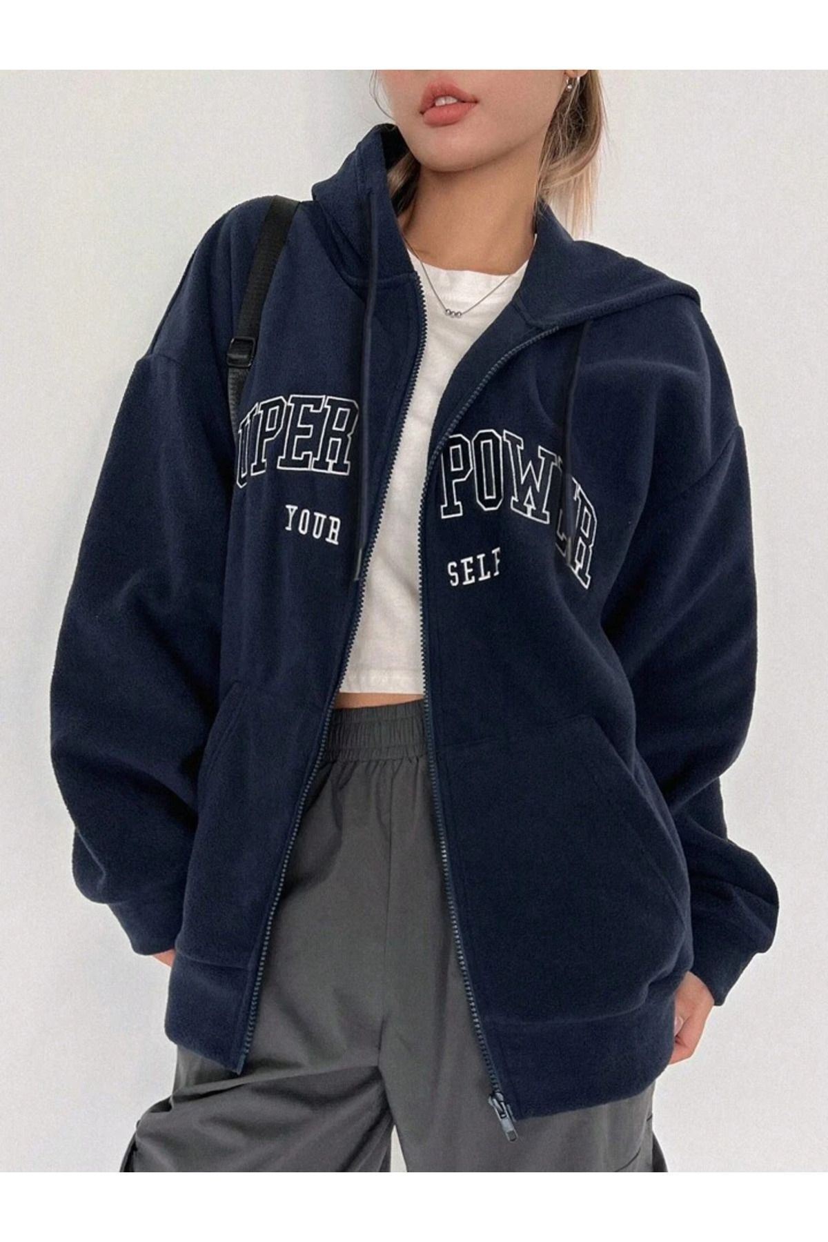 Süper Power Hırka - Lacivert Baskılı Oversize Kapüşonlu