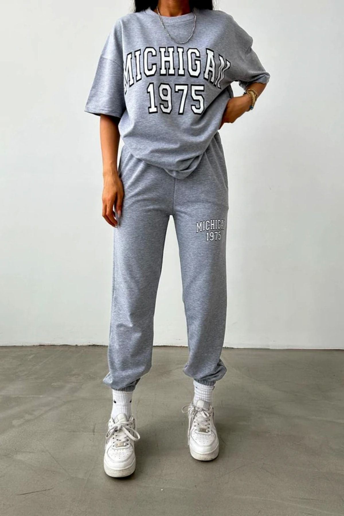 T-shirt Eşofman Altı Jogger- Gri Baskılı Alt Üst Eşofman Takımı Oversize Bisiklet Yaka