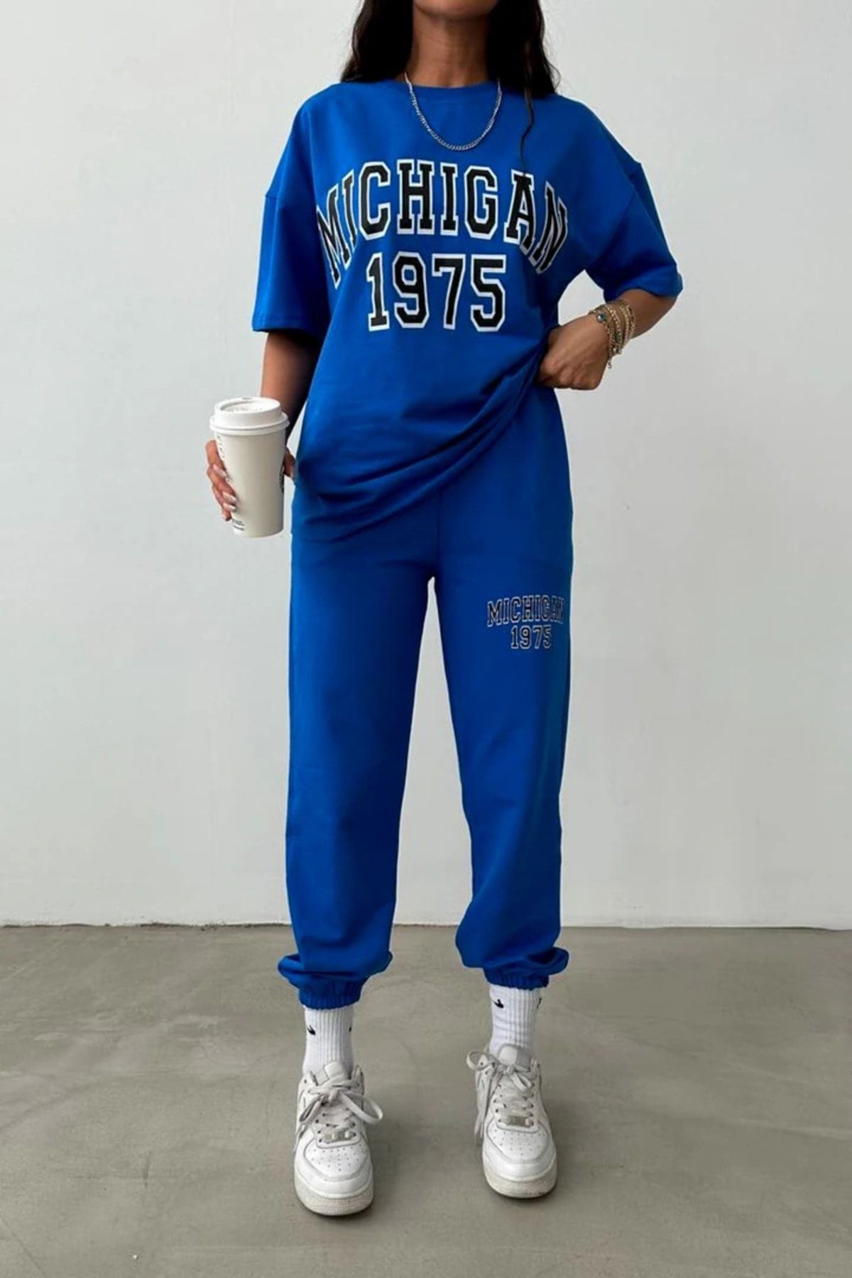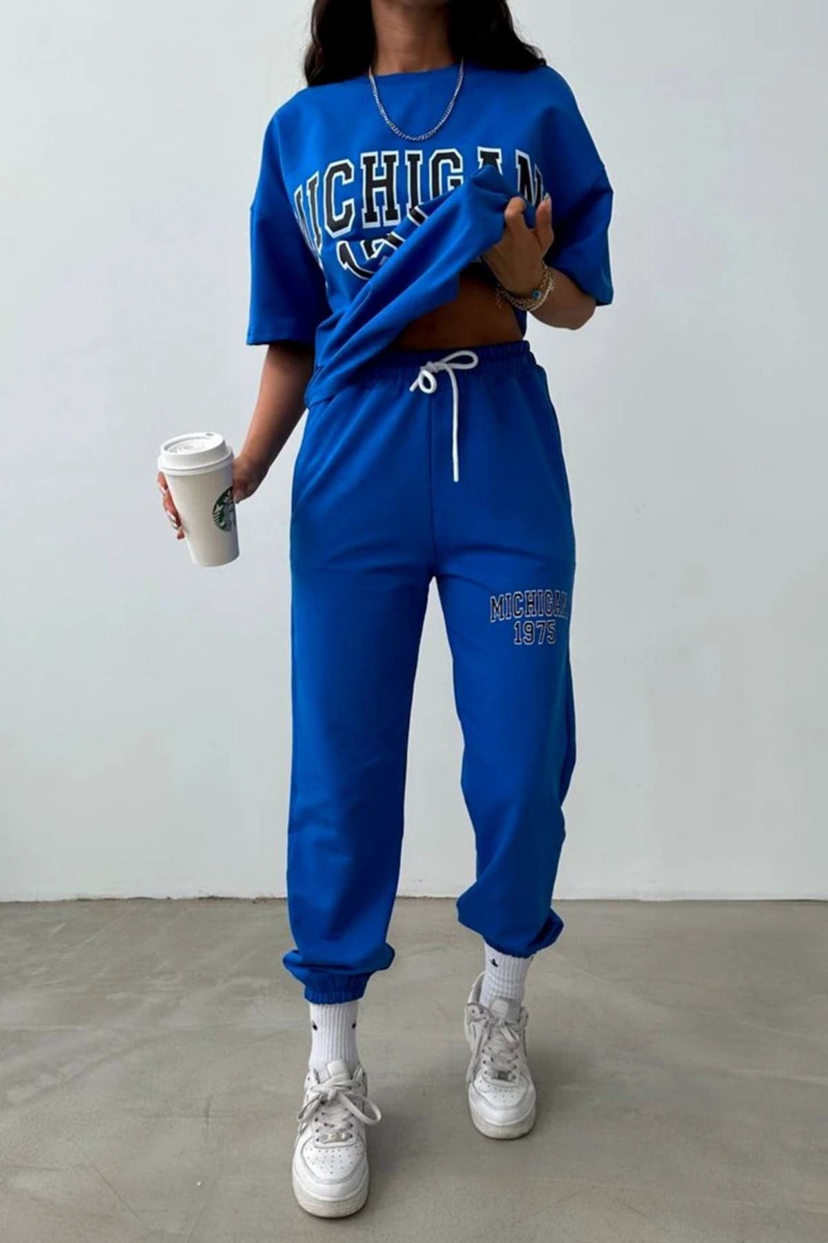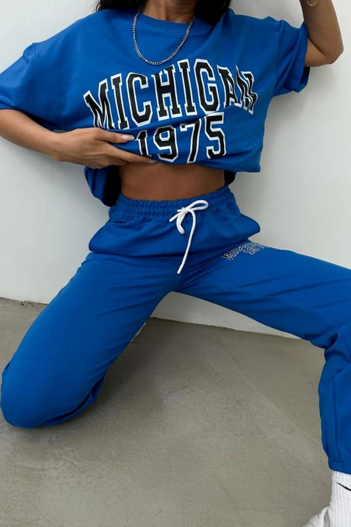 T-shirt Eşofman Altı Jogger- Mavi Baskılı Alt Üst Eşofman Takımı Oversize Bisiklet Yaka