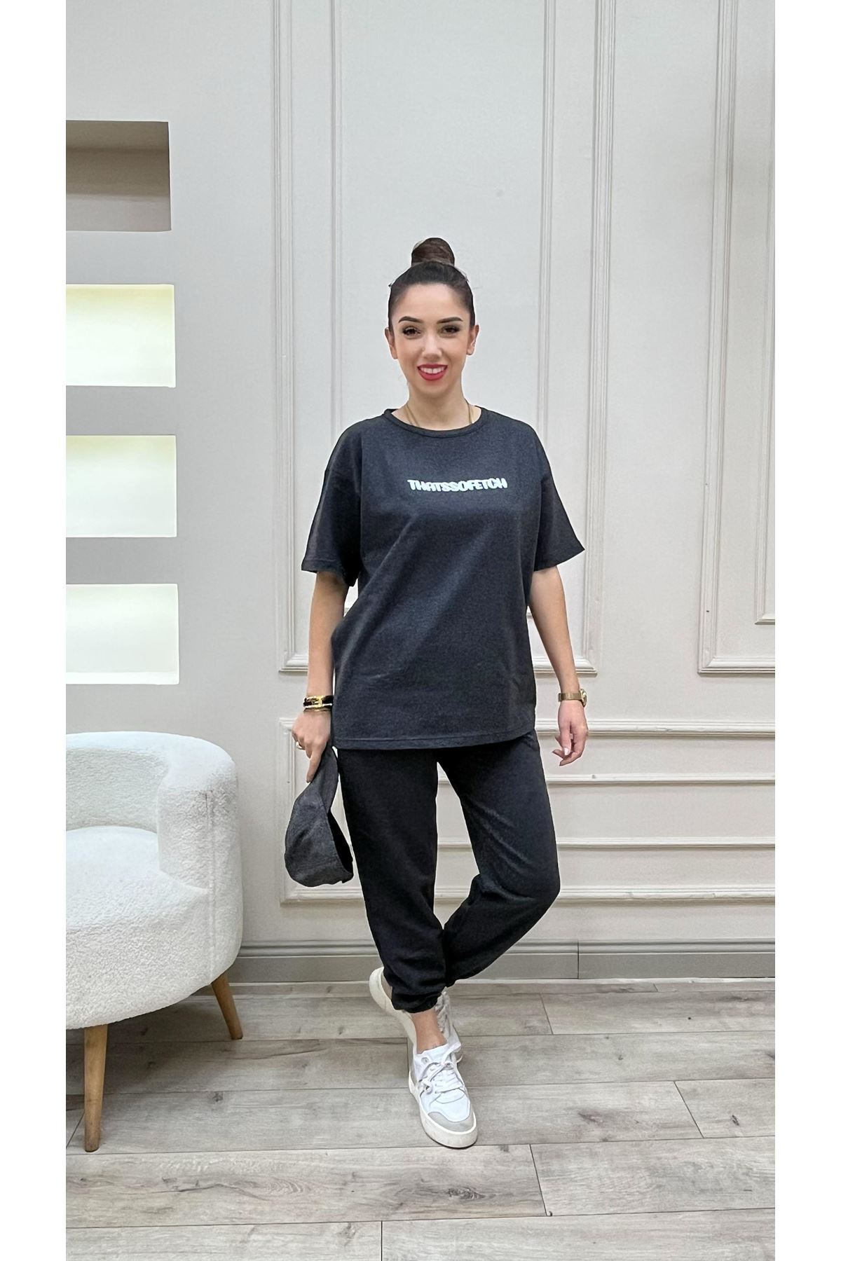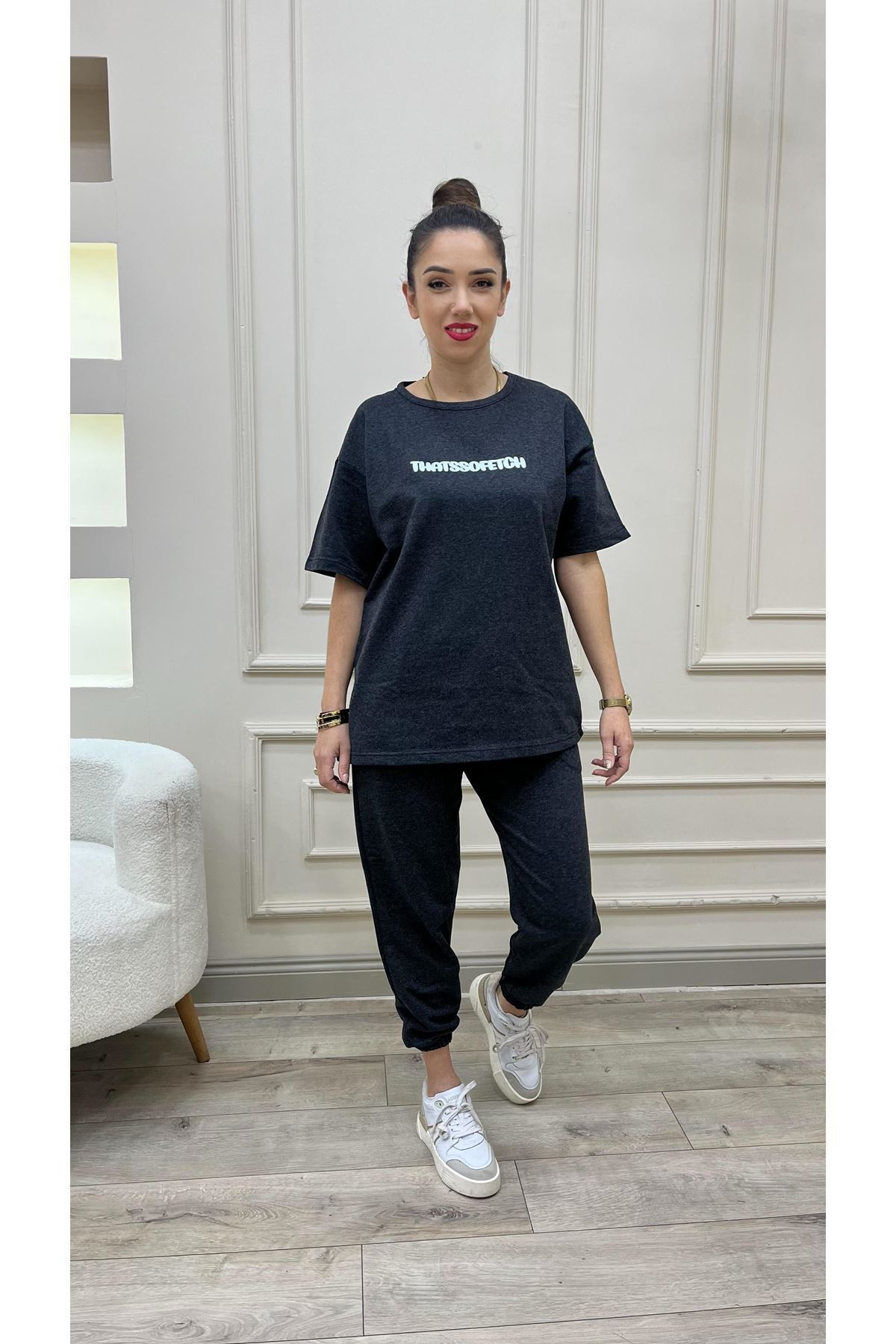 - Rahat kesimi ile günlük kullanım için ideal, oversize t-shirt eşofman altı jogger kombini.; - Antrasit rengin asaletini yansıtan, beyaz baskılı detaylarıyla dikkat çeken tasarım.; - Yüksek kaliteli pamuk polyester karışımı kumaşı sayesinde uzun süreli konfor sunar.; - Pratik lastikli paça tasarımı ile hareket özgürlüğü sağlar.; - Çift cepli yapısı küçük eşyalarınız için kolay erişim imkanı tanır.; - Bisiklet yaka tasarımı modern ve şık bir görünüm kazandırırken rahatlık sunar.; - Unisex koleksiyon parçası olarak hem kadınlar hem de erkekler tarafından tercih edilebilir.; - Dijital baskı teknolojisi ile canlı renklere sahip baskılara sahip olması estetik bir dokunuş katıyor.; - Normal bel yüksekliği ile gün boyu rahatlık sağlar.; - Pamuk polyester karışımından oluşan materyali sayesinde nefes alabilir yapıda olup terletmez.; - Dijital baskı yöntemiyle üretilen desenler canlılığını korurken yıkama sonrasında da ilk günkü gibi kalır.; - Lastikli paça detayı modern bir görünüm sunarken aynı zamanda pratik kullanım imkanları tanır.; - Uzun kol boyu mevsim geçişlerinde ideal koruma sağlar.; - Sürdürülebilirlik bilinciyle tasarlanmış bu ürün çevreye duyarlılık göstermenizi sağlar.; - Ekstra özellik bulunmayan bu takım günlük aktivitelerinizde size eşlik eder.; - %35 pamuk içeriği cildinizle dost dokusuyla konforlu bir deneyim vaat eder.; - 2'li paket içeriği sayesinde hem t-shirt hem de pantolon ihtiyacınızı karşılar.; - Yaz sezonuna uygun hafif yapısıyla sıcak günlerde serin tutar.; - Kısa kollu tasarım yaz ayları için idealdir; rahat hareket etme olanağı tanır.; - Gri tonlarındaki renk seçimiyle kolayca kombinlenebilir ve şık bir görünüm oluşturur.