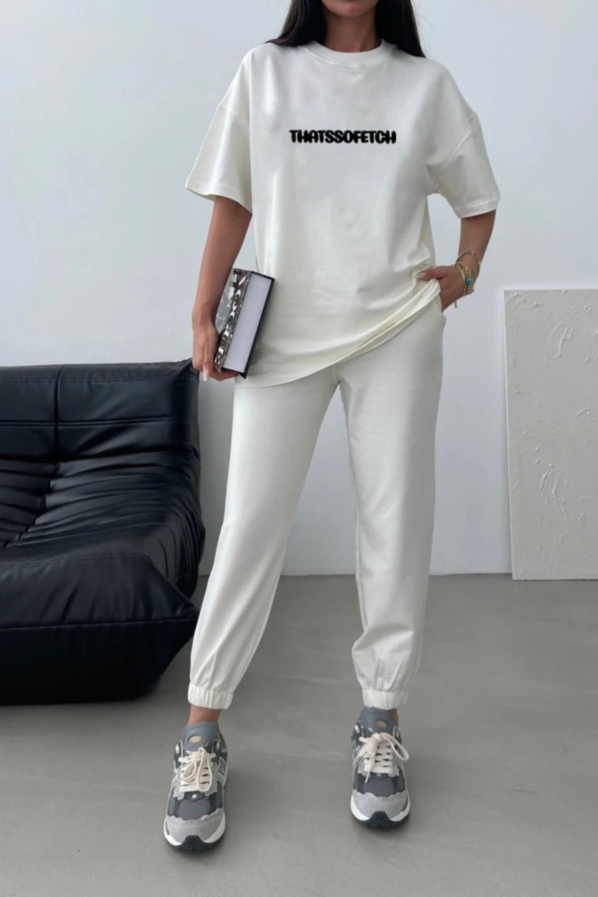 Thatssofetch T-shirt Eşofman Altı Jogger - Beyaz Baskı Alt Üst Eşofman Takımı Oversize Bisiklet Yak