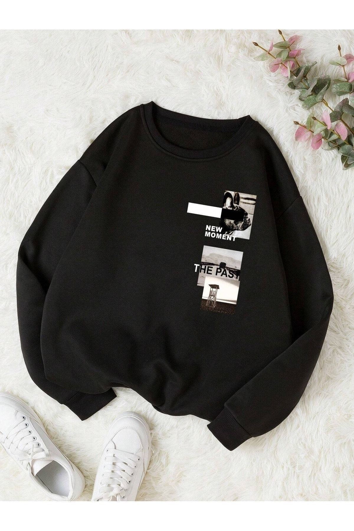 The Past Sweatshirt - Siyah Baskılı Oversize Bisiklet Yaka