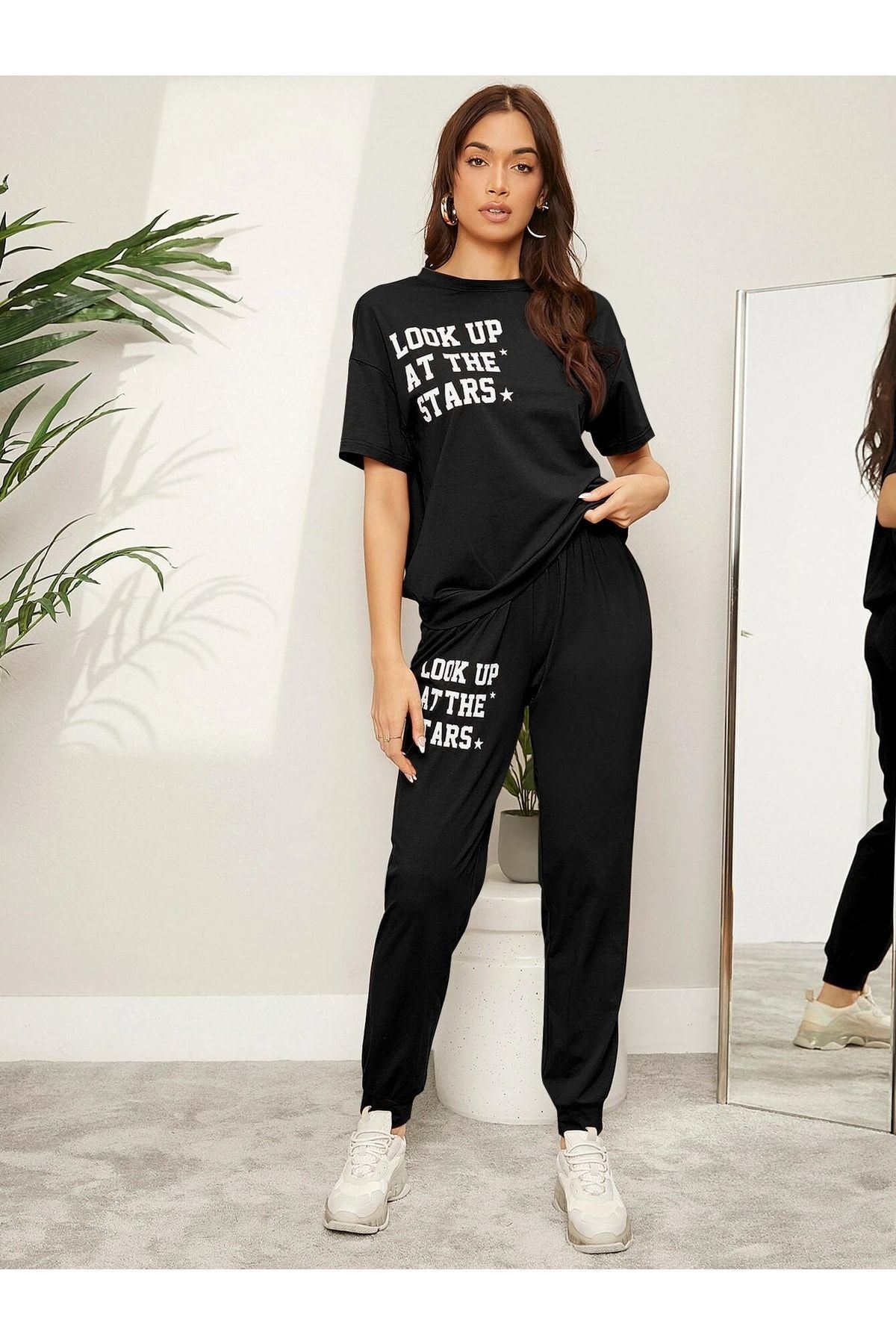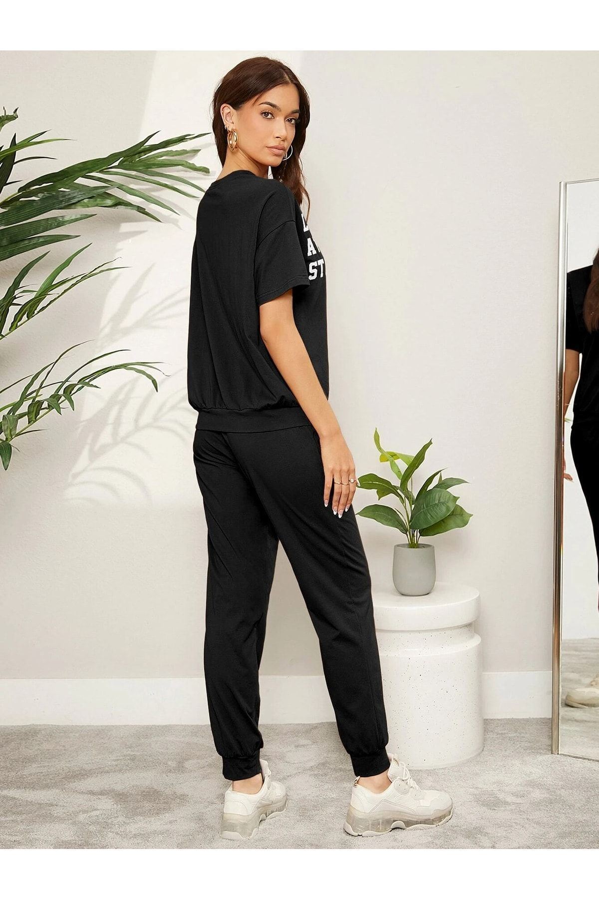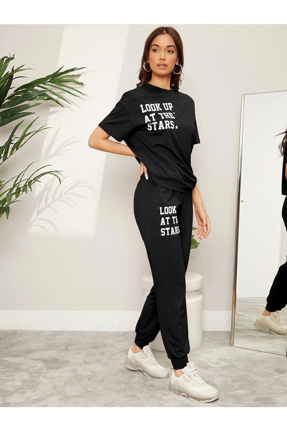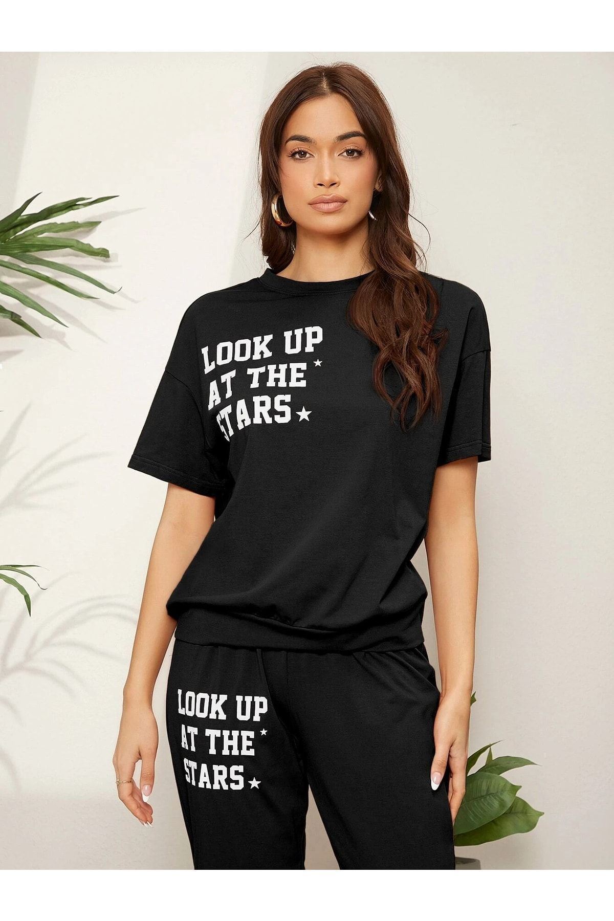 The Stars Ribana 2li T-shirt Eşofman Altı Jogger- Siyah Alt Üst Eşofman Takım Oversize Bisiklet Yak