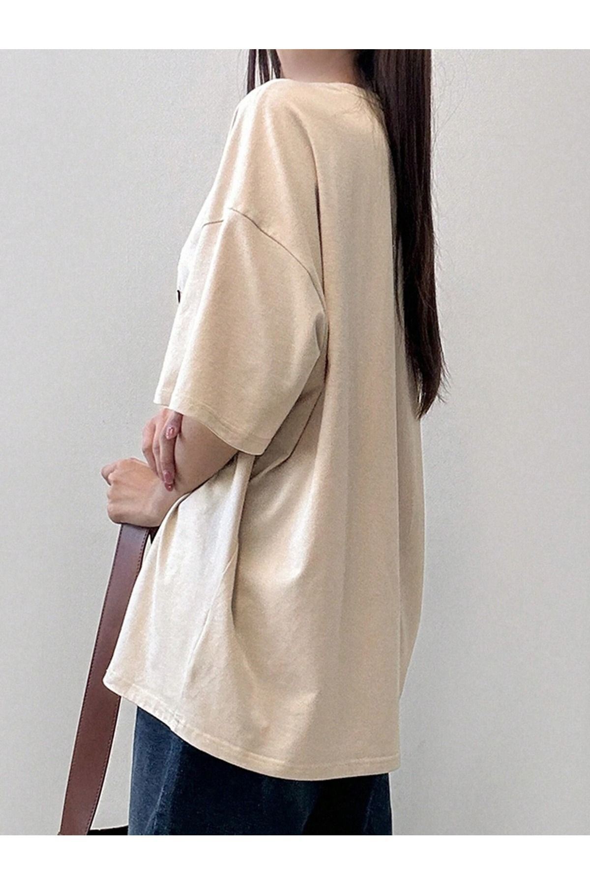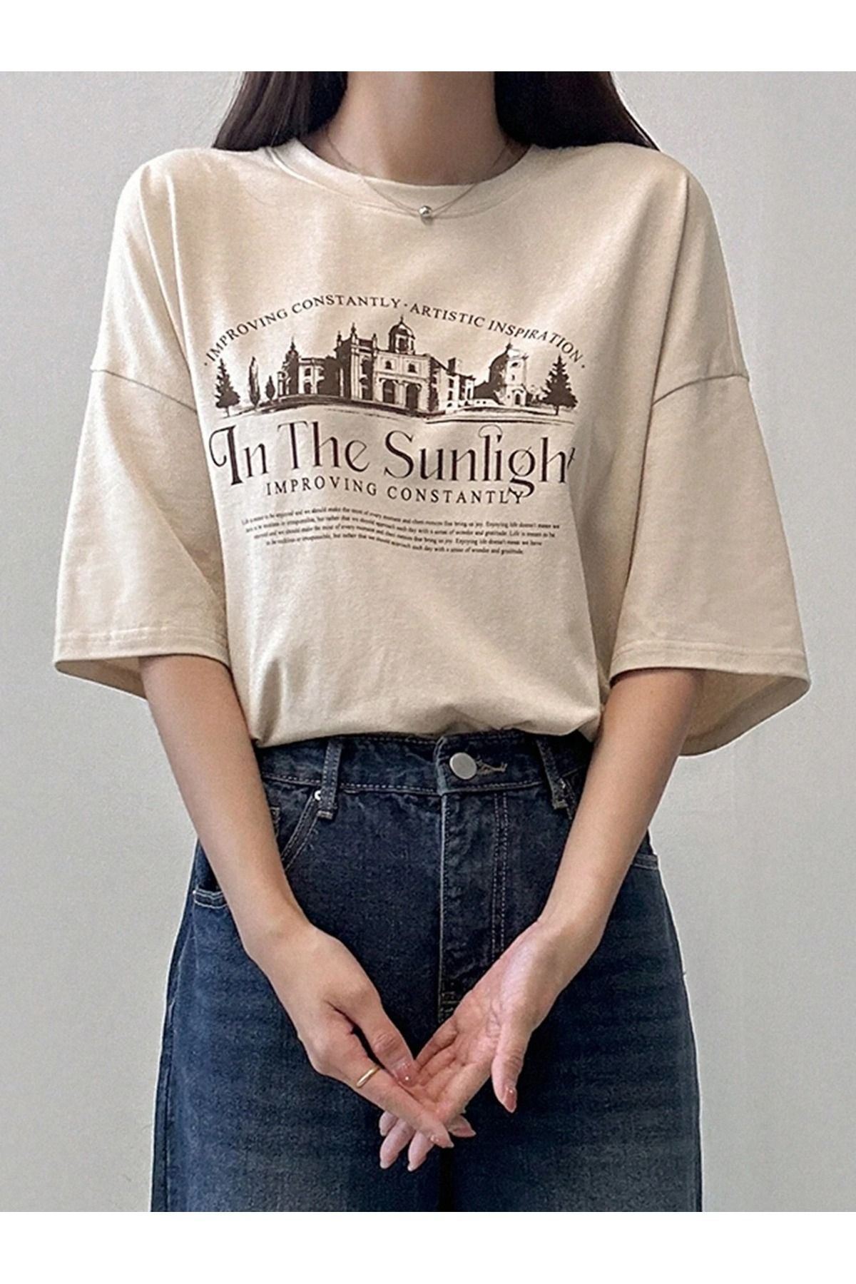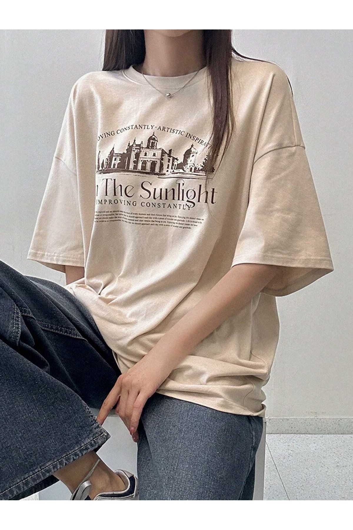 The Sunlight Süprem T-Shirt - Bej Baskılı Oversize Bisiklet Yaka Kısa Kol Tişört