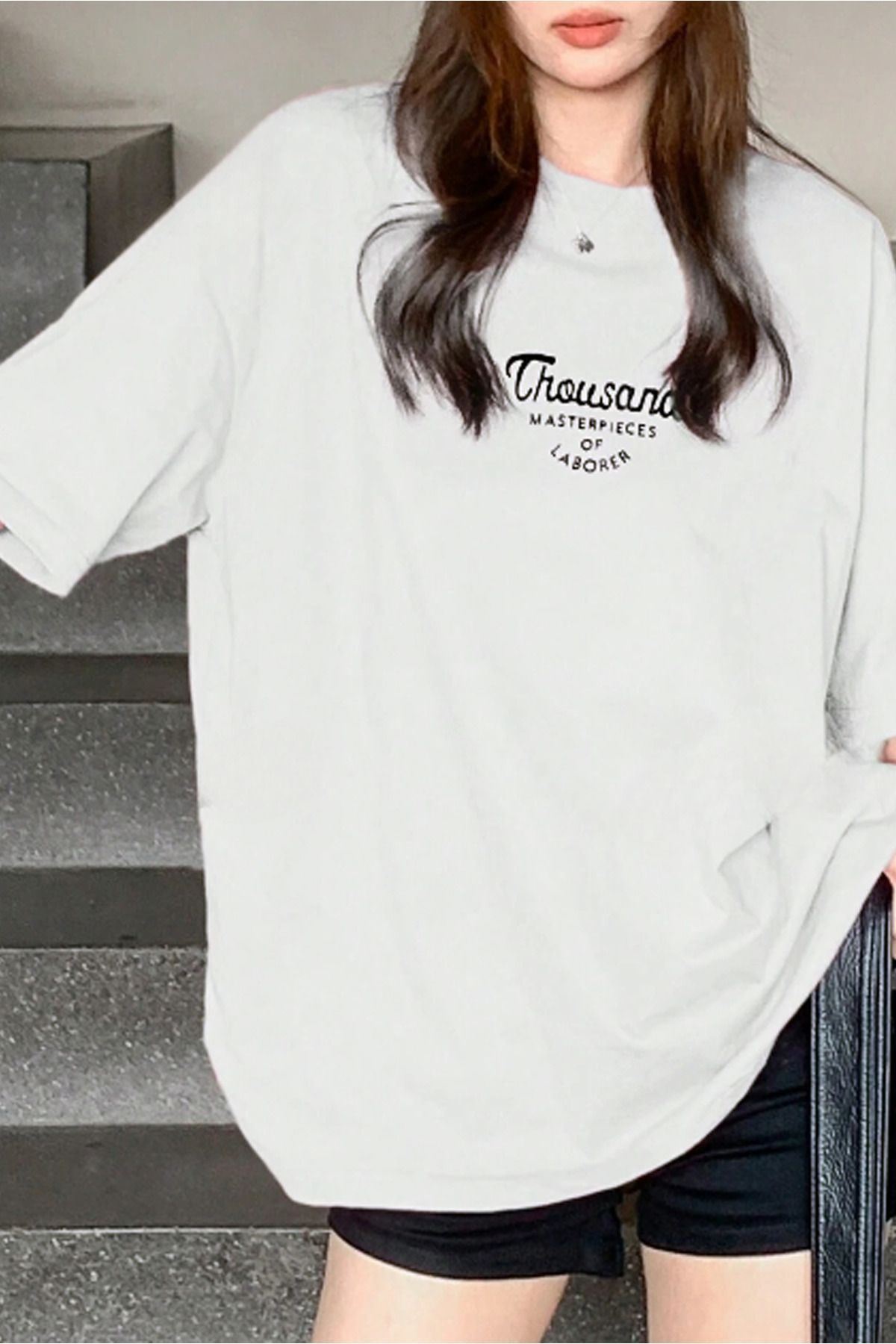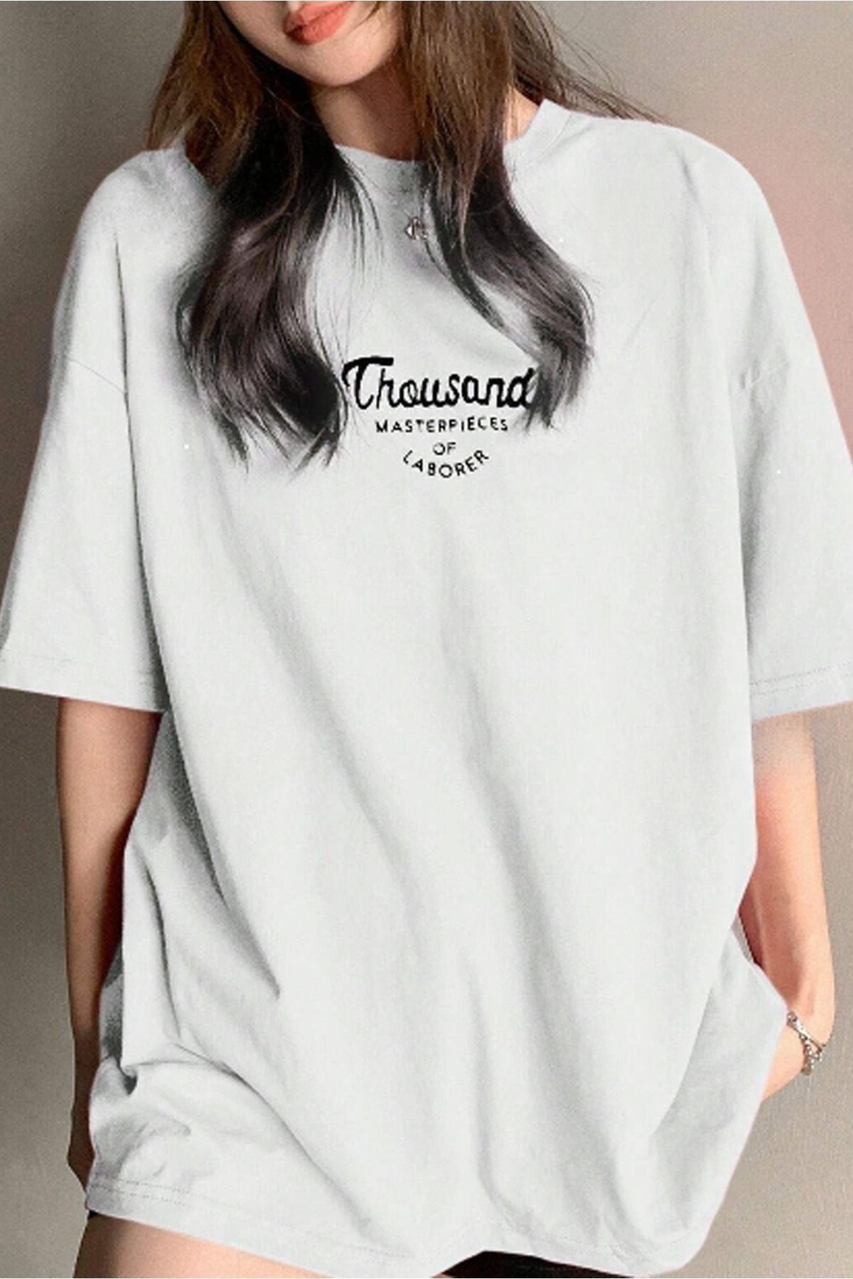 Thousand Süprem T-shirt - Beyaz Baskılı Oversize Bisiklet Yaka Kısa Kol Tişört