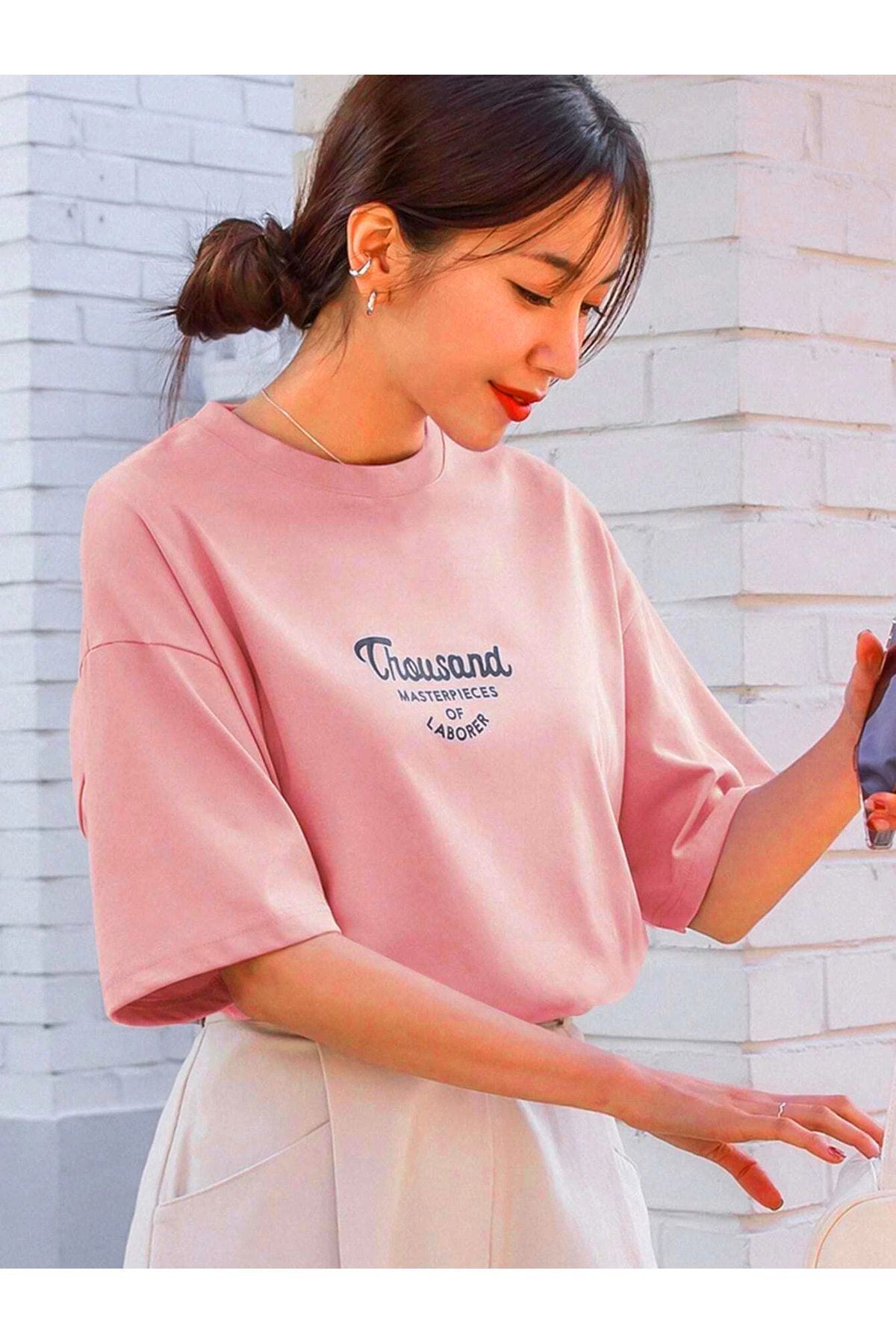Thousand Süprem T-Shirt - Pembe Baskılı Oversize Bisiklet Yaka Kısa Kol Tişört