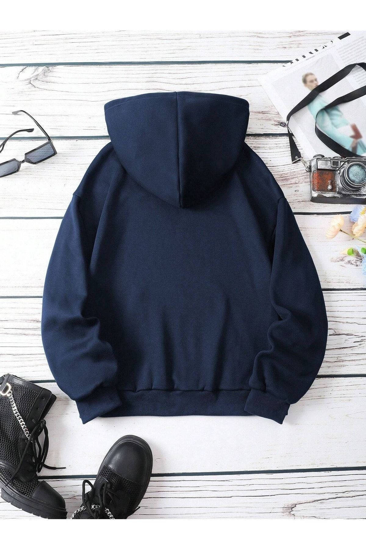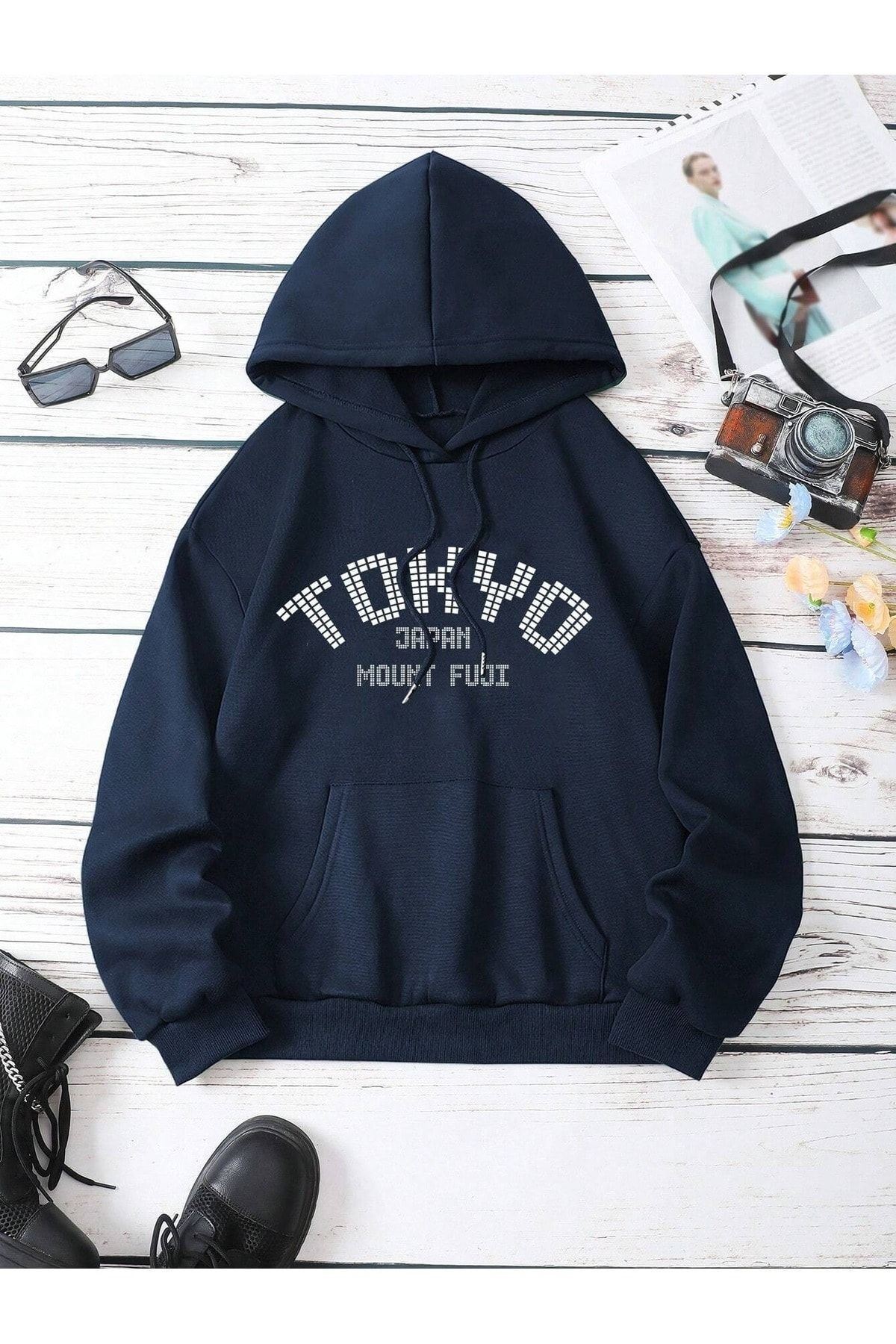 Tokyo Fuji Sweatshirt - Lacivert Baskılı Oversize Kapüşonlu