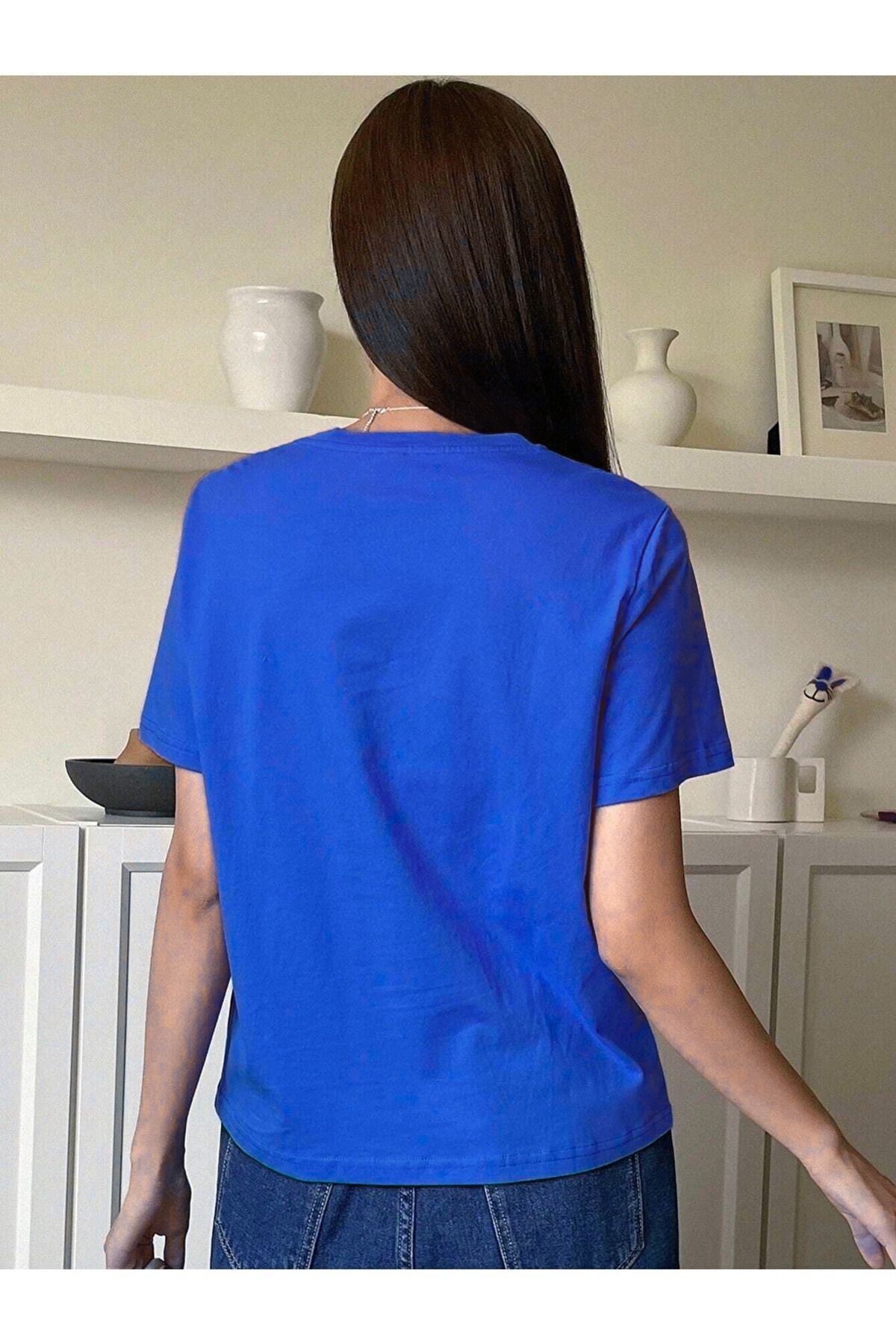 Trendy Oversize Saks Mavi Baskılı T-shirt Unisex Rahat Kalıp - Bisiklet Yaka Kısa Kol Tişört