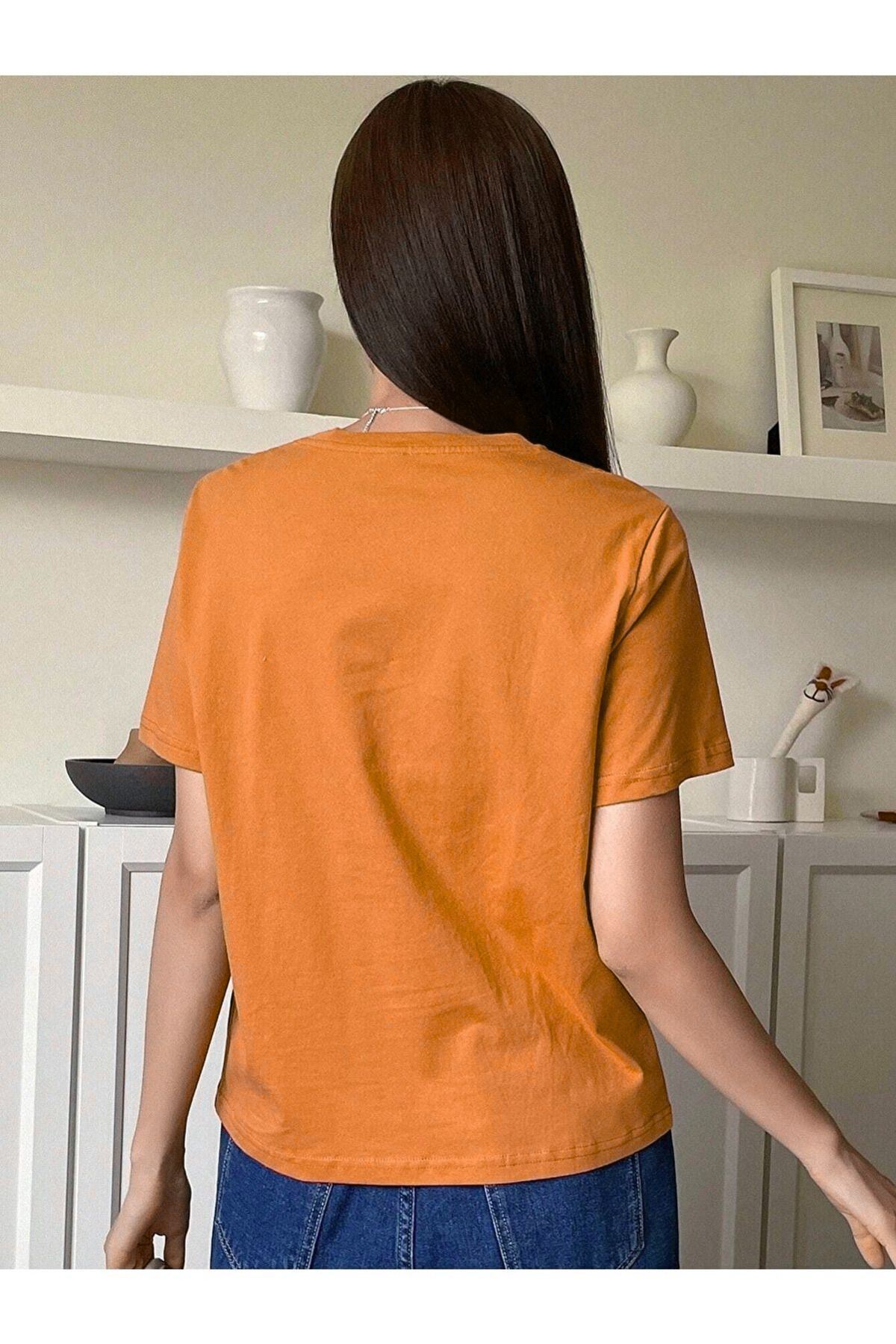 Trendy Oversize Turuncu Baskılı T-shirt Unisex Rahat Kalıp - Bisiklet Yaka Kısa Kol Tişört