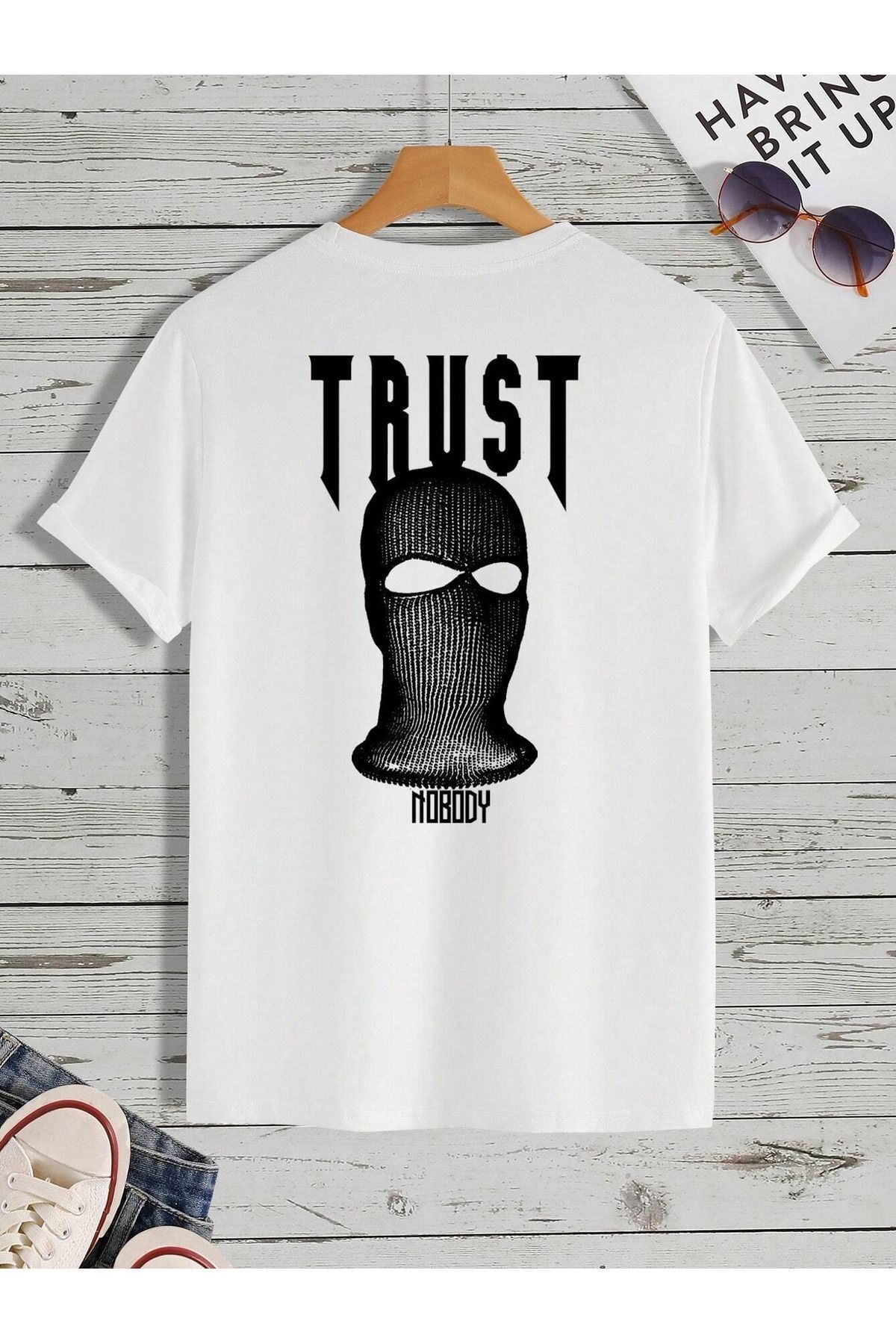 Trust Mast Süprem T-Shirt - Beyaz Baskılı Oversize Bisiklet Yaka Kısa Kol Tişört
