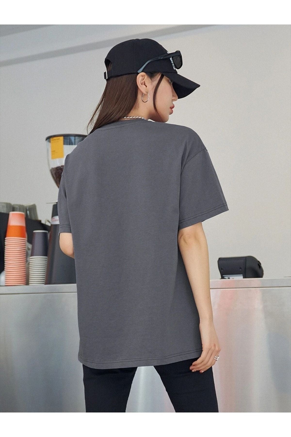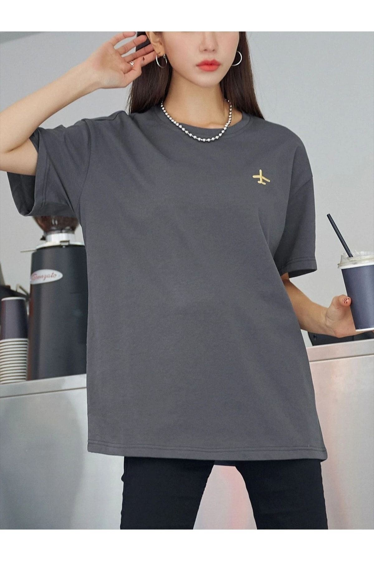 Uçak Logo T-Shirt - Füme Baskılı Oversize Bisiklet Yaka Kısa Kol