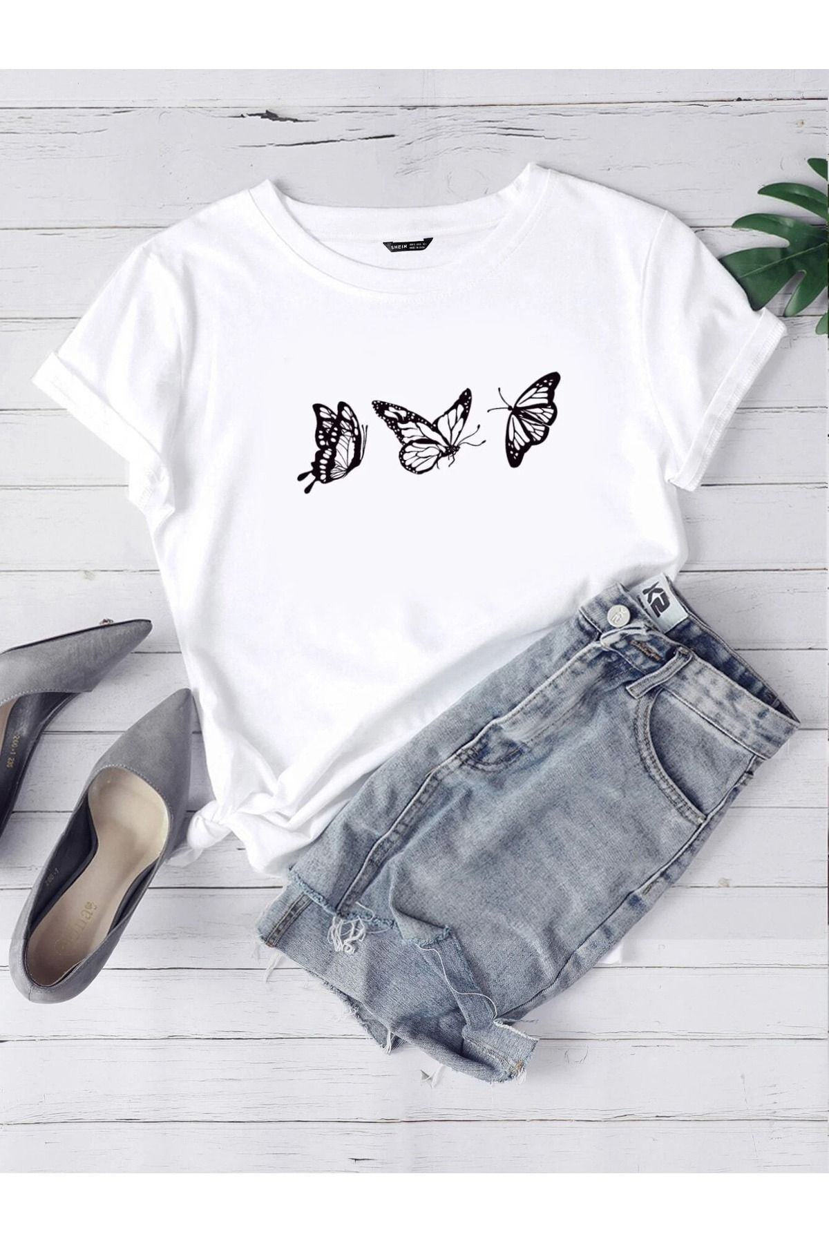 Uçan Kelebekler Süprem T-Shirt - Beyaz Baskılı Oversize Bisiklet Yaka Kısa Kol Tişört