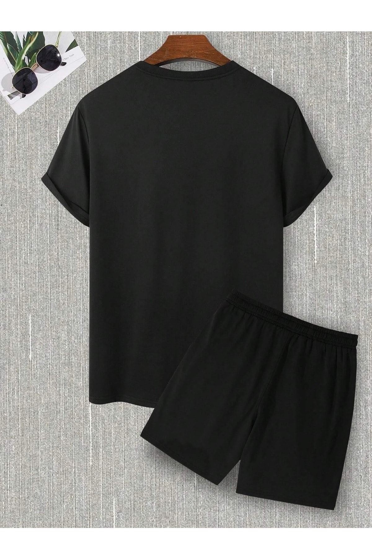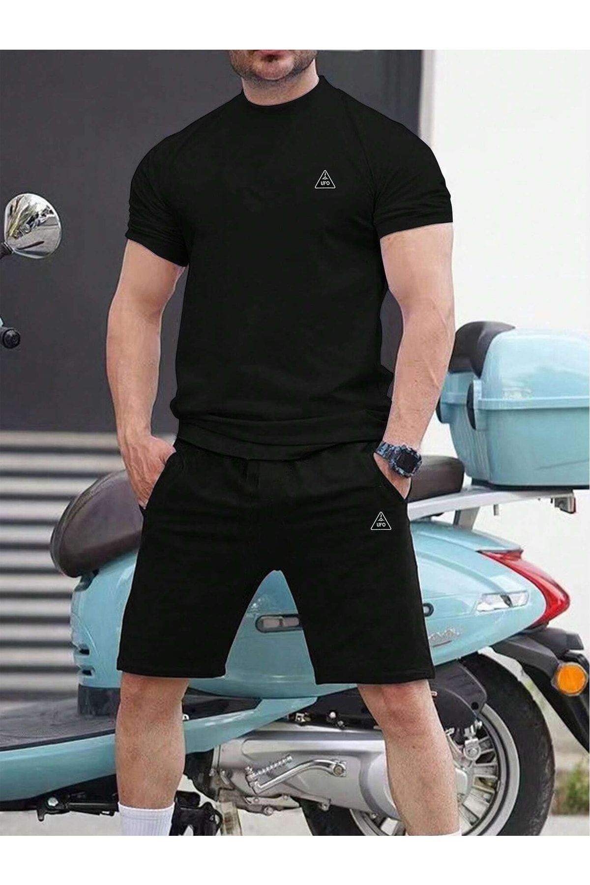 Ufo Logo T-Shirt Şort - Siyah Alt Üst Kombin Şort Tişört Takım Baskılı Oversize Bisiklet Yaka