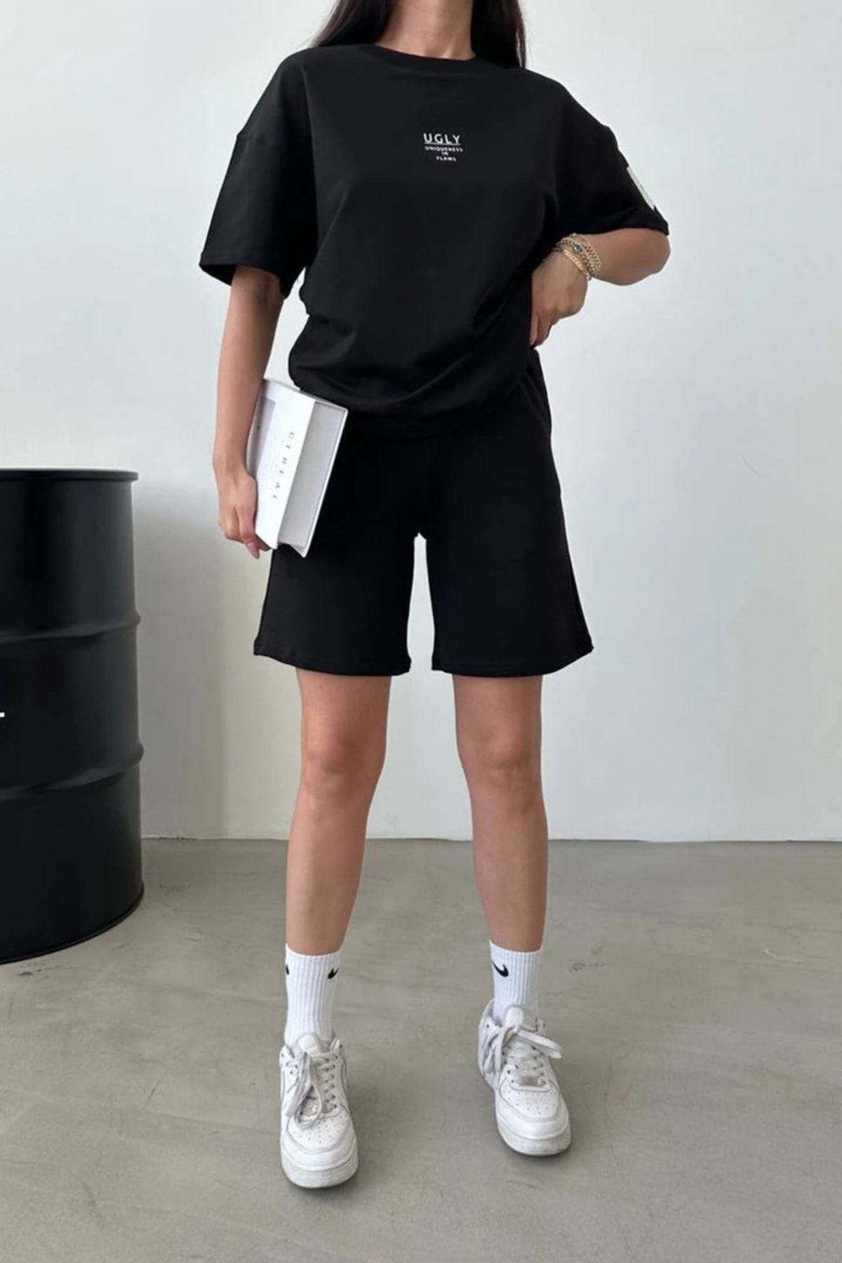 Alt üst şortlu tişört takımlar, Trend, baskılı ve oversize özelliklerini bir arada sunan siyah şort tişört takımı, ince bir kumaşa sahiptir.; Bu sayede, günlük yaşamda rahatlıkla kullanabileceğiniz gibi, sıcak havalarda da bedeninizi serin tutarak rahat edersiniz.; ; Trendy, oversize: sıcak tutan kumaşıyla rahat edin! ; ; Unisex bisiklet yakalı oversize tişörtler şortlar kombinler alt üst takımlar ve eşofman takımları için DUBU BUTİK'i takip etmeyi unutmayın.; ; ; 30 DERECE DE TERSTEN YIKAMA YAPINIZ.; ; ;